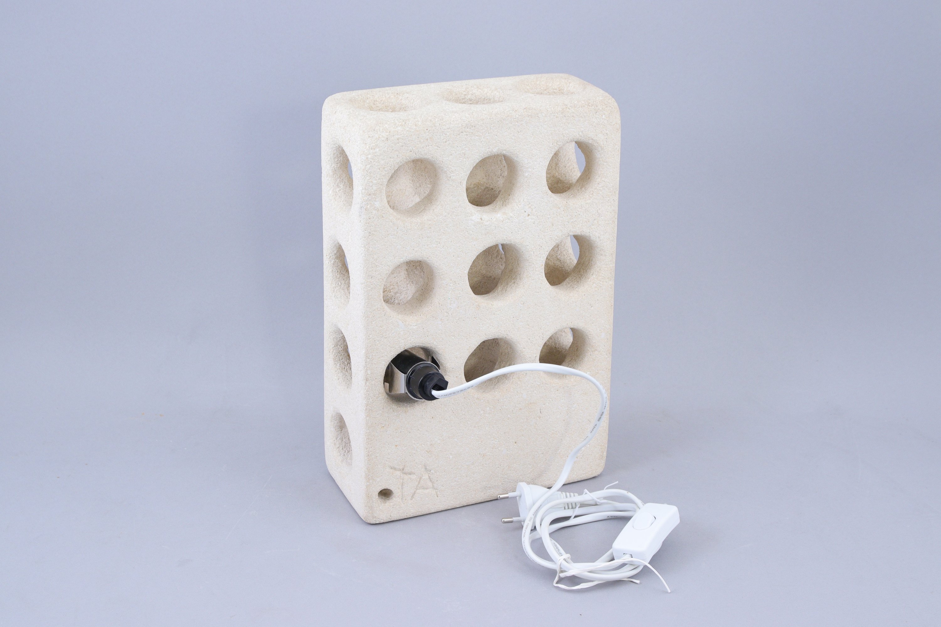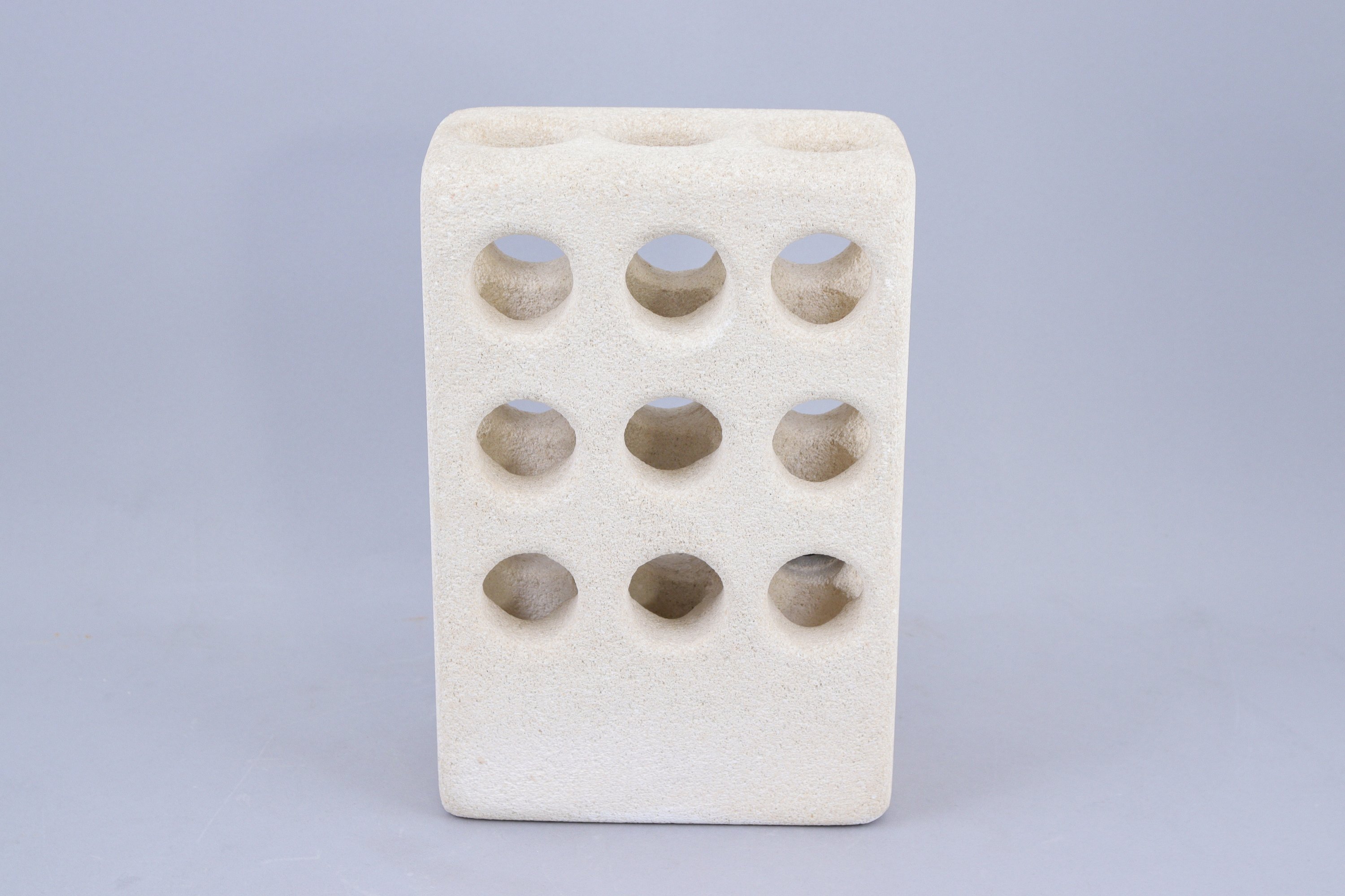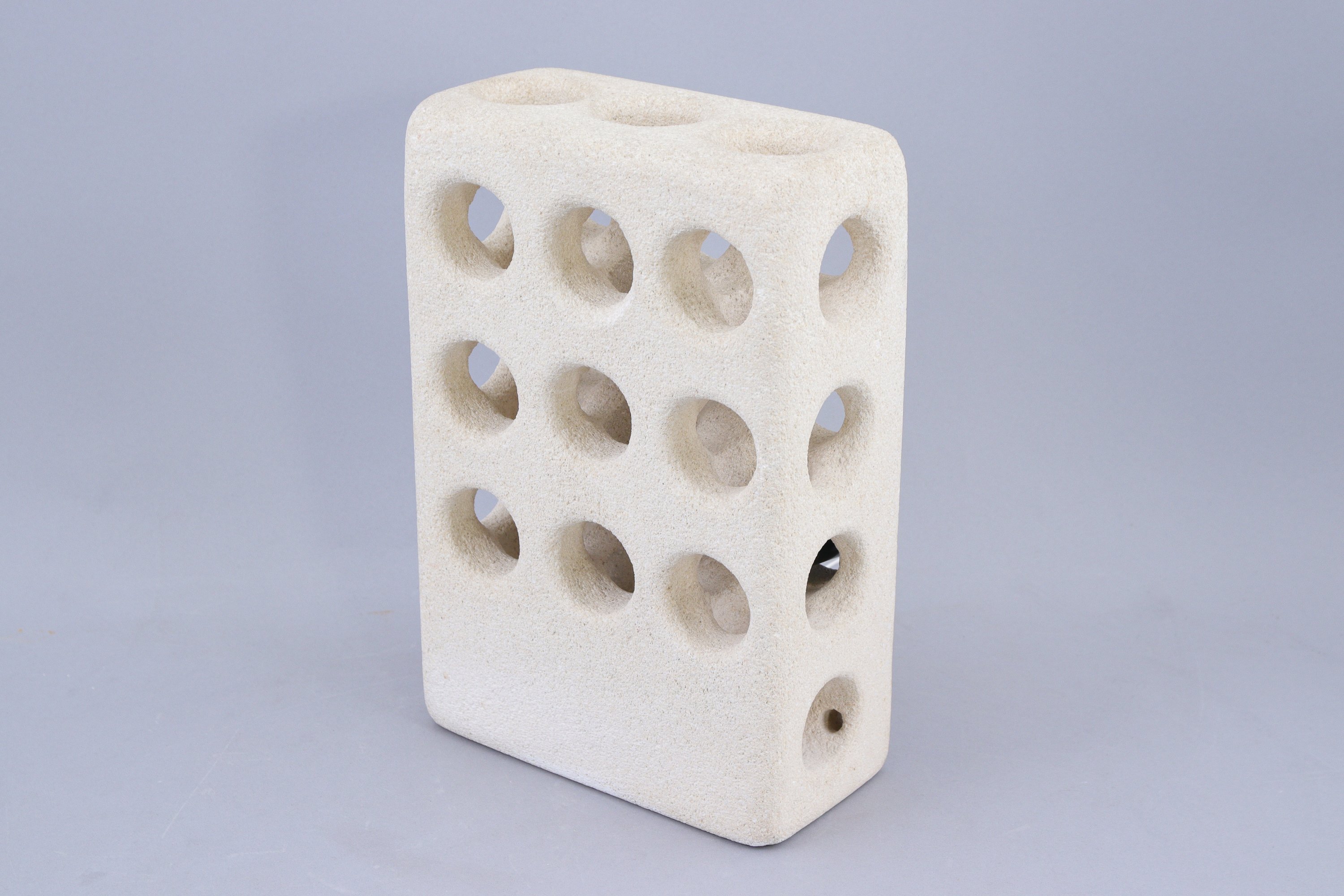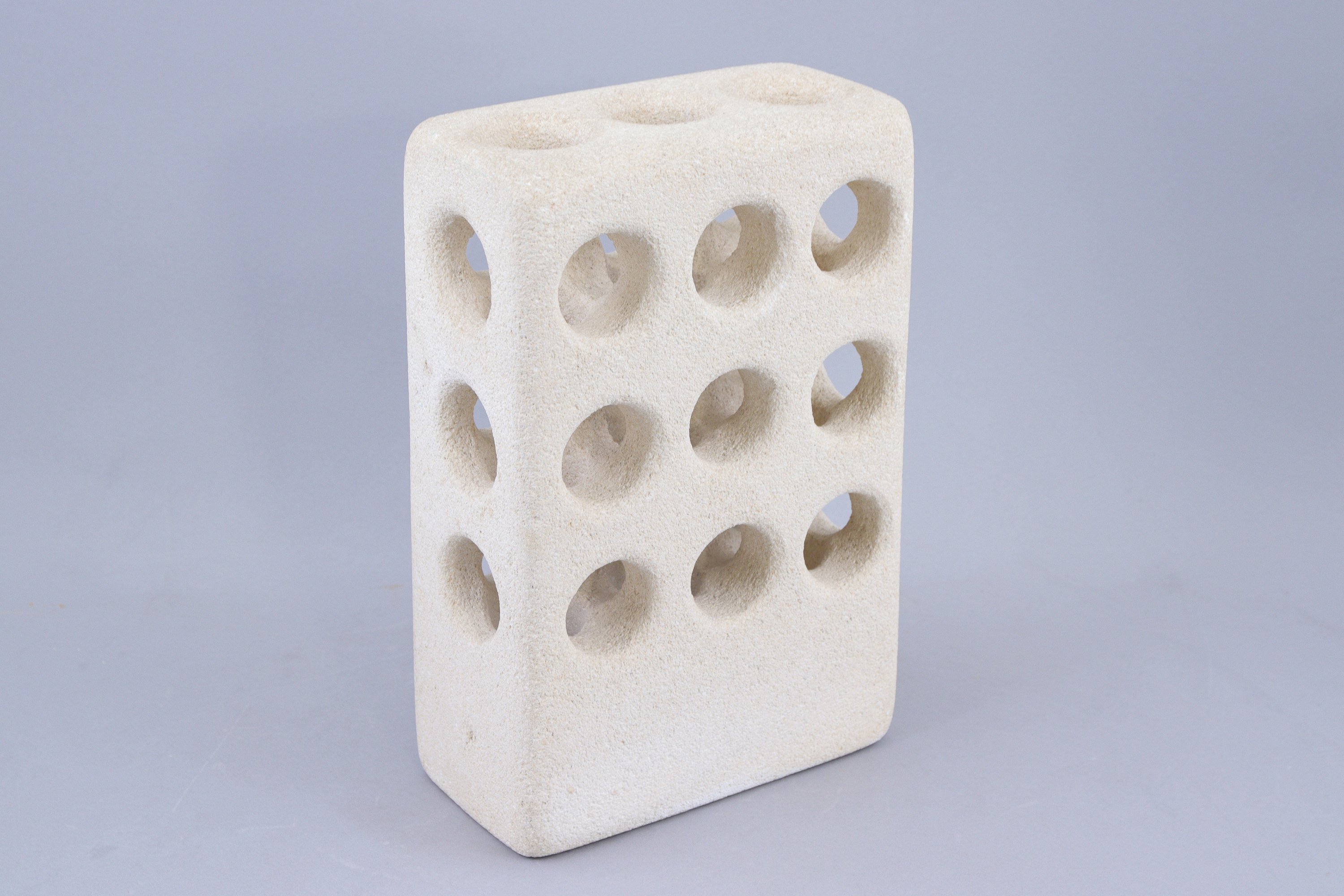 en pierre de forme parallélépipédique à 9 trous circulaires.