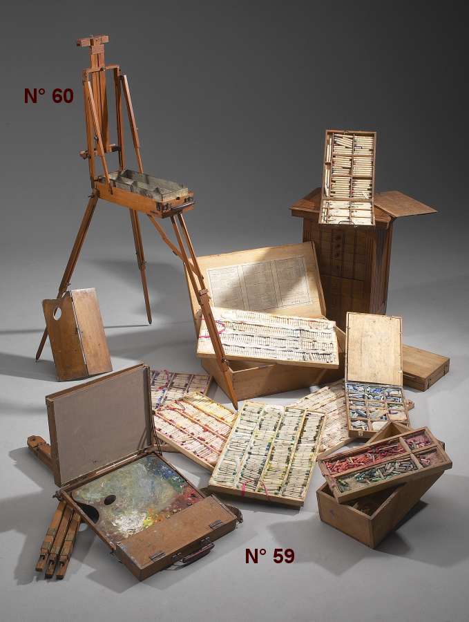 CHEVALET de CAMPAGNE, en bois naturel, pliant en plan. Contient une boîte de peinture en tôle et une palette pliante en bois. Marque "INNOVA".