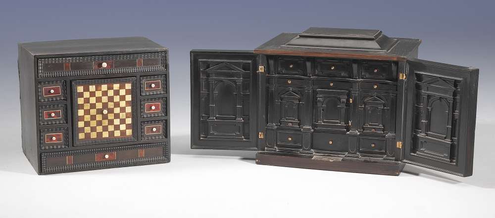 CABINET en ébène et bois noirci, marqueterie d'écaille, bois exotique, ivoire-os. Il présente un grand tiroir à damiers encadré par deux séries de trois petits tiroirs et il ouvre à un large tiroir inférieur reposant sur un tiroir.