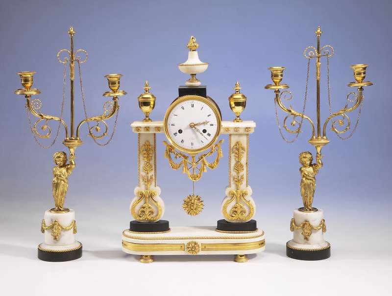 PENDULE PORTIQUE en marbre noir et blanc. Belle ornementation de bronzes dorés et ciselés : perles, feuillage, trophée.