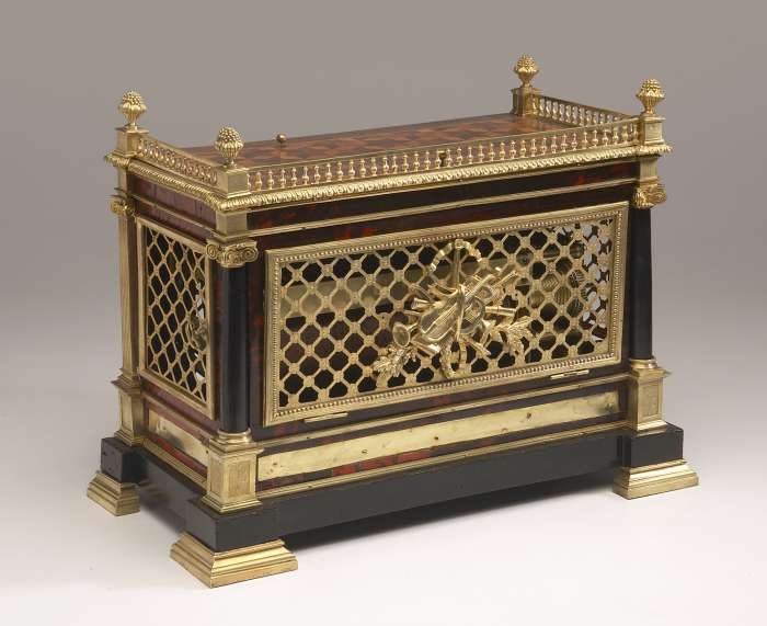 La caisse est à rapprocher d'un coffret vitrine Louis XVI estampillé de Bernard MOLITOR en acajou orné de bronzes, de colonnes détachées en ébène. Référence "Le mobilier français du XVIIIème siècle", par P. Kjellberg, Éd. de l'Amateur, p. 627, reproduction.