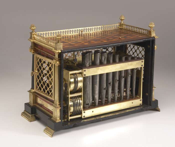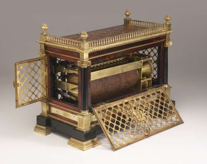 MUSIQUE DE PENDULE à rouleau ou BOÎTE À MUSIQUE à jeu d'orgues présentée dans un coffret en placage d'écaille de tortue et de marqueterie de cubes. Flanquée de colonnes en bronze doré à méplats et en façade deux colonnes en bois noir. Riche ornementation en bronze ciselé : portes grillagées ornées d'attributs de musique, galerie à balustre, chapiteaux, base et pieds.