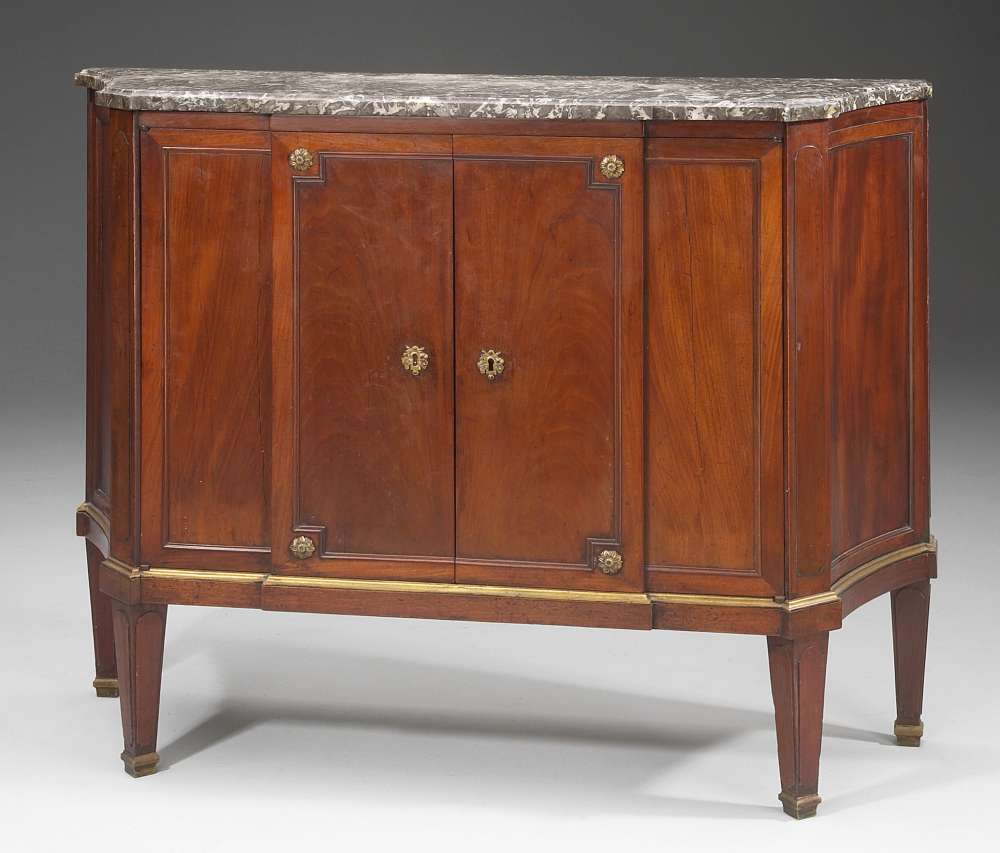 MEUBLE À HAUTEUR D'APPUI en acajou et placage d'acajou, de forme trapézoïdale, à léger ressaut central et à côtés concaves. Il ouvre à deux battants. Ornementation en bronze doré : moulures, motifs floraux, entrées de serrure et sabots. Pieds gaines. Dessus de marbre gris Sainte-Anne.