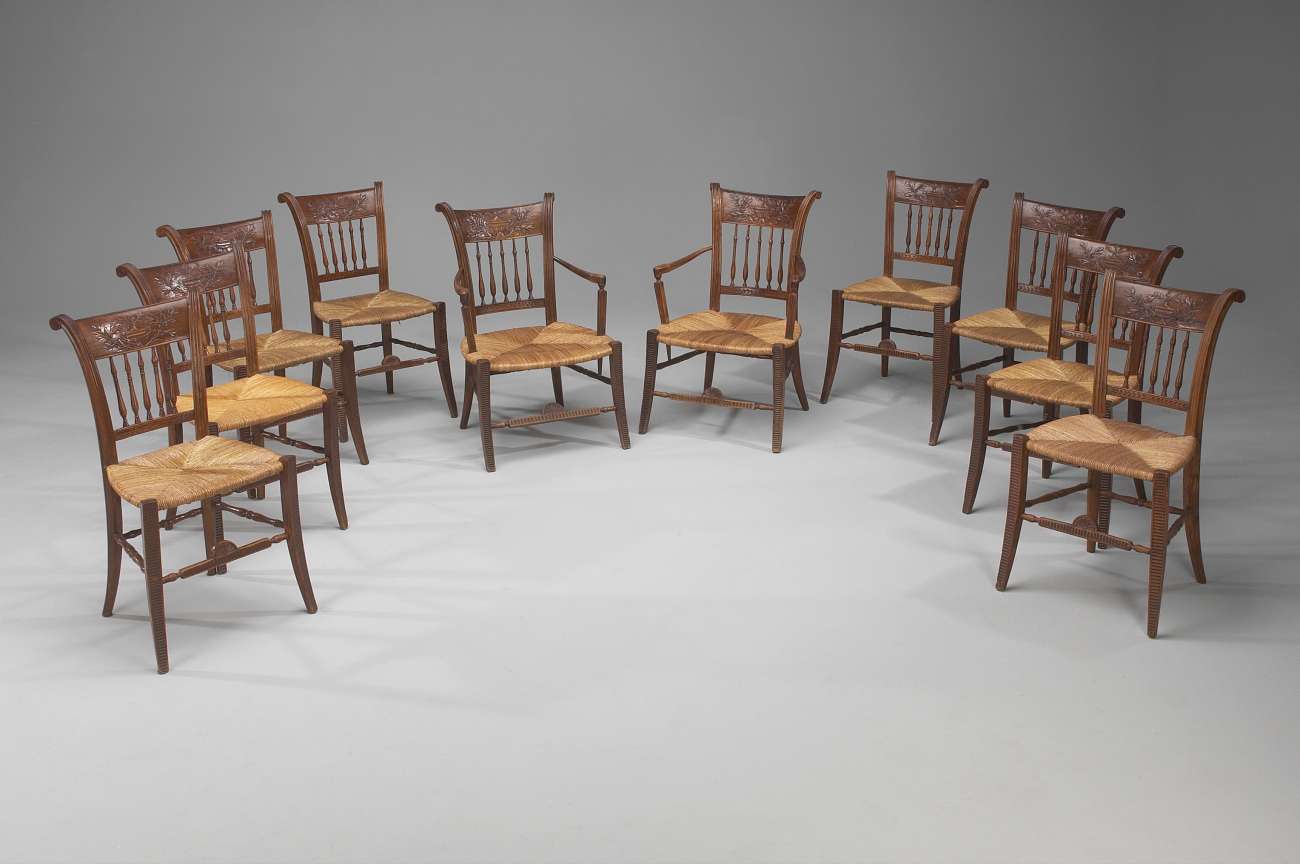 Suite de 8 CHAISES et 2 FAUTEUILS rustiques en bois naturel mouluré et sculpté. Dossier à crosse évasé et ajouré, à décor de colonnettes et d'un bandeau orné d'un vase entouré de feuillages. Entretoise antérieure ornée en son centre d'une demi-rosace surmontant une frise striée. Piètement avant sabre à décor en dents de scie horizontales. Siège paillé.
