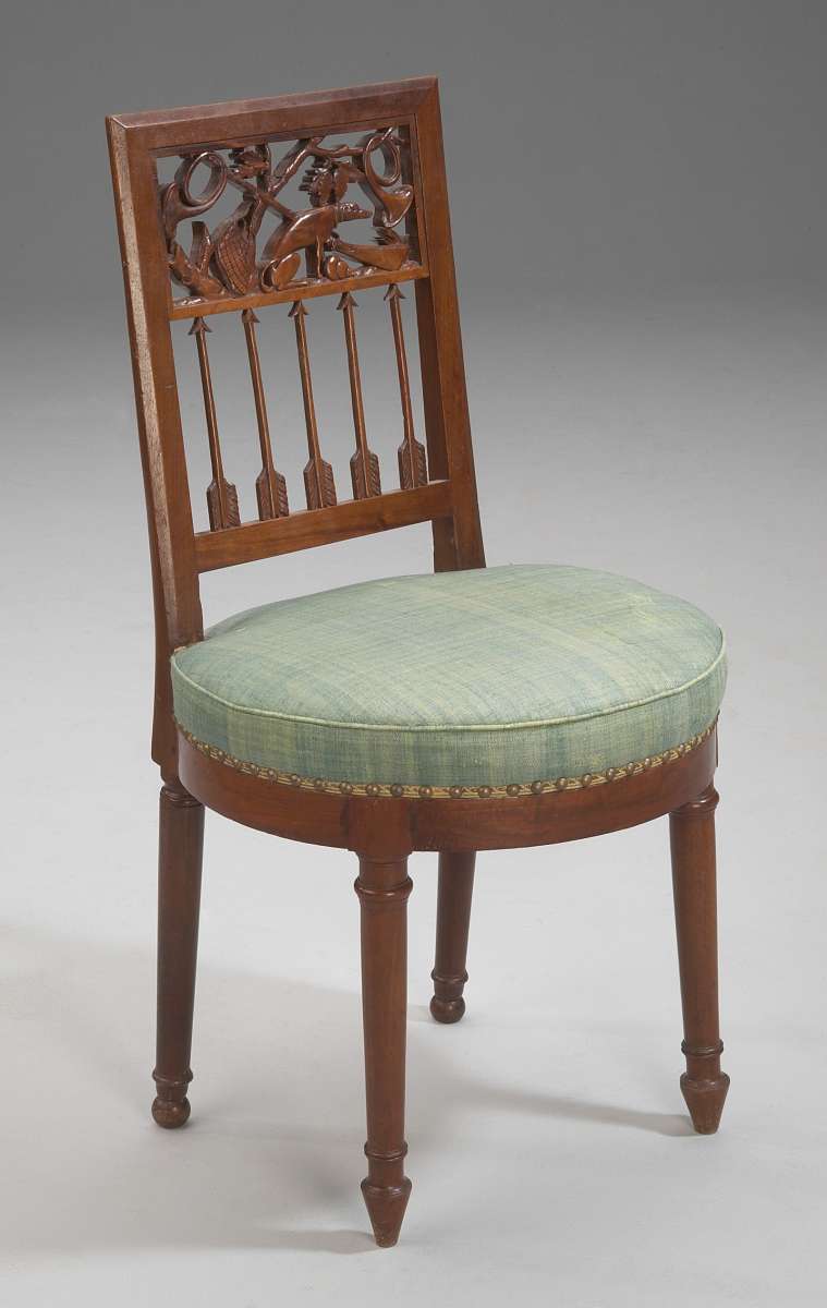 CHAISE en acajou et placage d'acajou à dossier droit et ajouré orné d'une scène sculptée de motifs de chasse (trompes de chasse, fusil, chien à l'arrêt) et portée par 5 flèches à la verticale. Assise circulaire. Piètement avant tronconique annelé terminé en pointe et piètement arrière tronconique terminé en boule.
