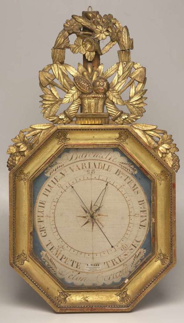 BAROMÈTRE en bois doré et sculpté. Lunette octogonale ornée d'une frise de perles, de rais de coeur et de palmettes - surmontée d'une composition ajourée : panier de fruits, outils de jardinage et rameaux fleuris. Cadran signé "E. VIARD oculiste-opticien, seul fabricant, 32 rue de l'Hôtel de Ville, Troyes".