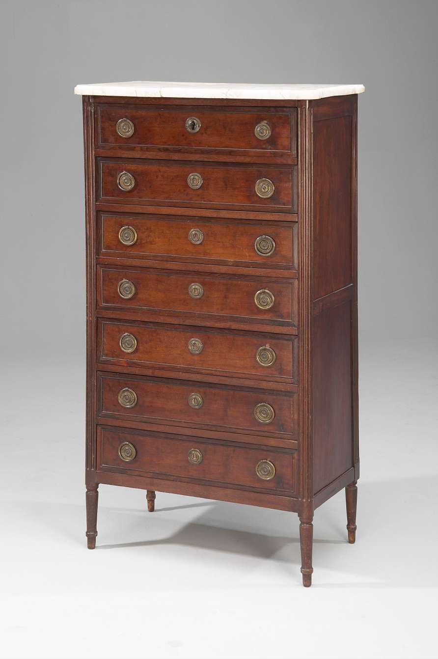 SEMAINIER en acajou et placage d'acajou moucheté dans des encadrements de palissandre. Montants cannelés, à colonnes engagées à l'avant, et pilastres à l'arrière. Repose sur quatre pieds fuselés. Poignées de tirage et entrées de serrure en bronze. Dessus de marbre blanc.