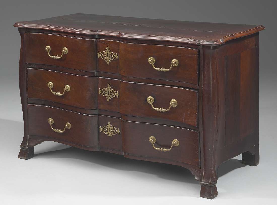 COMMODE de PORT en acajou foncé mouluré à façade en arbalète et côtés galbés. Elle ouvre à trois rangs de tiroirs. Plateau supérieur mouvementé et bordé d'un bec de corbin. Montants arrondis et fuselés. Piètement court en sabots. Ornementation en bronze doré et ciselé : entrées de serrure et poignées de tirage.