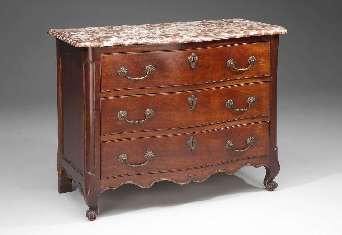 COMMODE de PORT en acajou massif à façade galbée ouvrant à trois rangs de tiroir. Ceinture inférieure moulurée et mouvementée. Ornementation en bronze : poignées de tirage mobiles à rosace et entrées de serrure Rocaille. Pieds cambrés à enroulement. Dessus de marbre brèche rouge.
