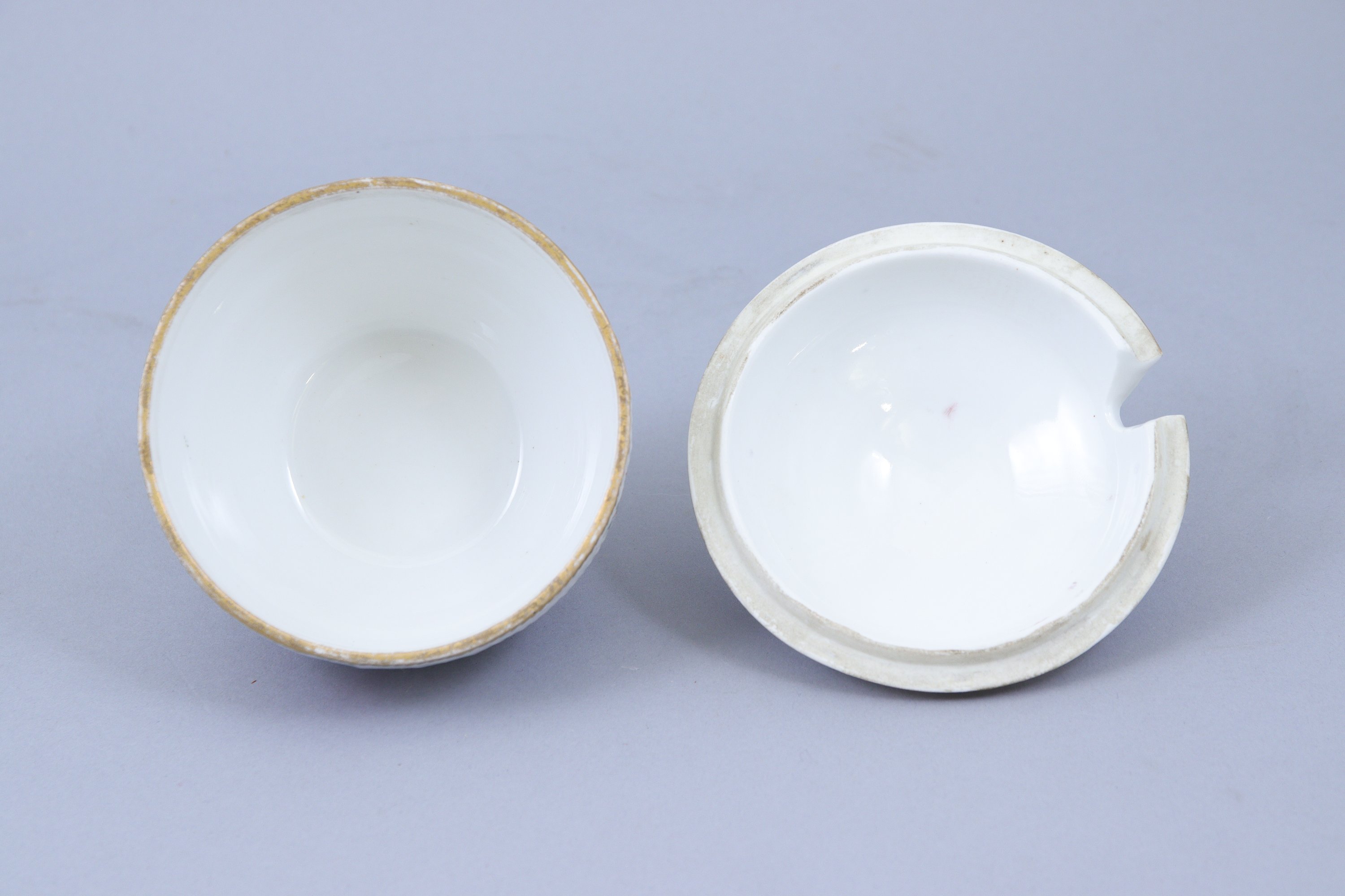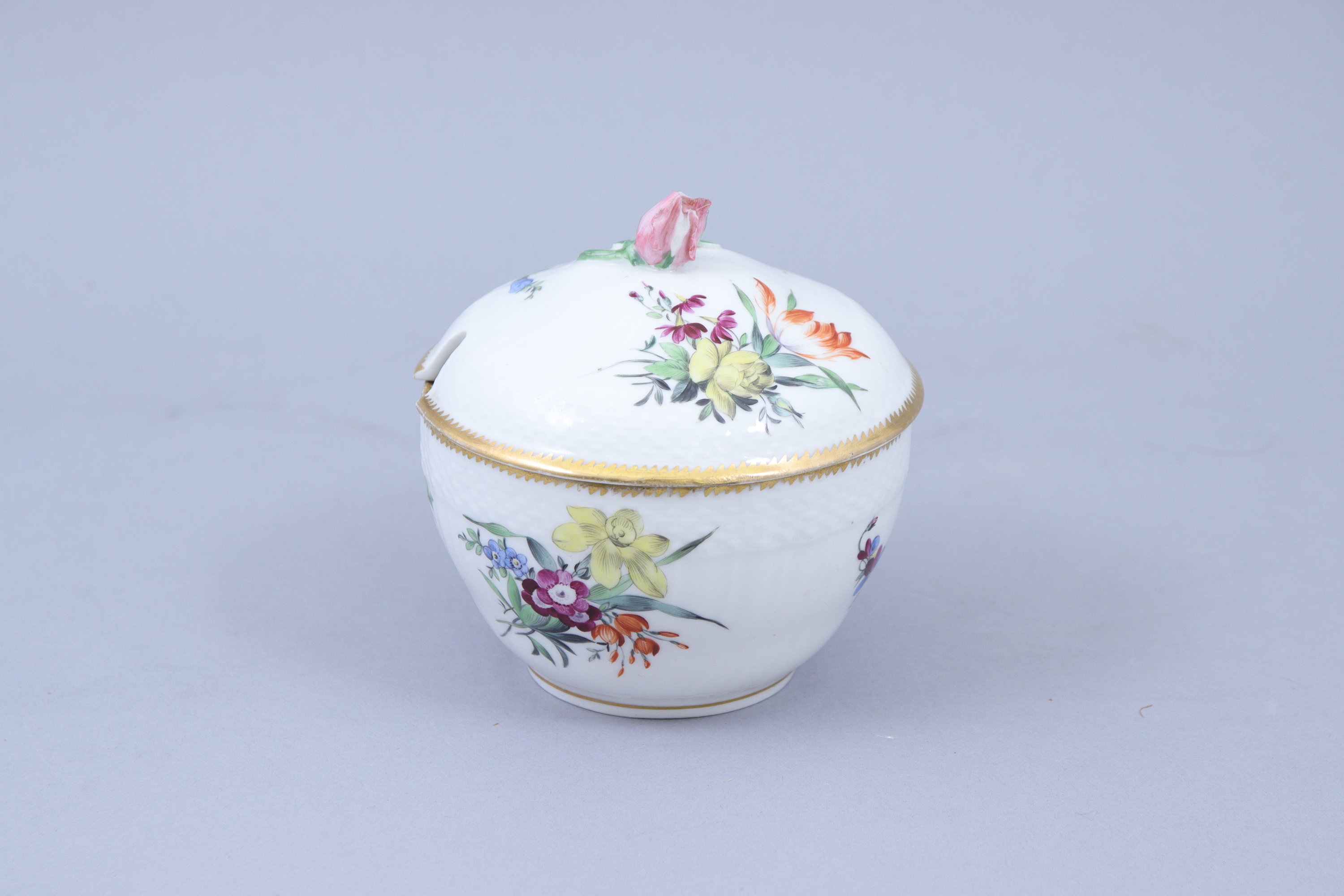 en porcelaine à motifs de vannerie en léger relief, décor polychrome de fleurs, la prise du couvercle en forme de rose et feuillage, filet dentelé or sur les bords.