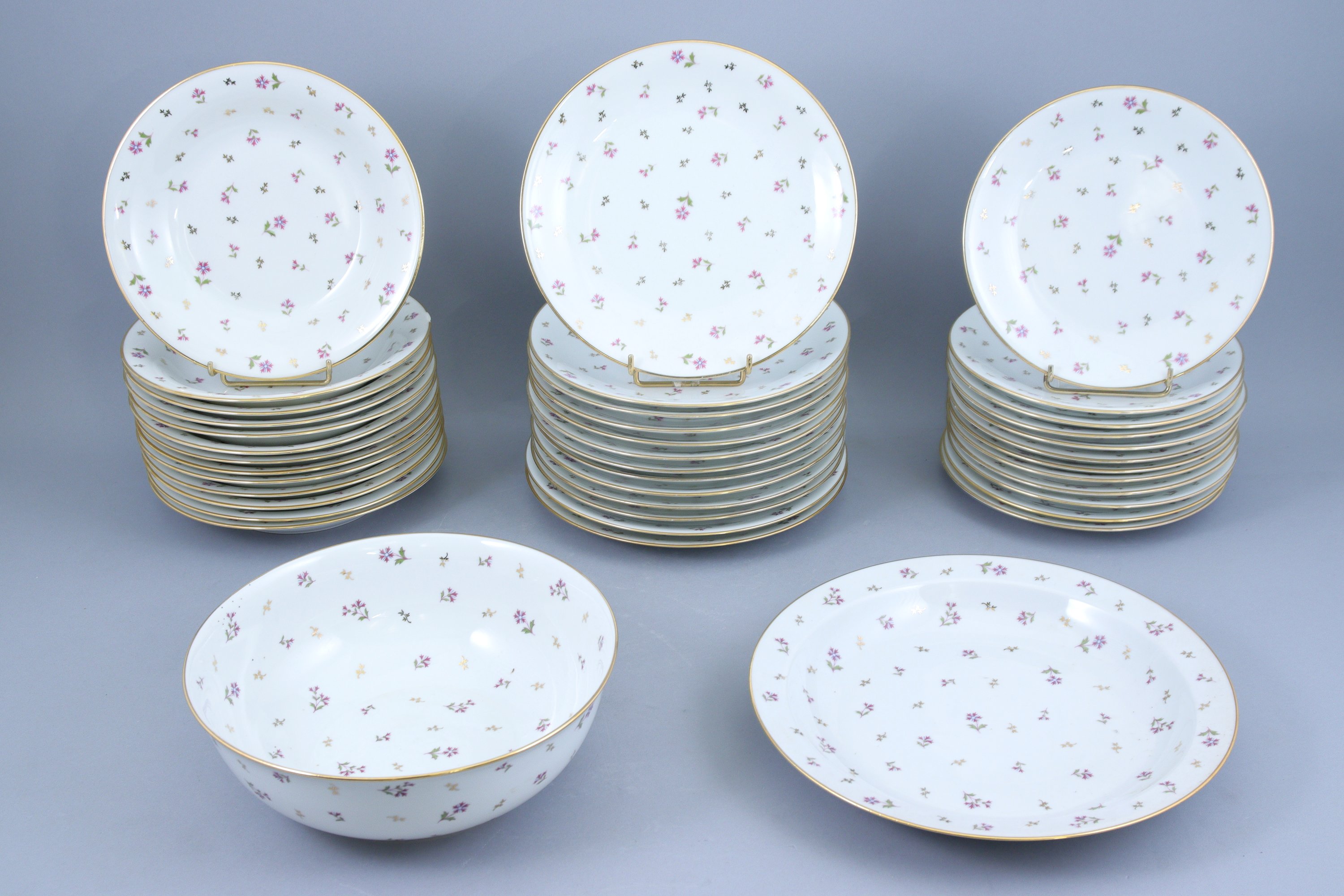en porcelaine à fond blanc et doré. Il comprend : 35 assiettes plates, dont deux de taille différente ; 12 assiettes à dessert ; 13 assiettes creuses ; une saucière et son plateau fixe ; deux raviers ; deux plats oblongs en deux tailles ; trois plats circulaires en deux tailles ; un légumier ; deux saladiers ; un compotier ; une soupière et deux assiettes montées.