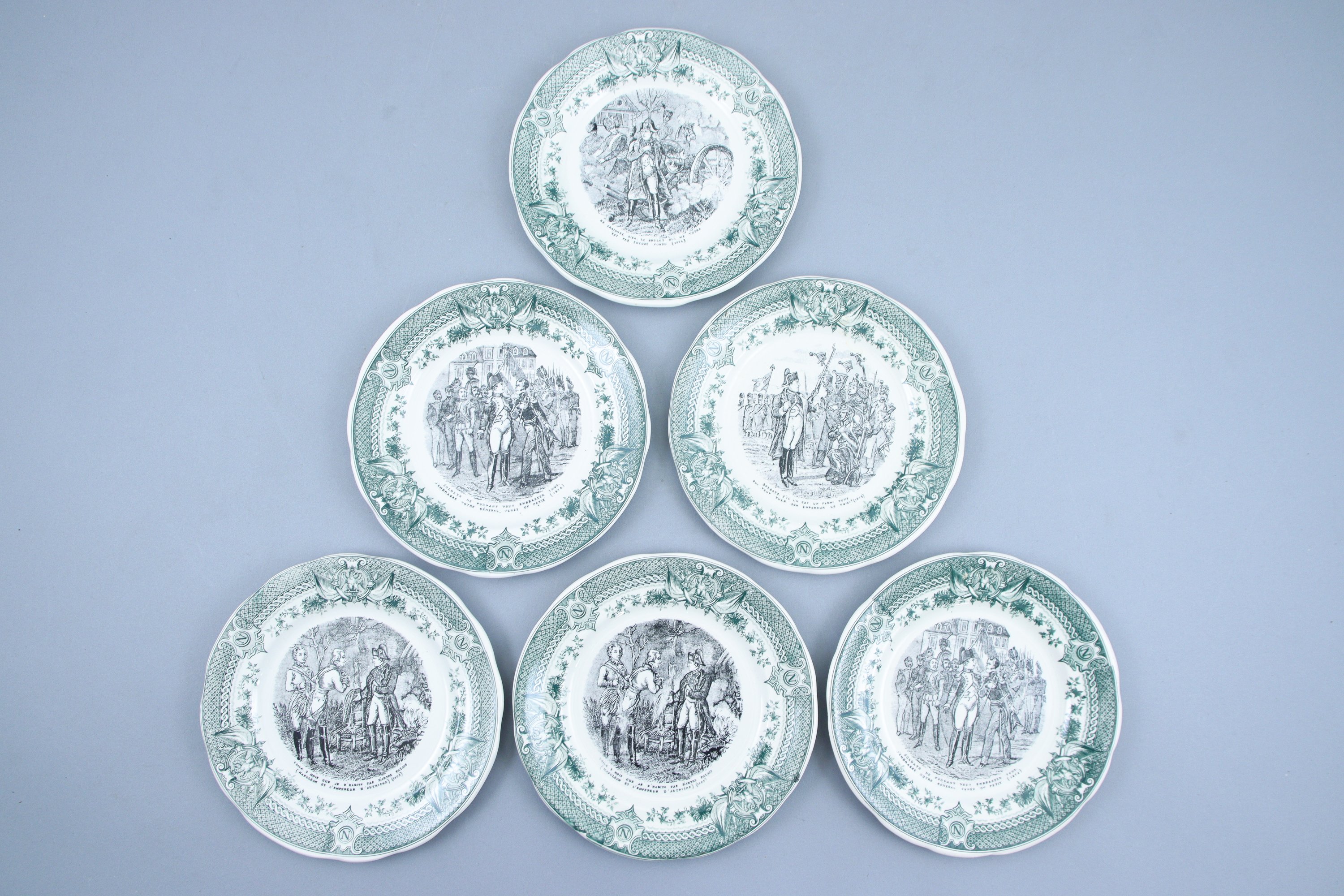 SarregueminesSix asssiettes parlantesen faïence imprimée sur le thème de Napoléon Ier. Marquées au revers "Oric.Prints...