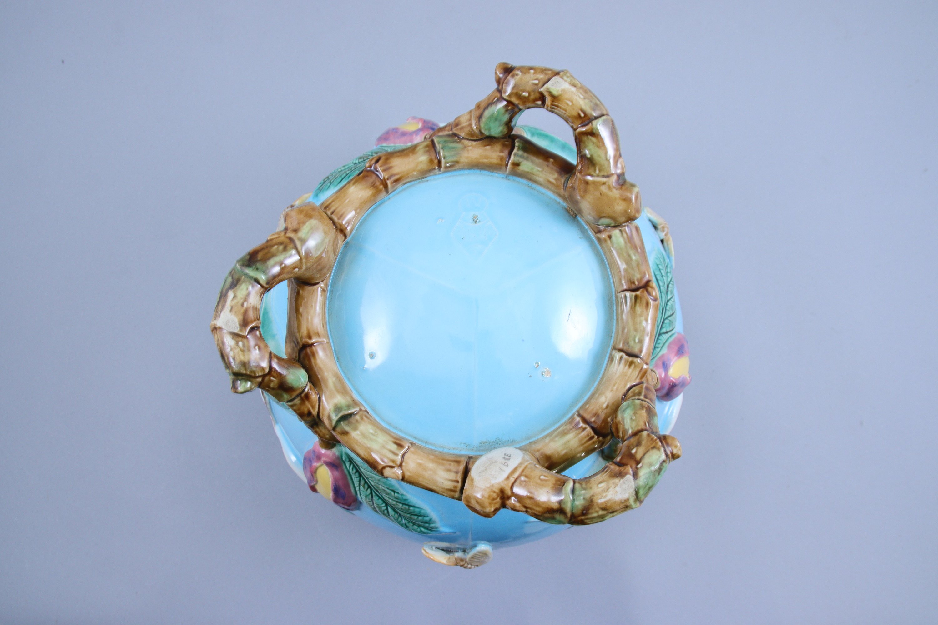 en faïence polychrome à décor de magnolias et papillons sur fond azur clair, l'intérieur lavande. Il repose sur un piétement de racines naturalistes.