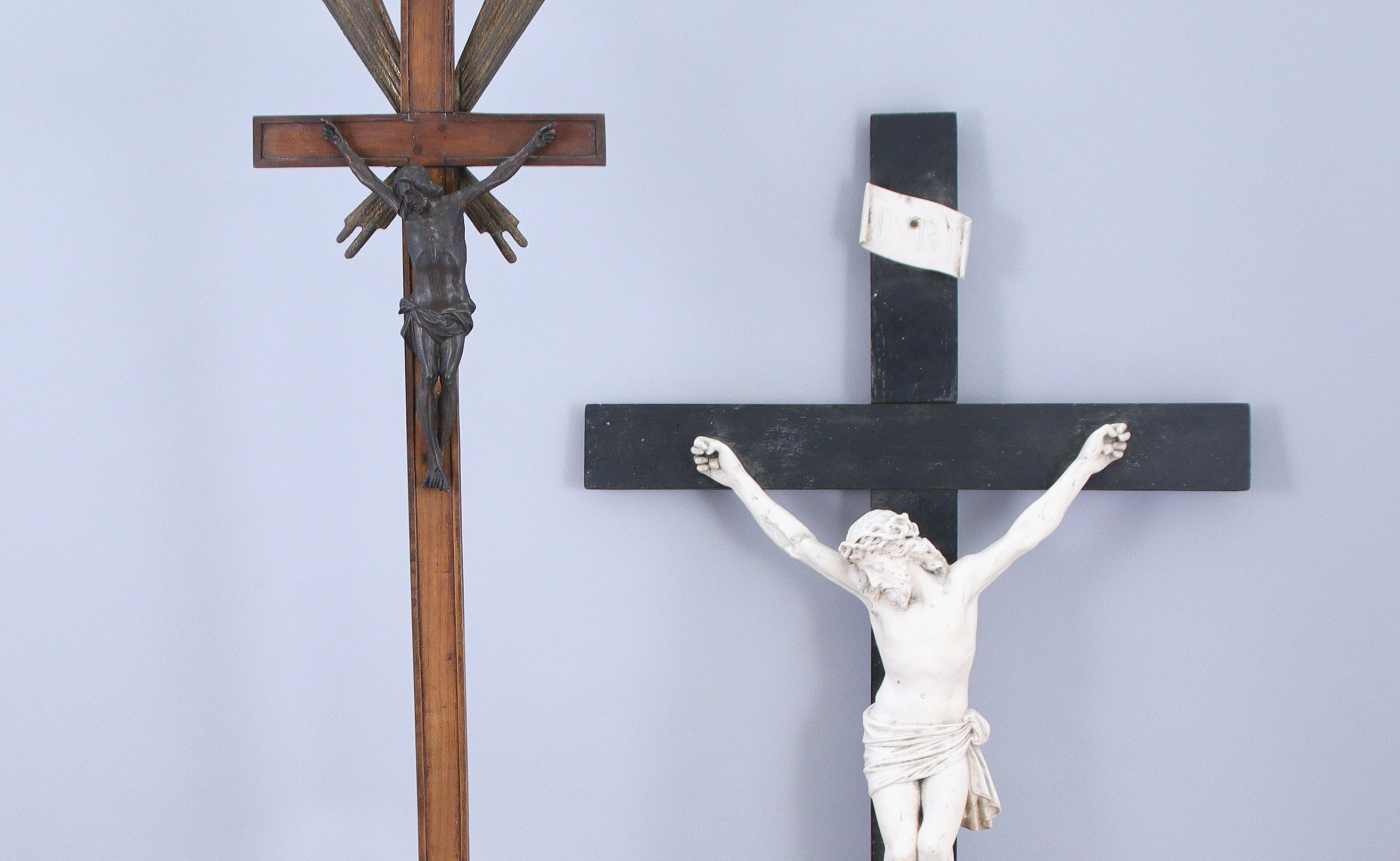 Trois crucifix - Crucifix d'autel sur son socle en bois naturel et traces de...