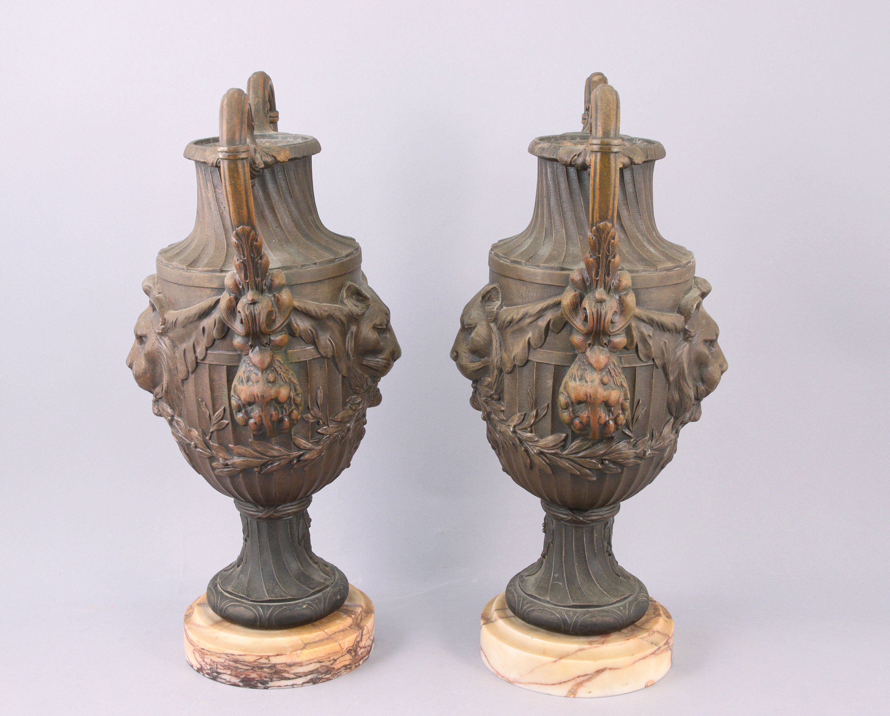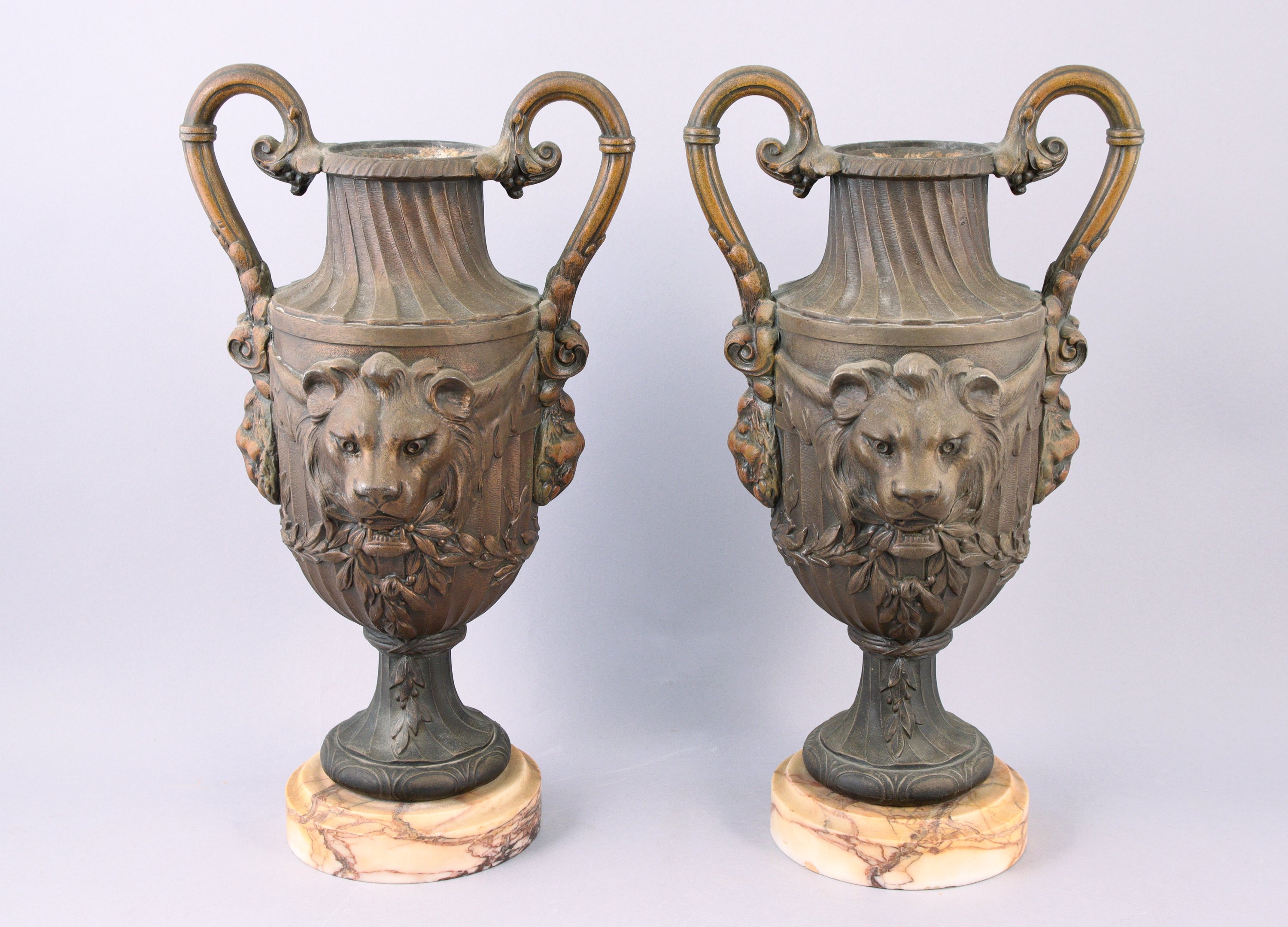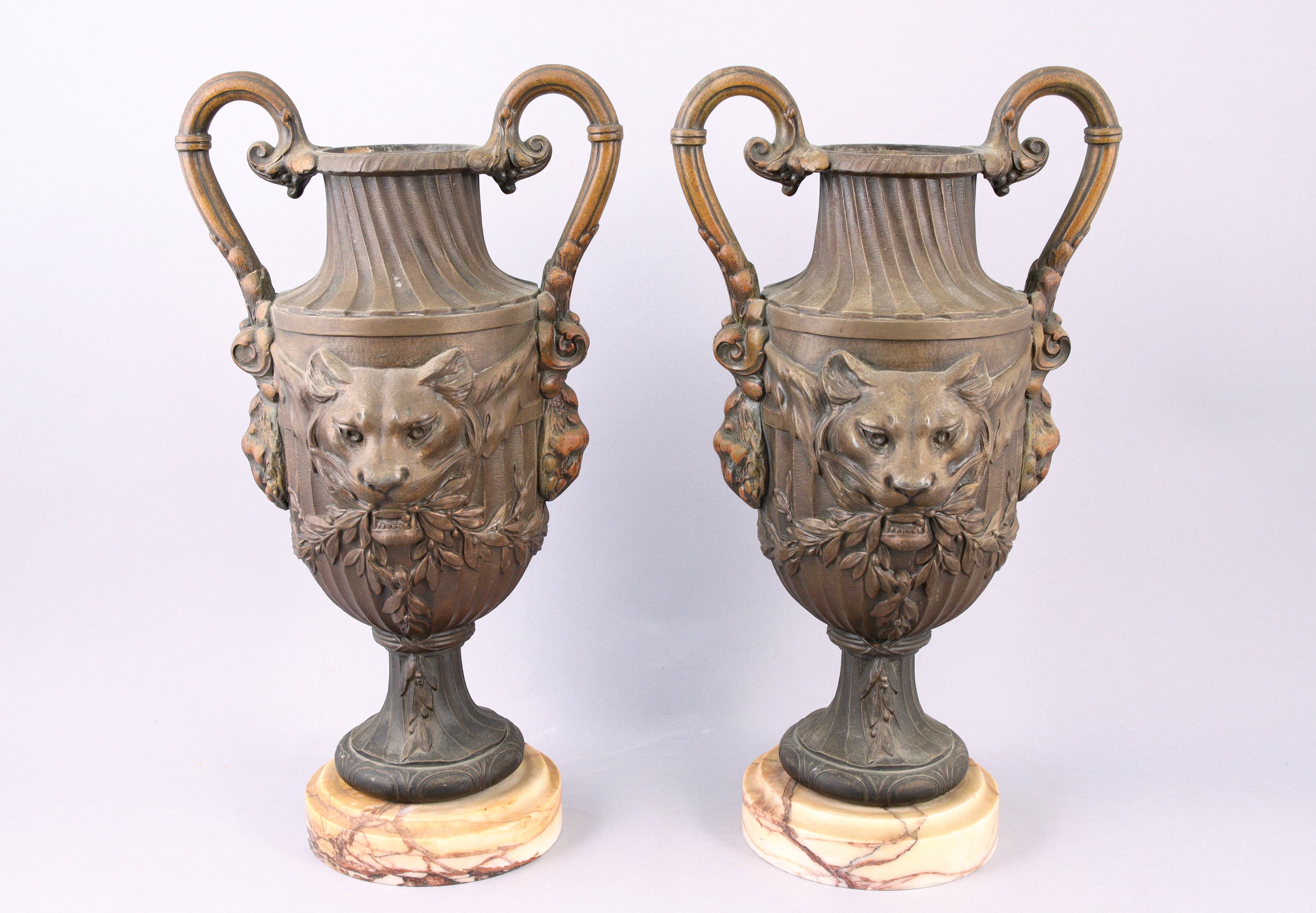 Paire de vases aux mufles de lion en régule, à deux anses terminées en enroulements...