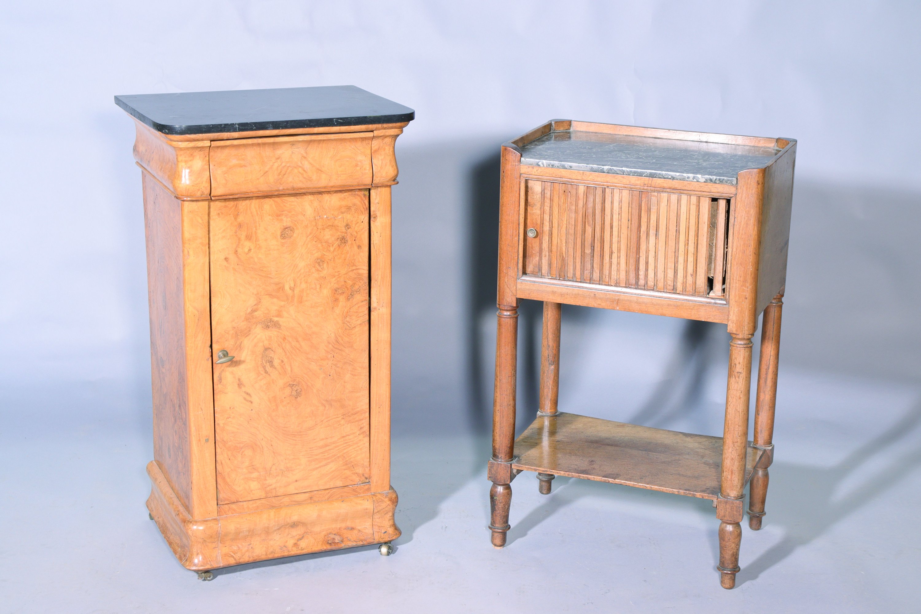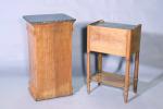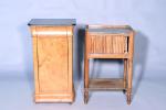 - le premier en placage de loupe de noyer. Il ouvre par un tiroir et un vantail dévoilant une étagère. Il repose sur une plinthe en doucine terminée par quatre roulettes. Dessus de marbre noir. Epoque Charles X. Haut. 78,5 Larg. 41 Prof. 33,5 cm.