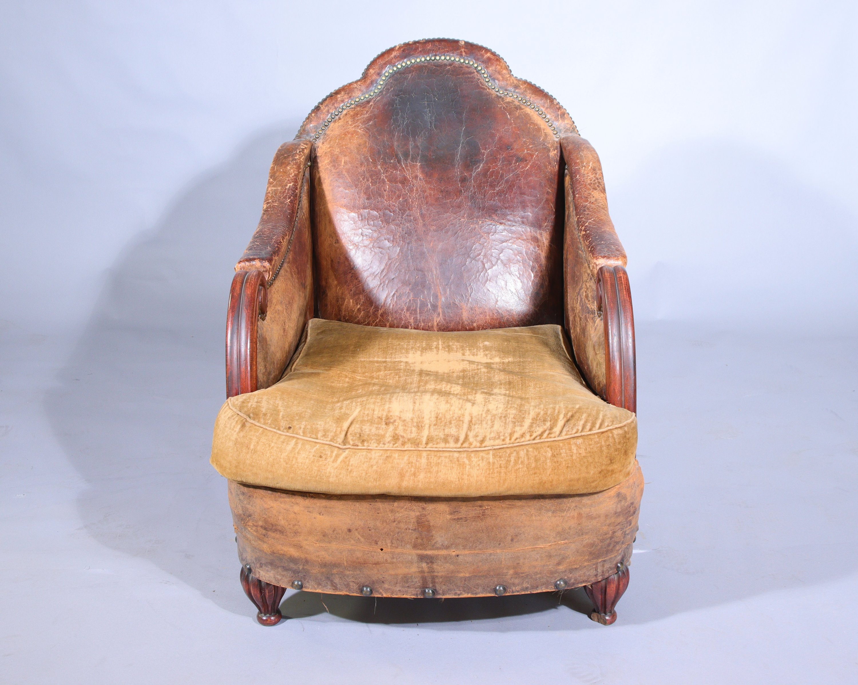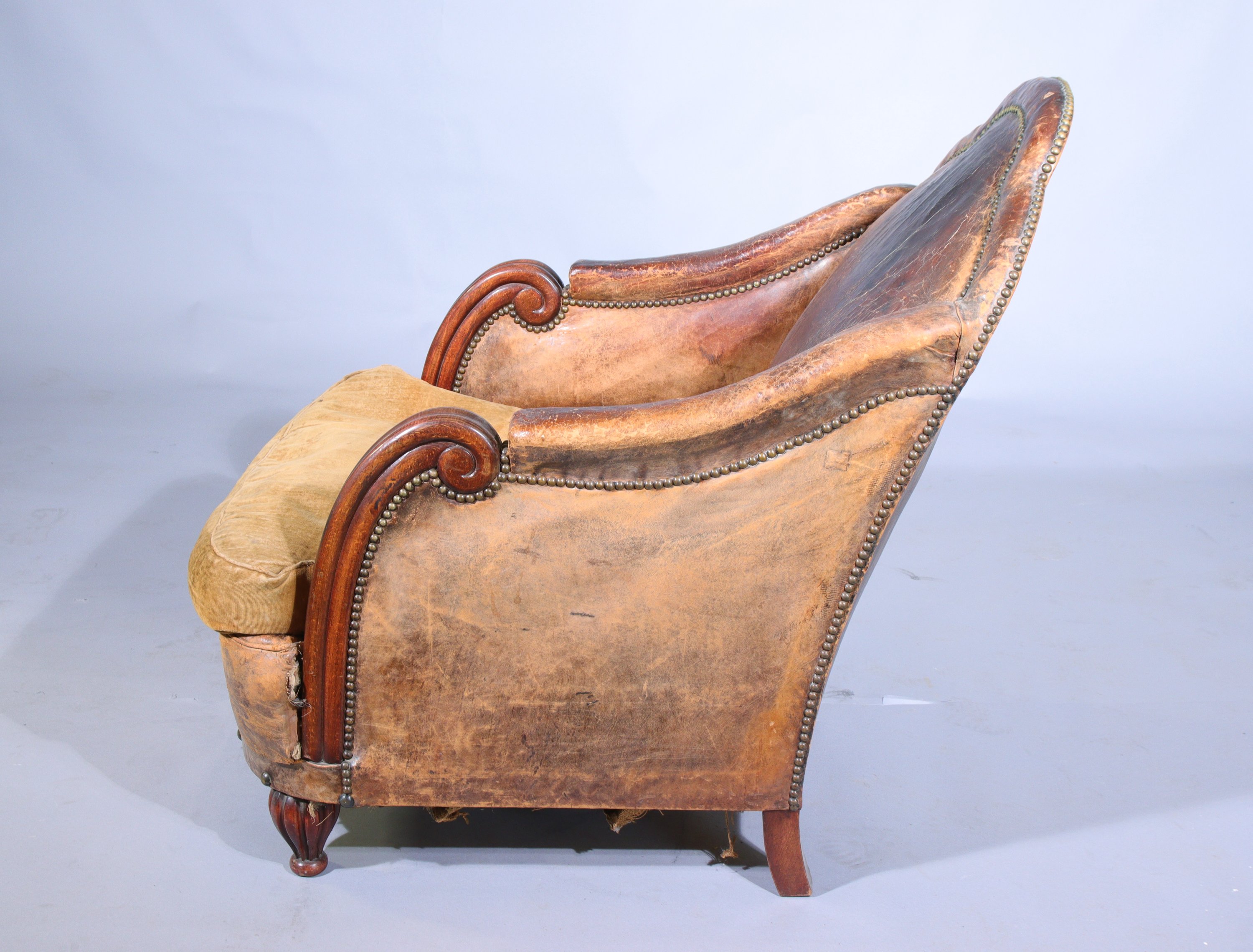en acajou et garniture de cuir. Le dossier incliné, les accotoirs à manchettes reposant sur des consoles en enroulement. Les pieds antérieurs cannelés en forme de sphère, les postérieurs en sabre.
