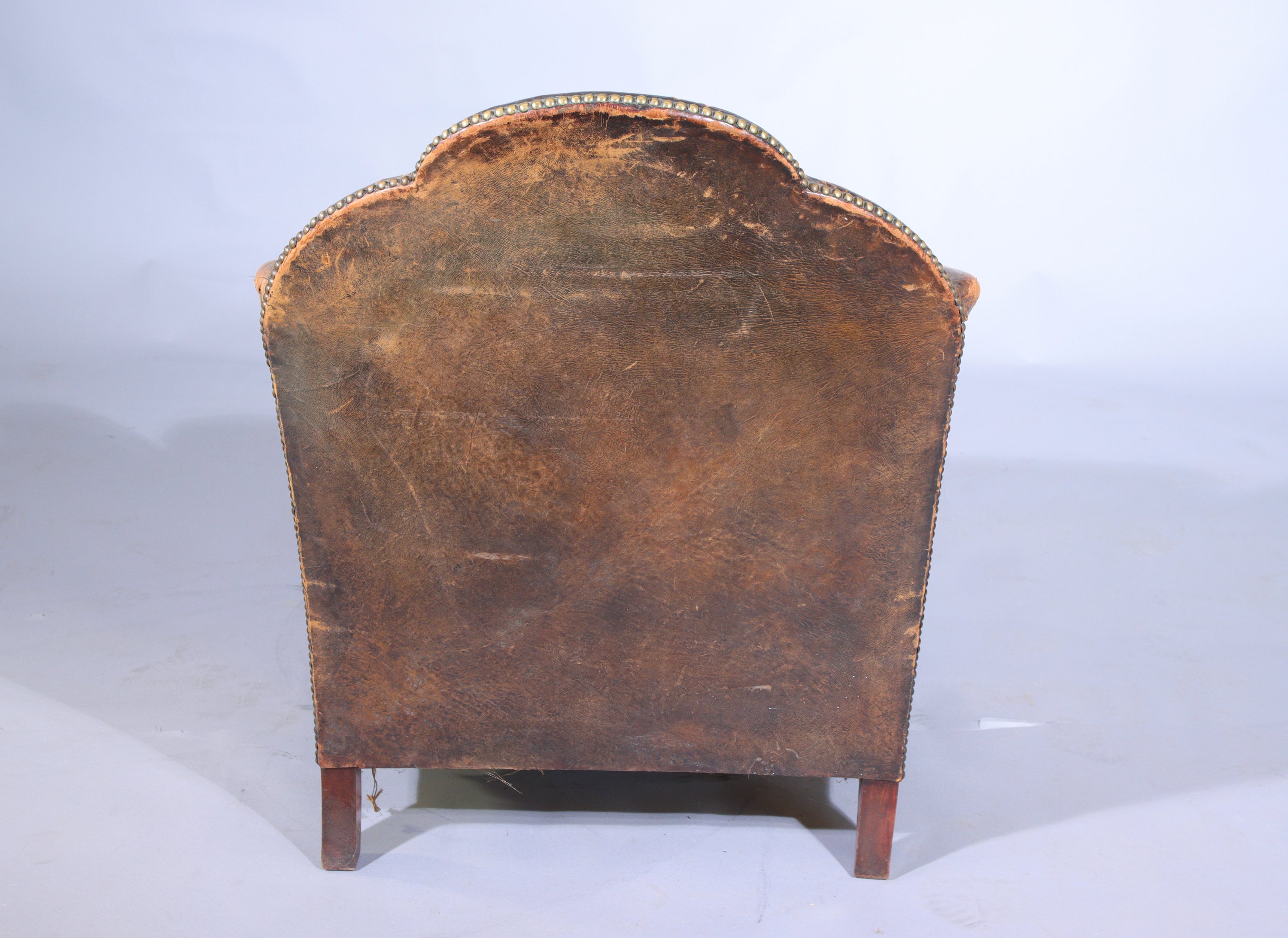 Fauteuil en acajou et garniture de cuir. Le dossier incliné, les accotoirs à manchettes reposant...