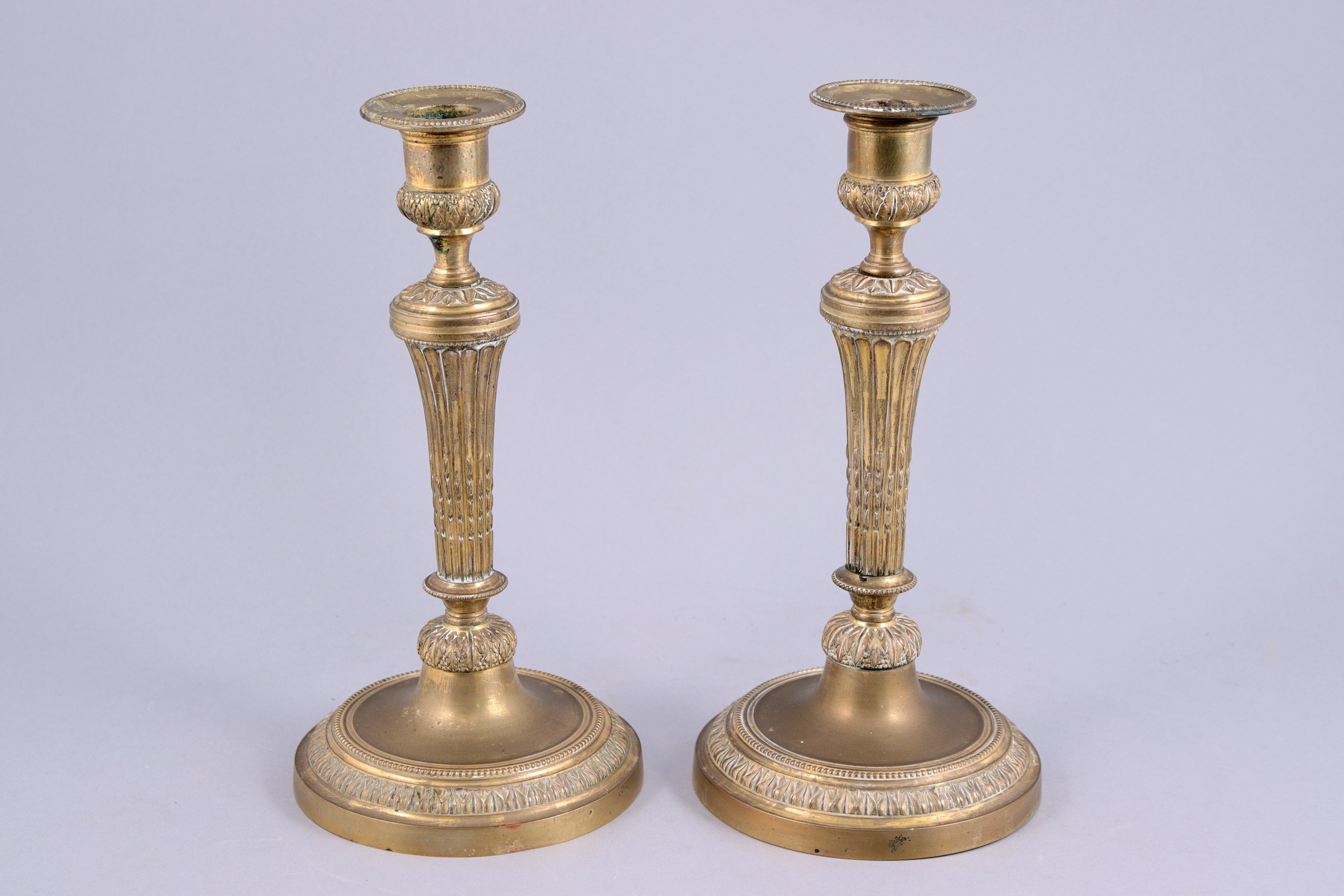 Paire de flambeaux en bronze. Le binet en forme de vase Médicis, le fût cannelé...