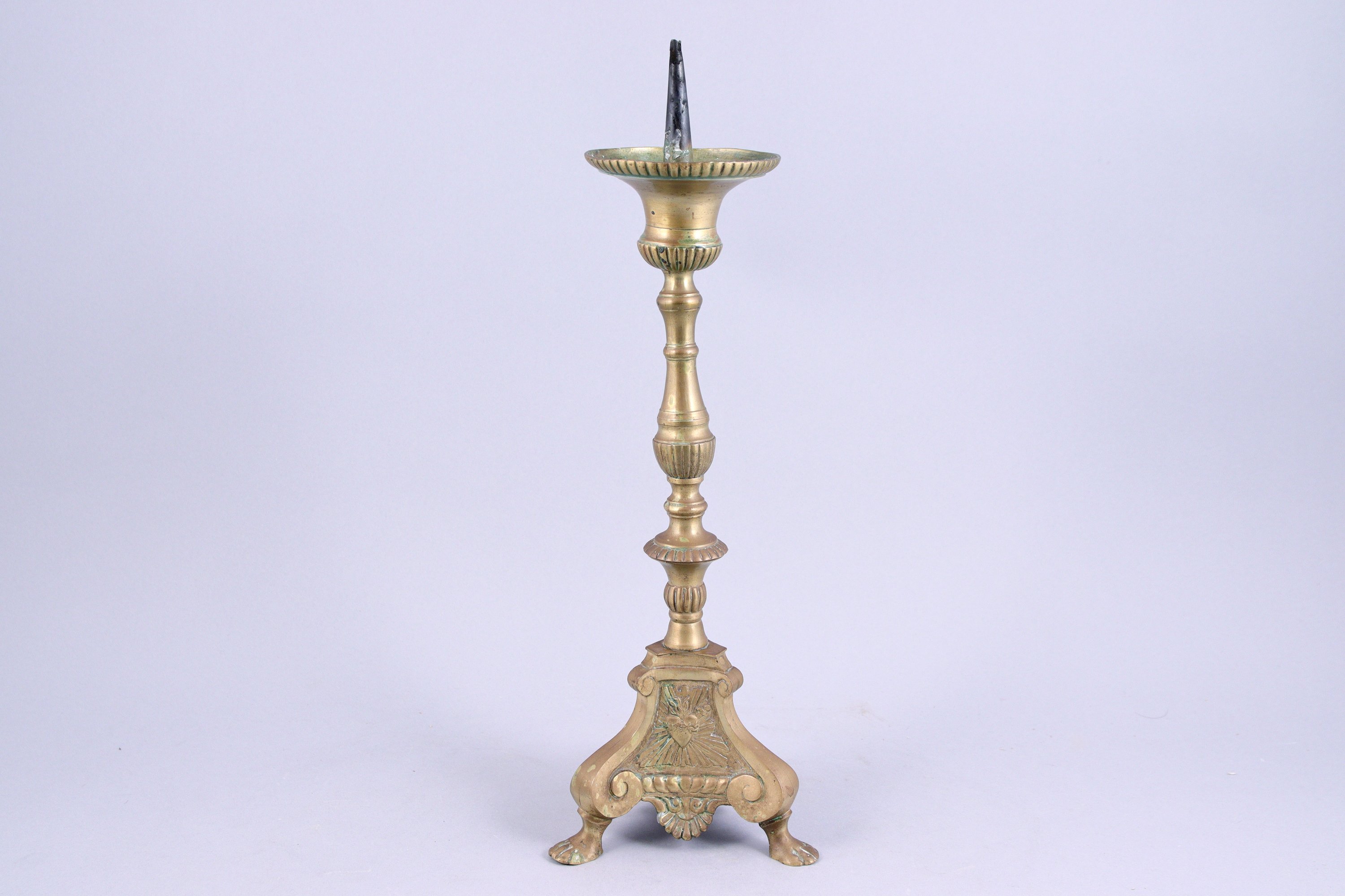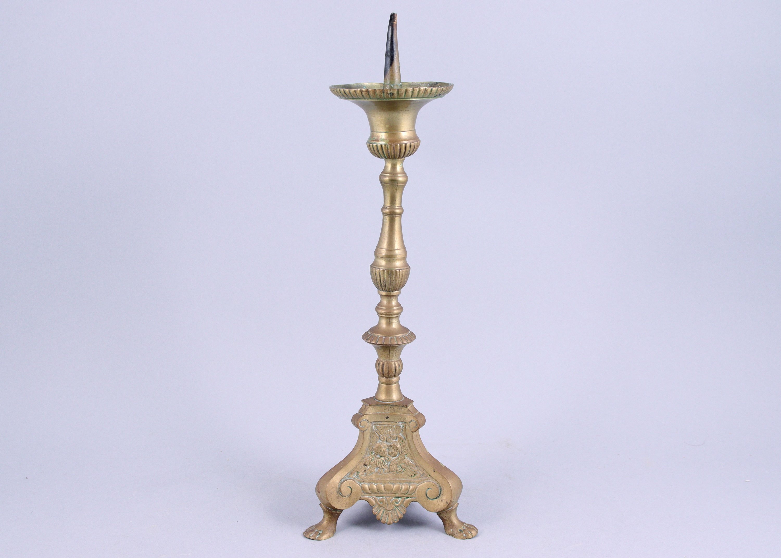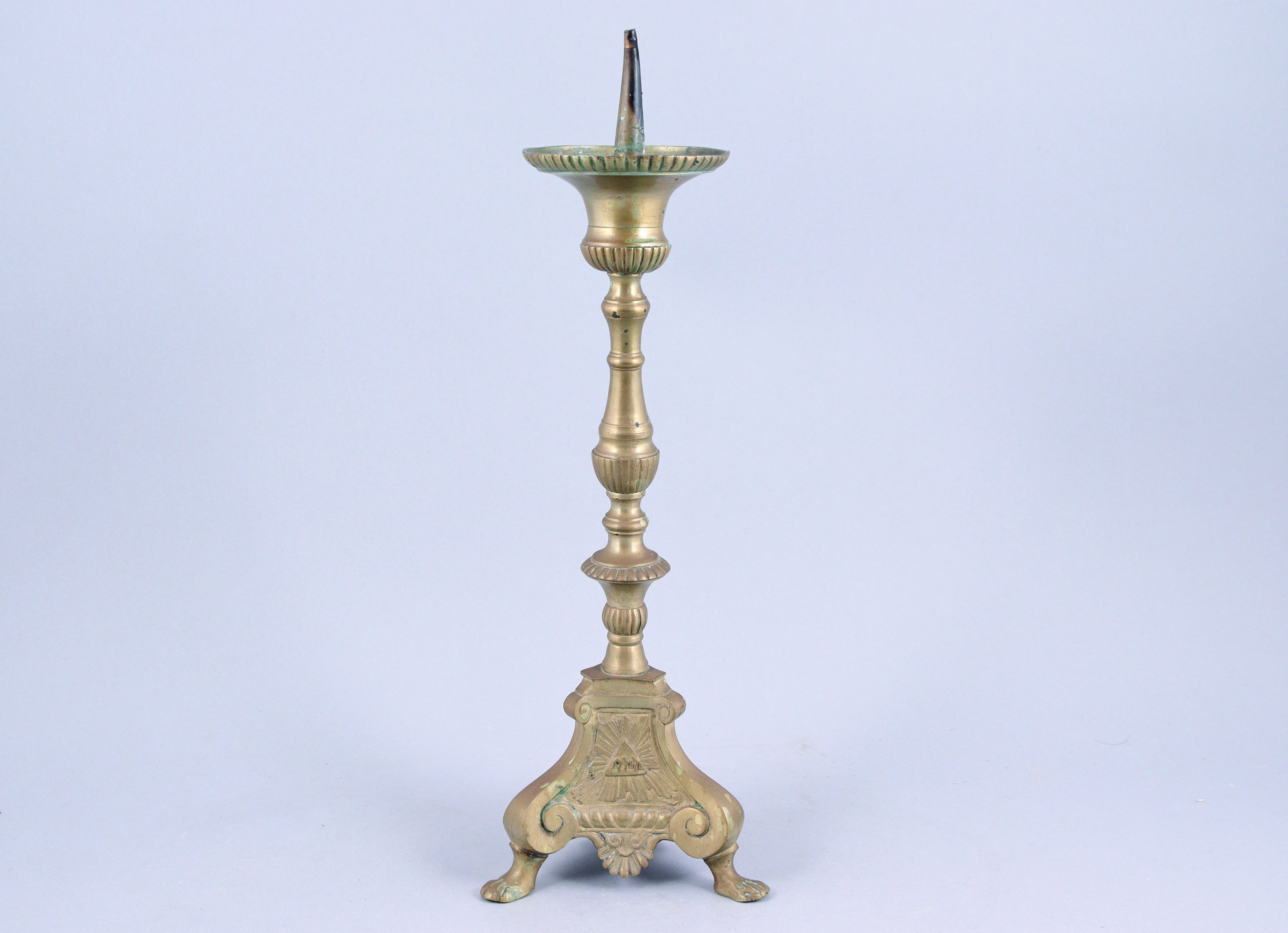 Joint: Pique-cierge en laiton à bobèche à bord godronné et fût balustre. Il repose sur un piétement tripode terminé par des griffes et séparé par un décor de têtes d’anges, un cœur sacré et le symbole de la trinité hébraïque. Haut. 44 cm.