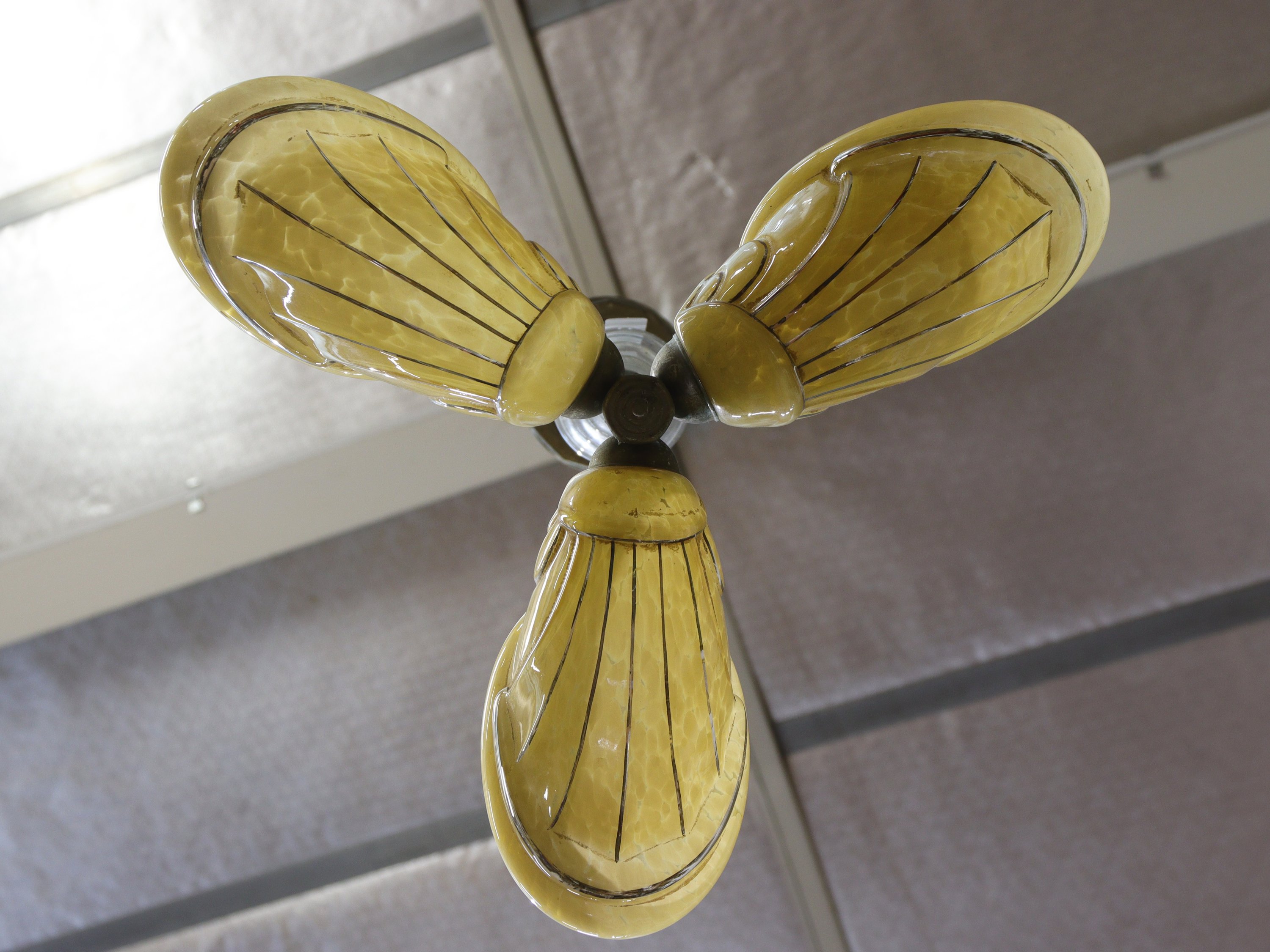 en métal chromé à trois lumières décorées de coquillages en verre teinté beige et rehauts argentés. Le fût octogonal orné en son centre d'une boule en verre.