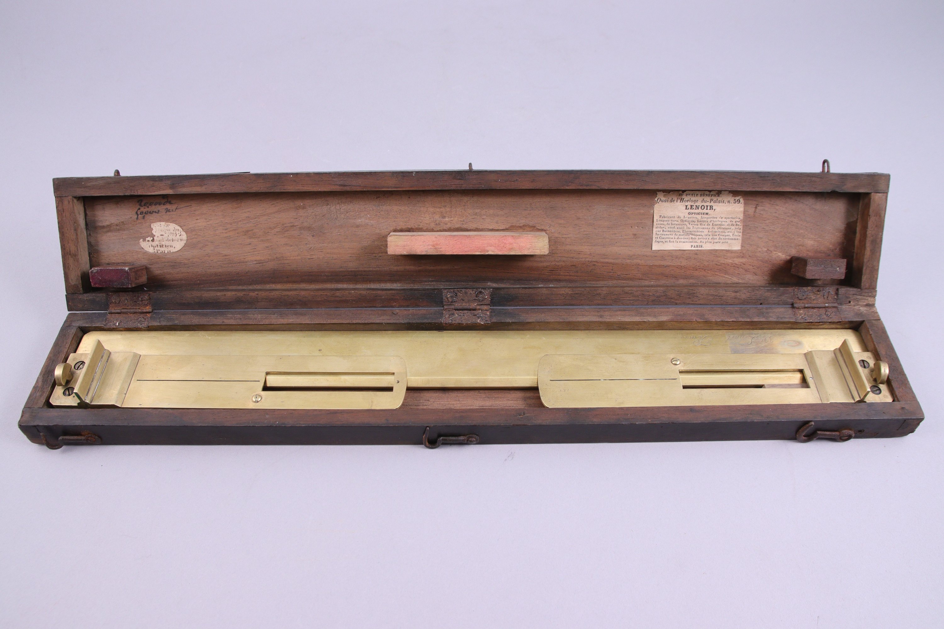 Dans une boîte en bois portant deux étiquettes, dont celle du magasin "Au petit bénéfice / Quai de l'Horloge du Palais, n°59".