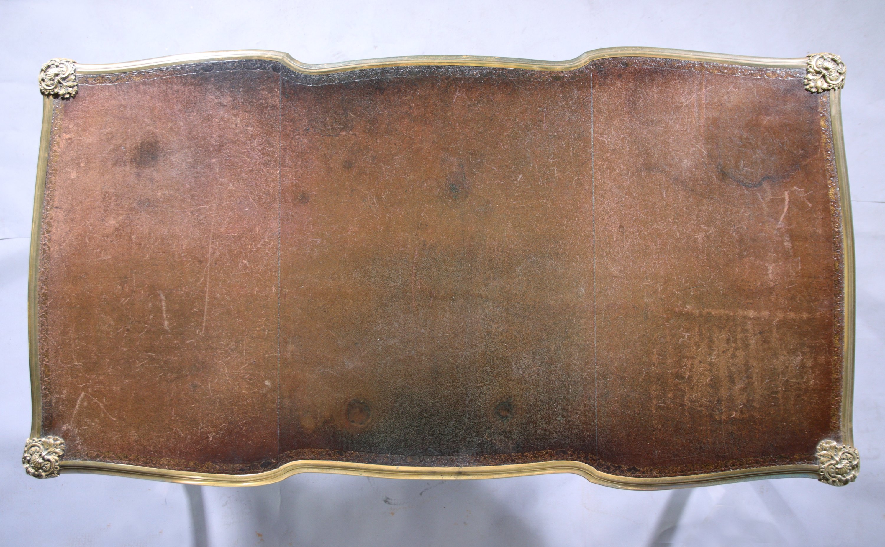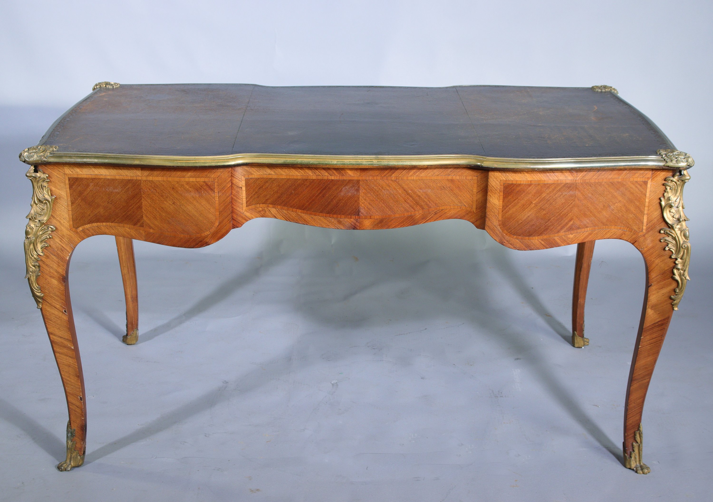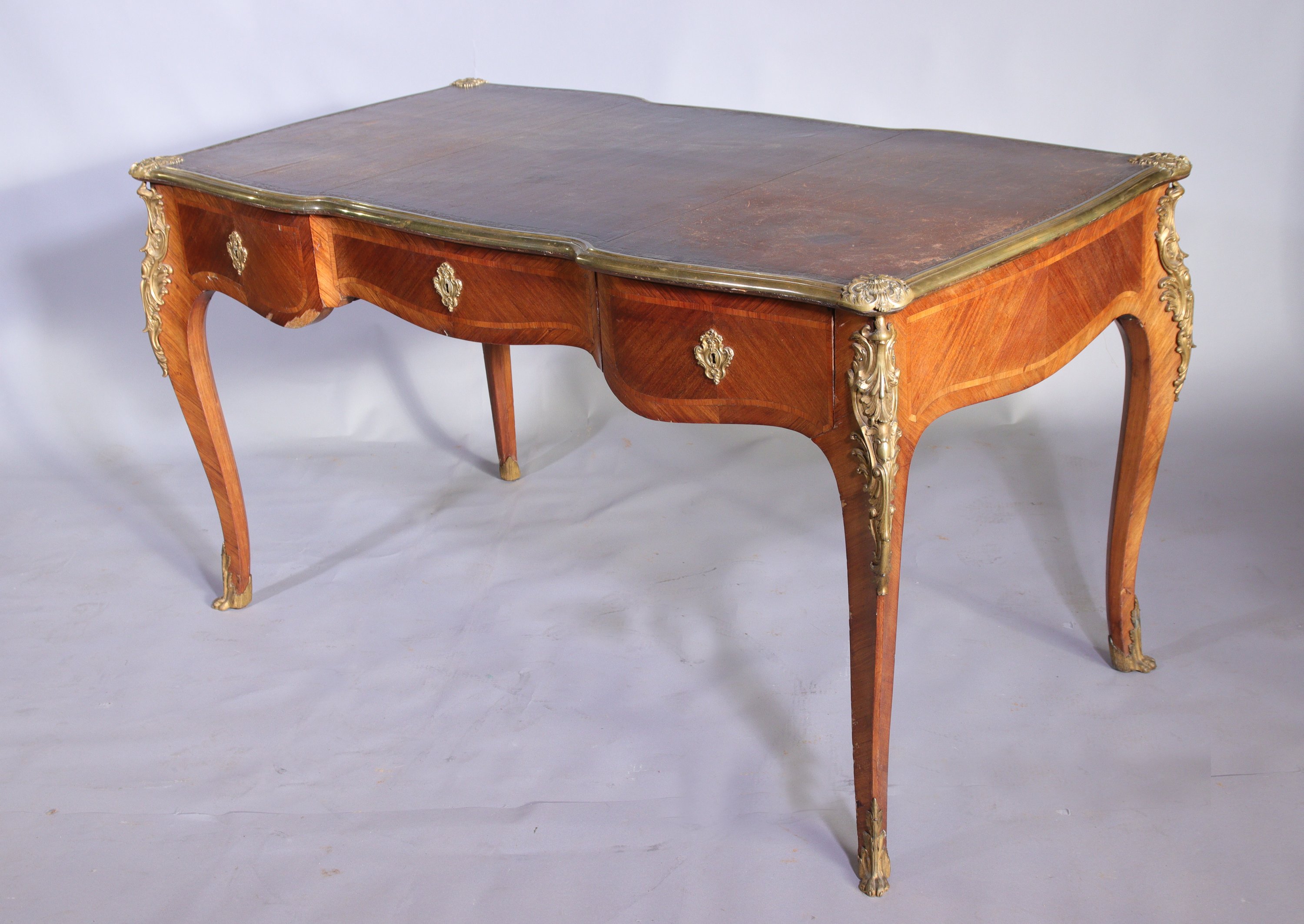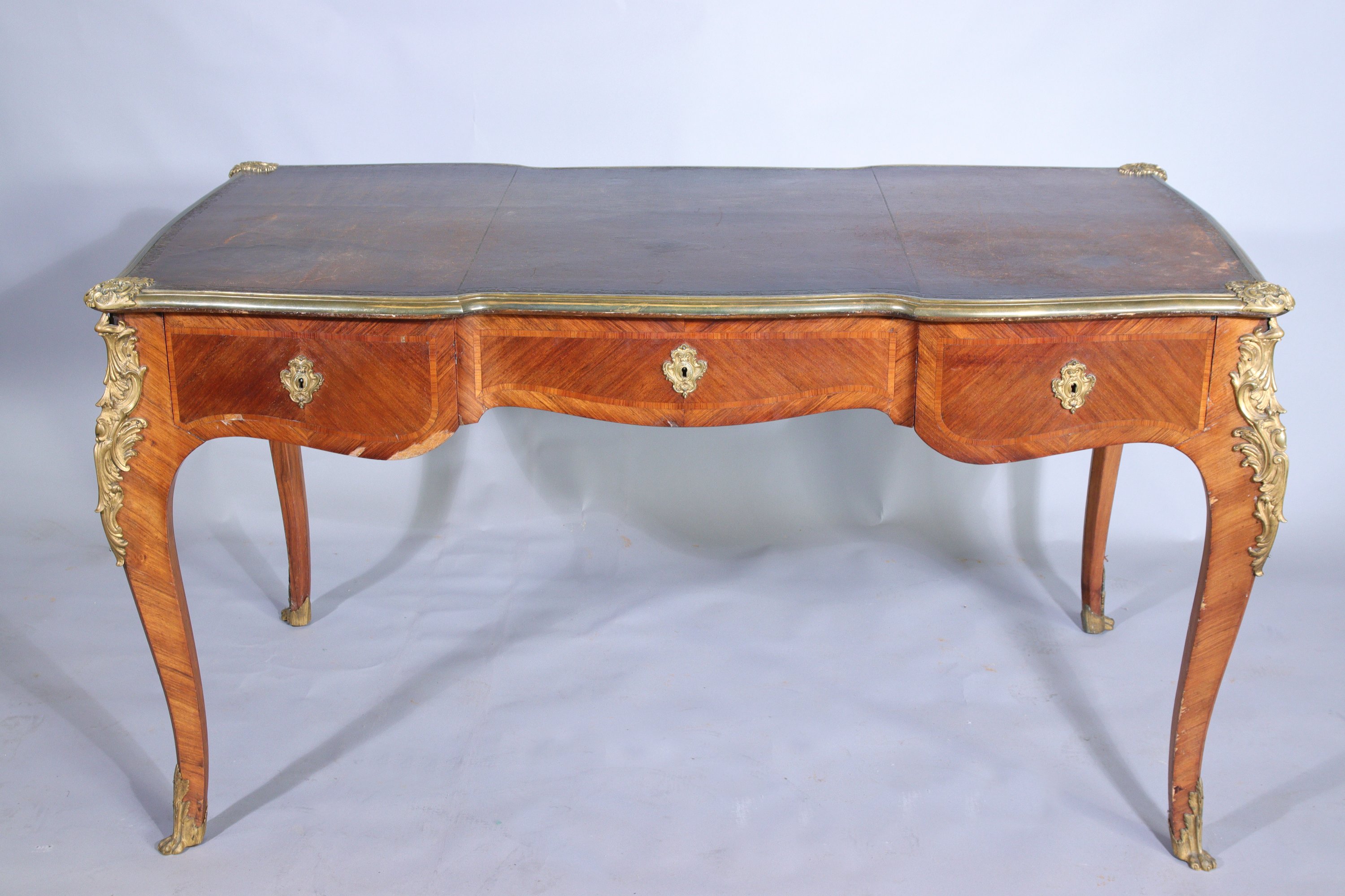 en placage de bois de rose sur fond de chêne, à la ceinture mouvementée ouvrant par trois tiroirs. Quatre pieds cambrés. Le plateau garni d'un cuir marron cerclé d'une lingotière en laiton.