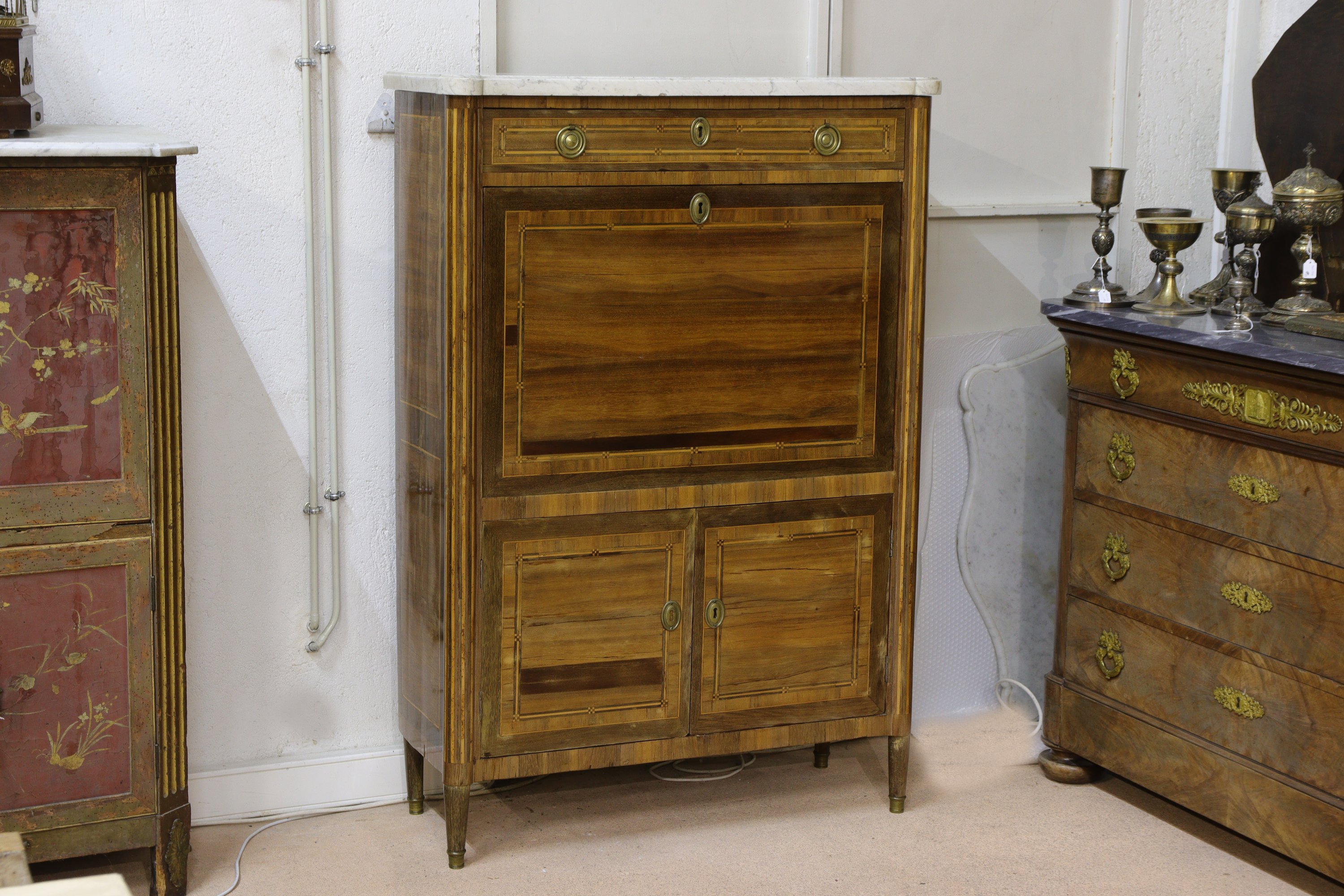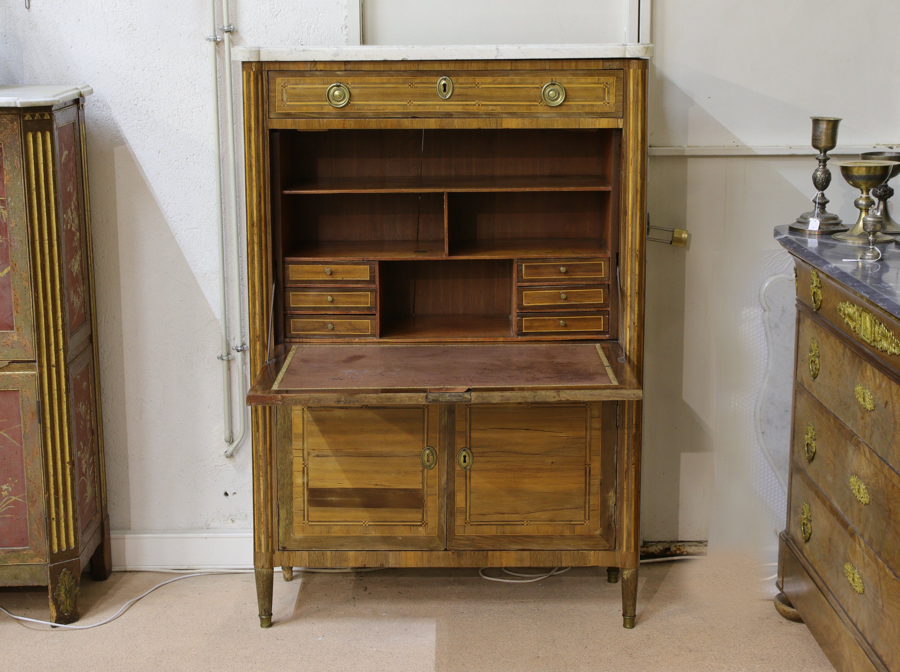 en bois de placage, ouvrant par un tiroir surmontant un abattant découvrant six tiroirs sur deux rangs et quatre casiers, deux vantaux en partie inférieure. Riche décor de filets et marqueterie, les côtés à décor de table. Deux demi-colonnes en façade se prolongeant sur des pieds fuselés.
