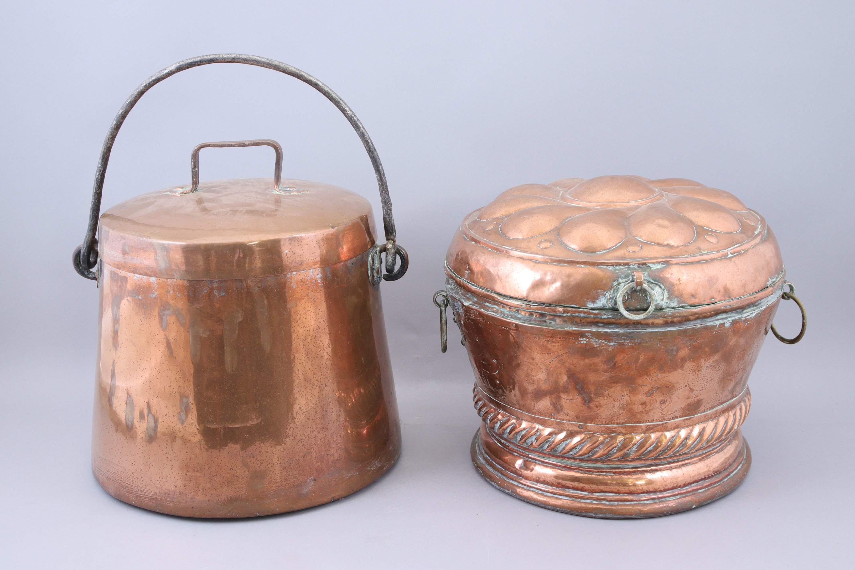 Une marmite et un faitout en cuivre. Le premier ouvre par un couvercle circulaire à...