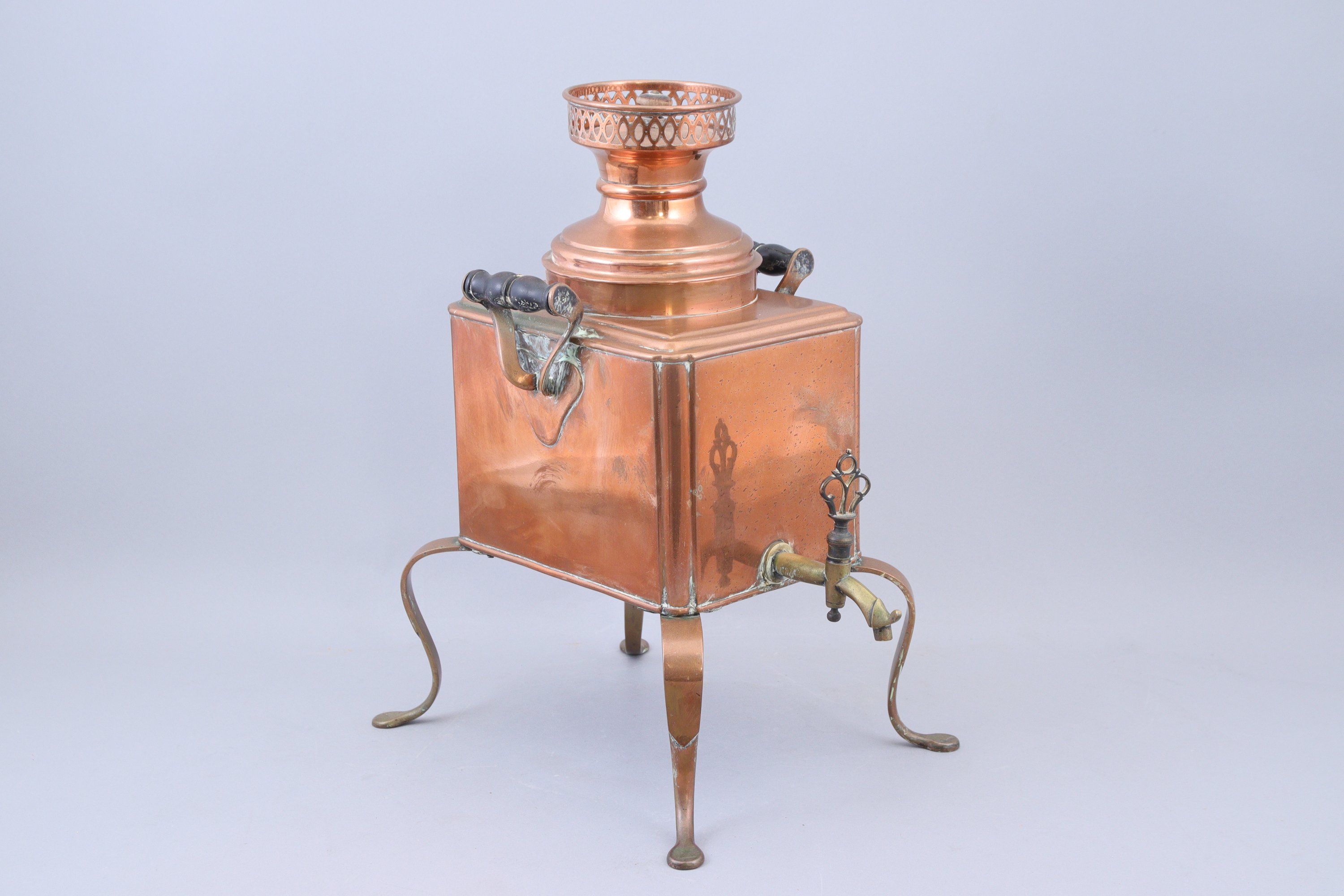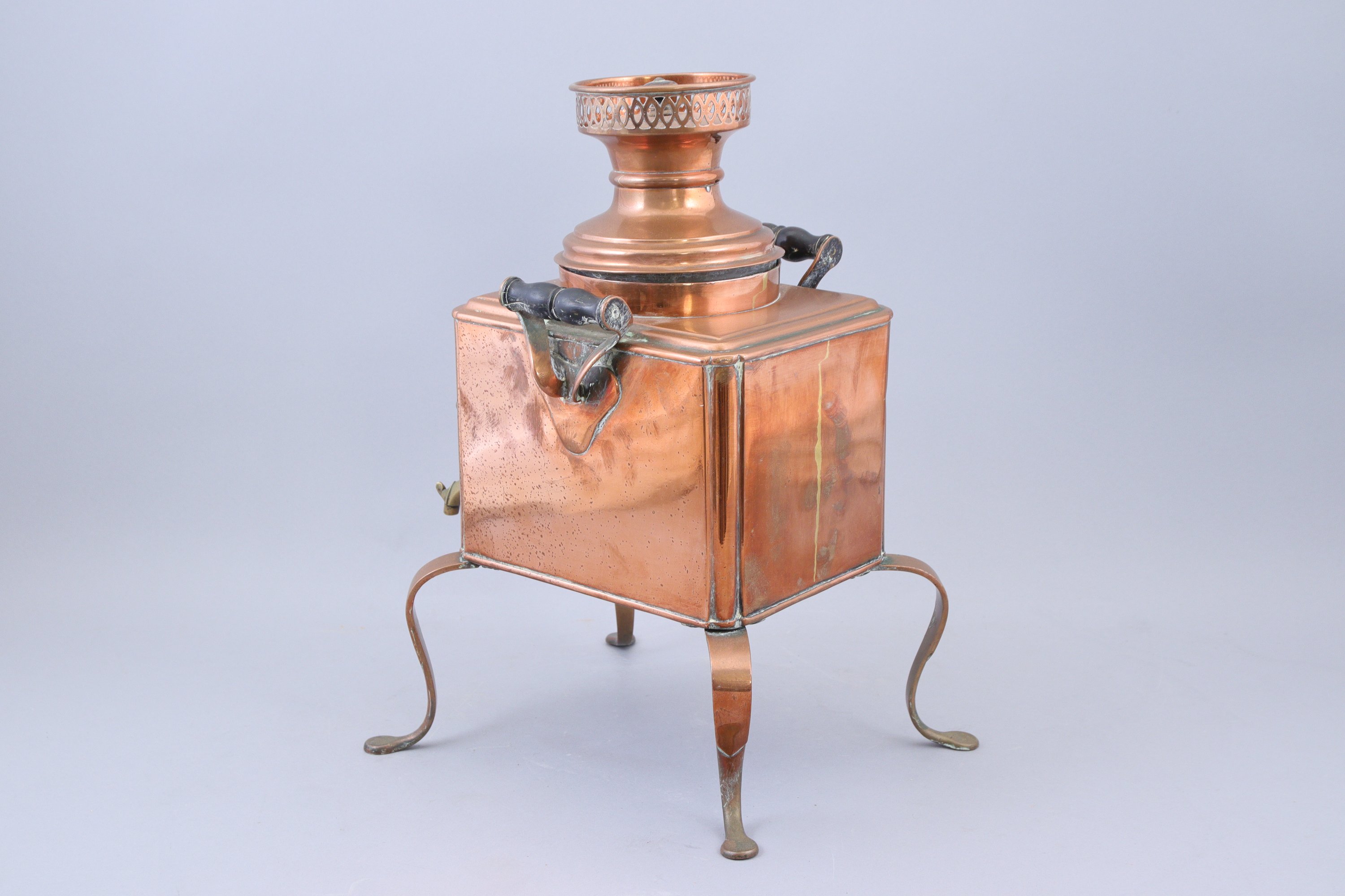 Joint : un samovar en cuivre et métal cuivré, le réservoir de section rectangulaire reposant sur quatre pieds courbés.