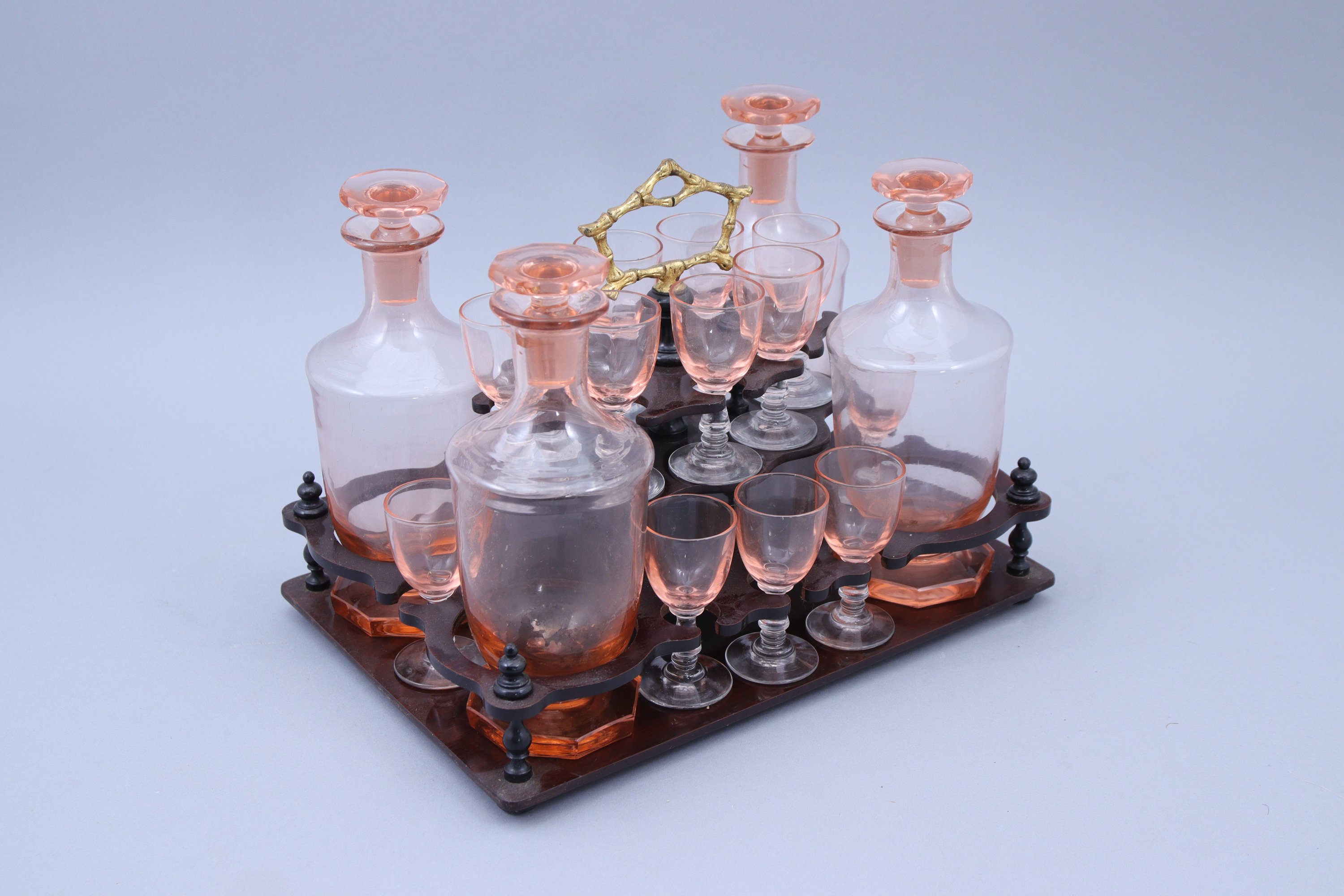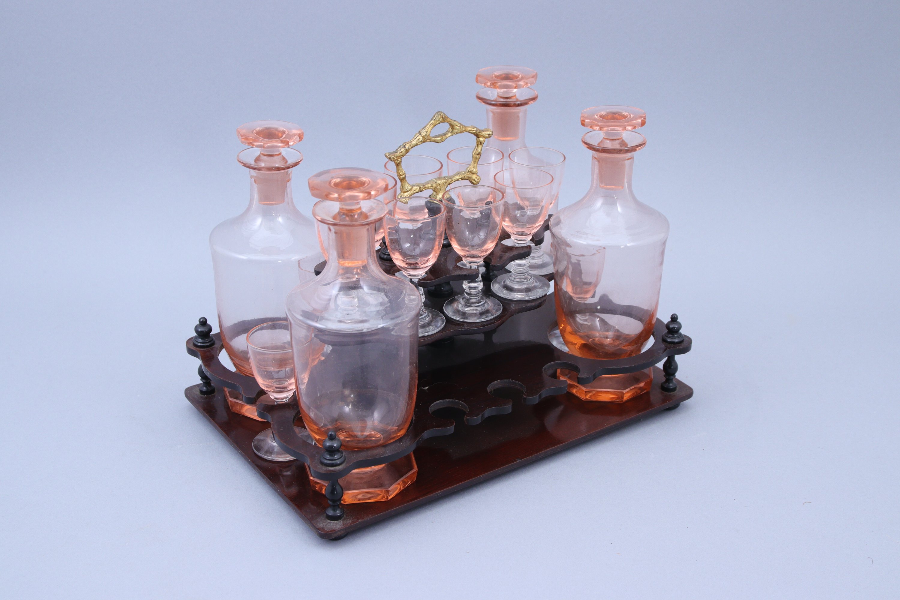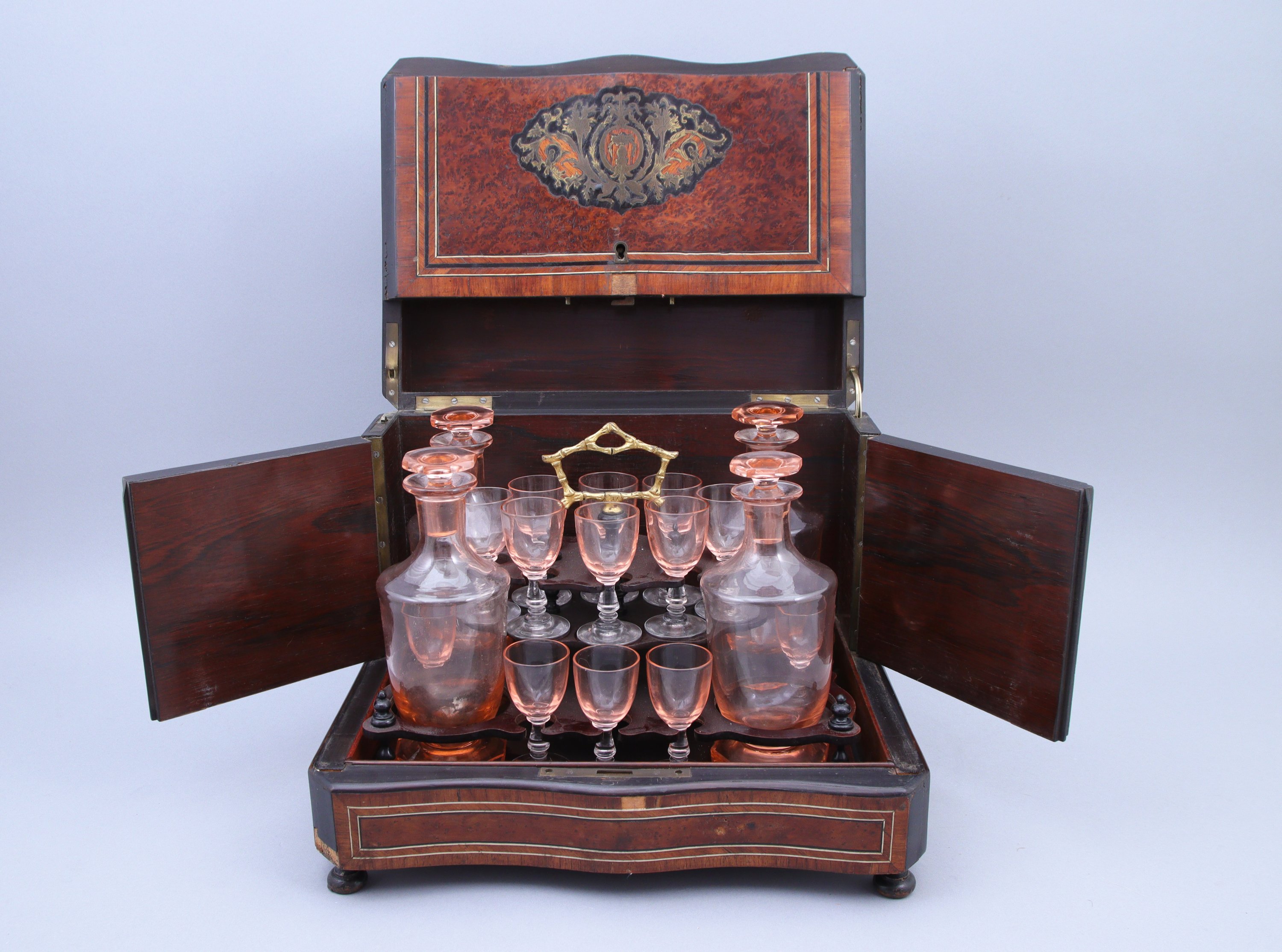 en placage de loupe et de bois de rose, à décor central de compositions végétale encadrées de filets et monogrammées "S". Elle s'ouvre par un système d'abbatant en façade et de volet sur les côté. Repose sur des pieds boules applatis. Intérieur amovible formant un service en verre teinté saumon comportant quatre carafes et treize verres