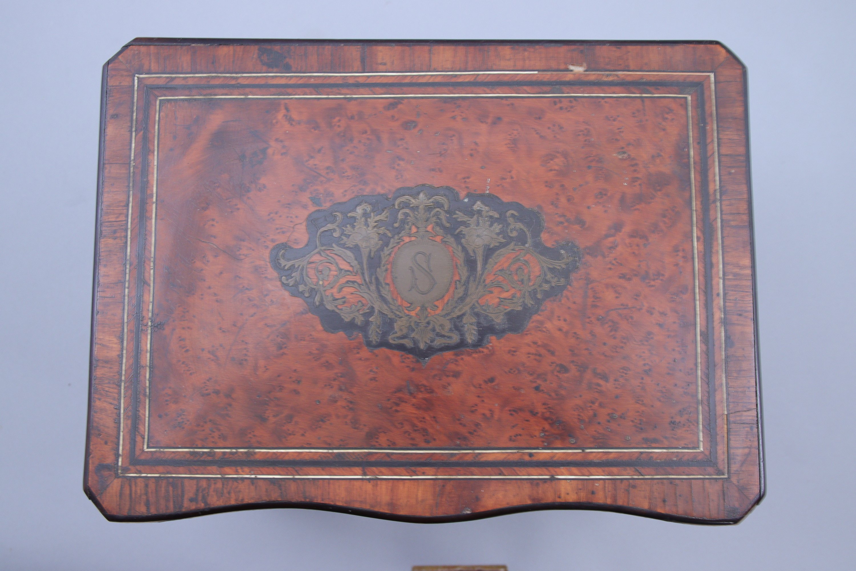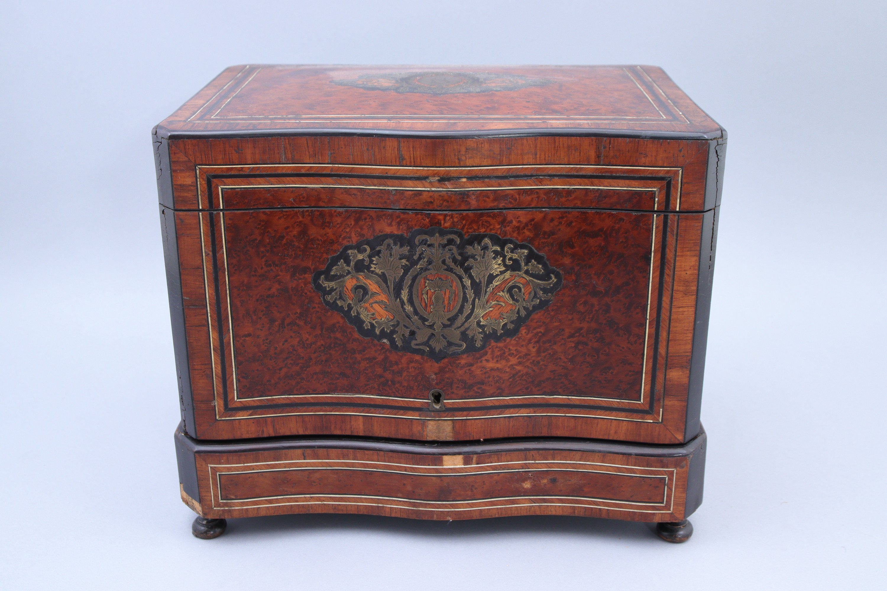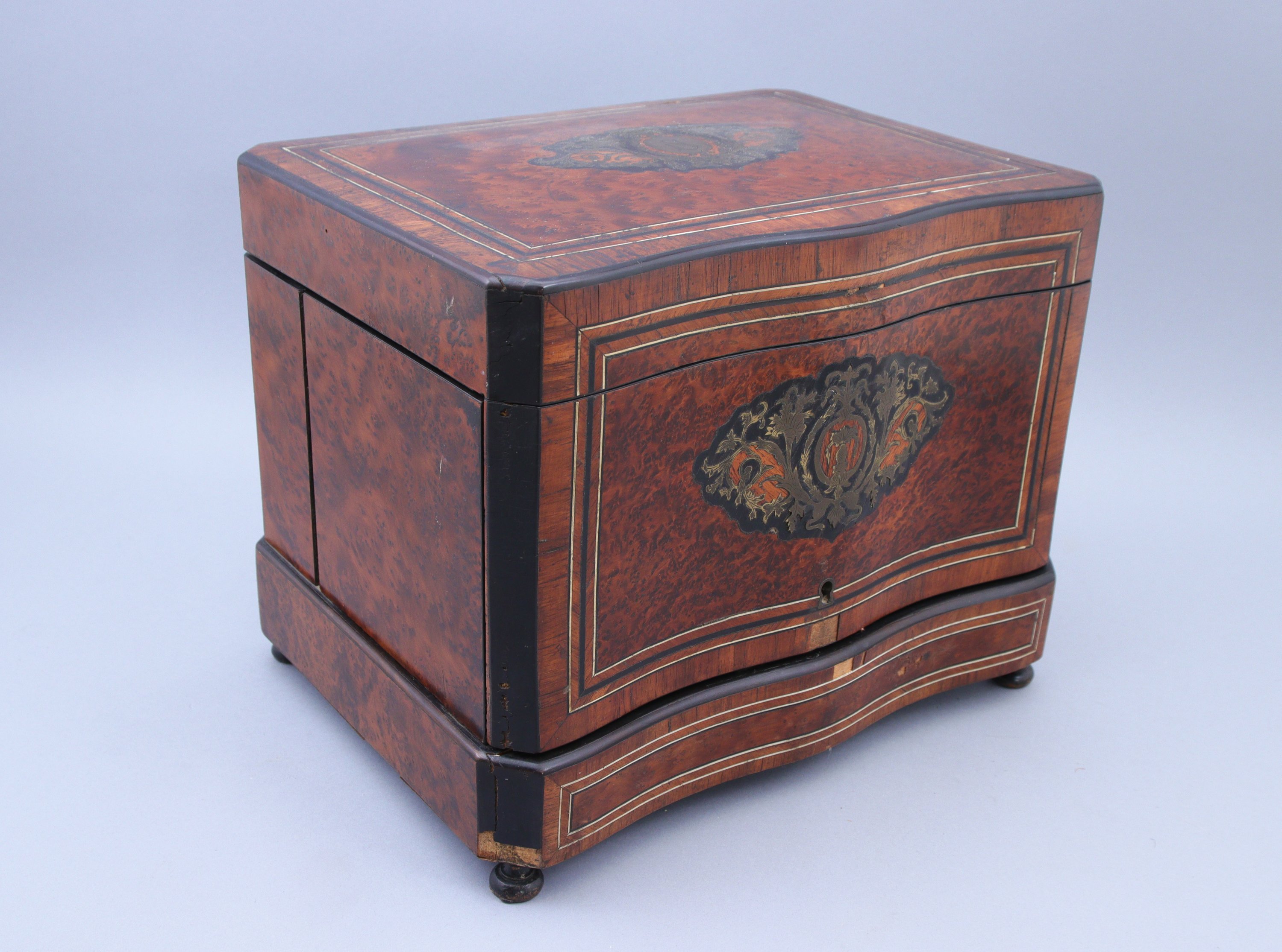 en placage de loupe et de bois de rose, à décor central de compositions végétale encadrées de filets et monogrammées "S". Elle s'ouvre par un système d'abbatant en façade et de volet sur les côté. Repose sur des pieds boules applatis. Intérieur amovible formant un service en verre teinté saumon comportant quatre carafes et treize verres