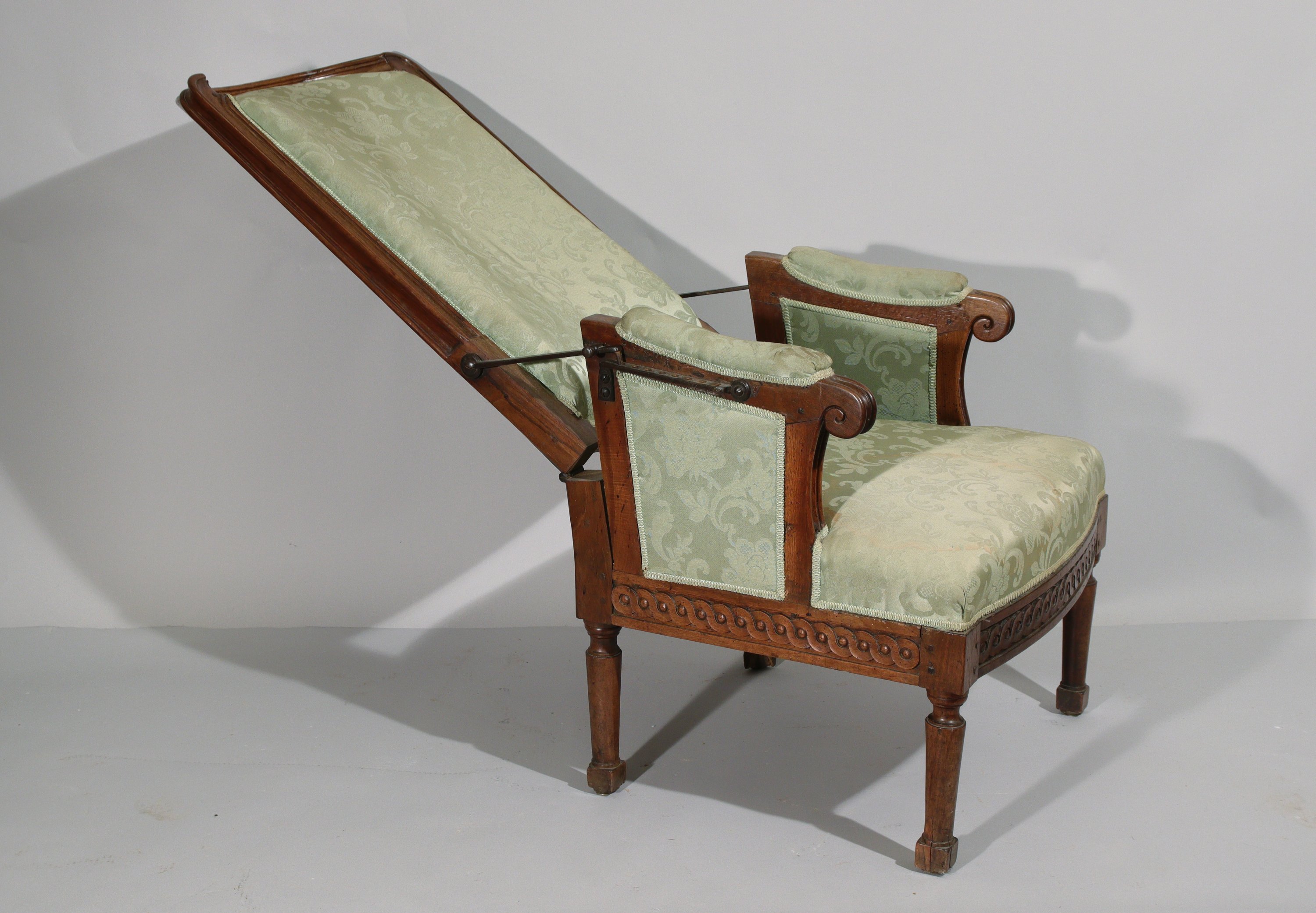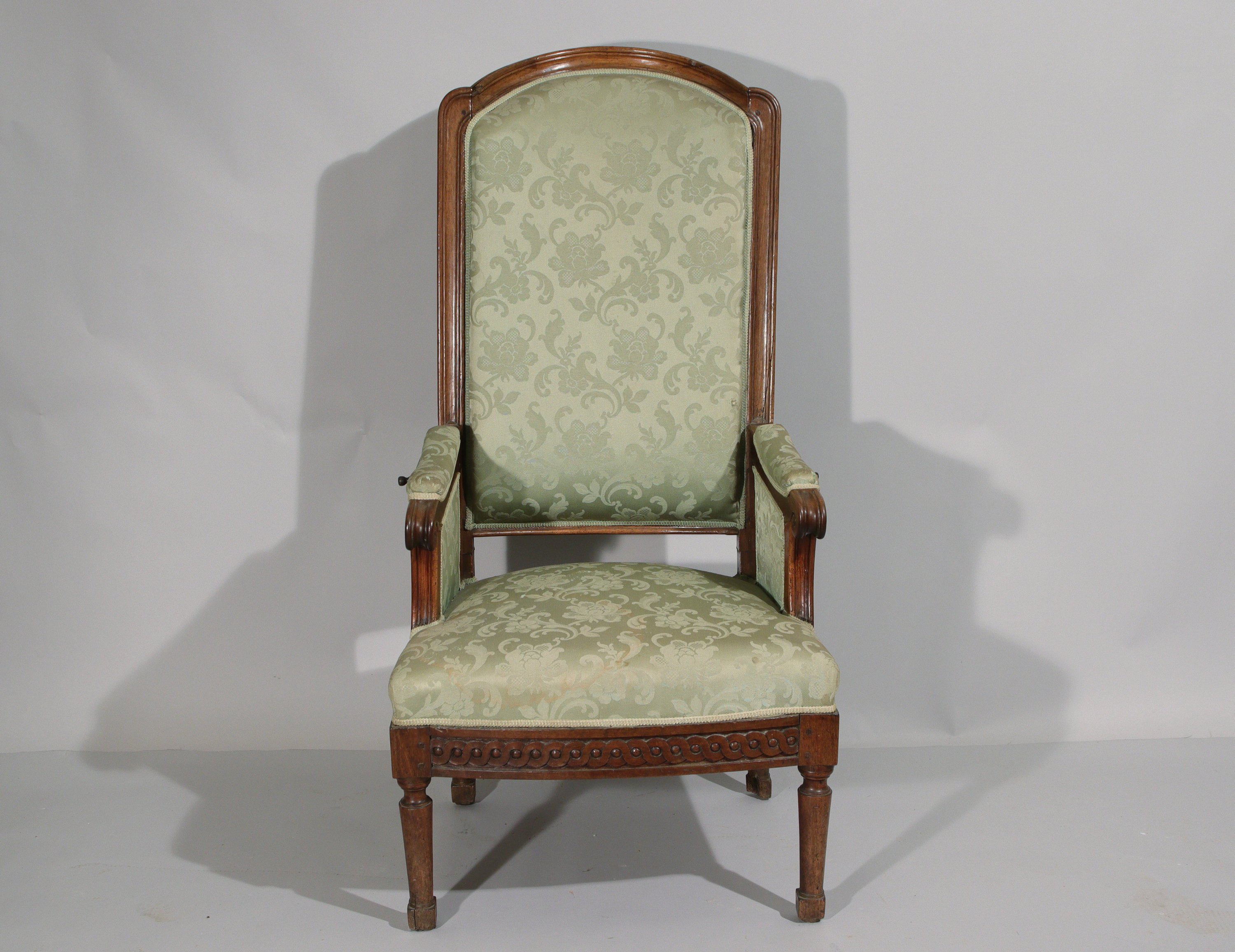 en noyer mouluré et sculpté à haut dossier inclinable. Les accotoirs à manchettes en retrait terminés par des volutes. La ceinture à décor de piastres. Il repose sur quatre pieds fuselés terminés par des sections carrées. Le mécanisme en fer, sur le côté de l'assise, permet huit positions d'inclinaison.