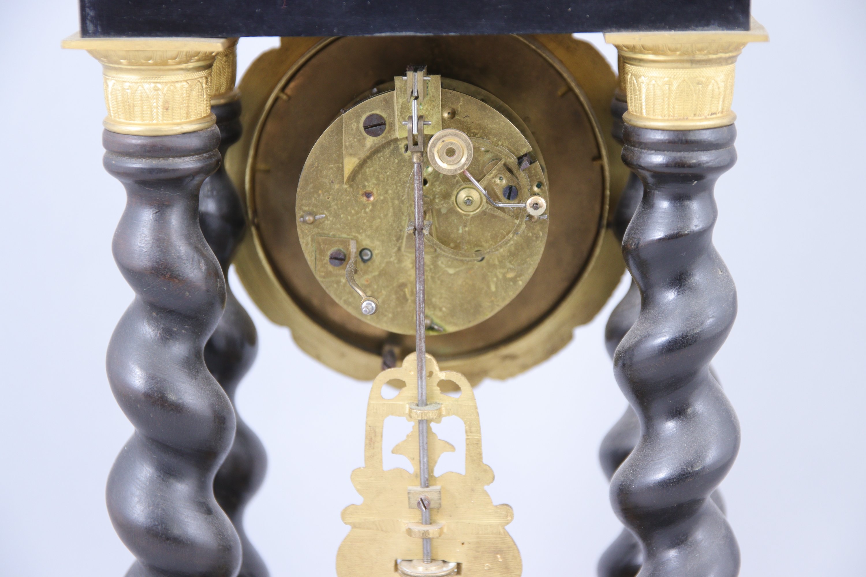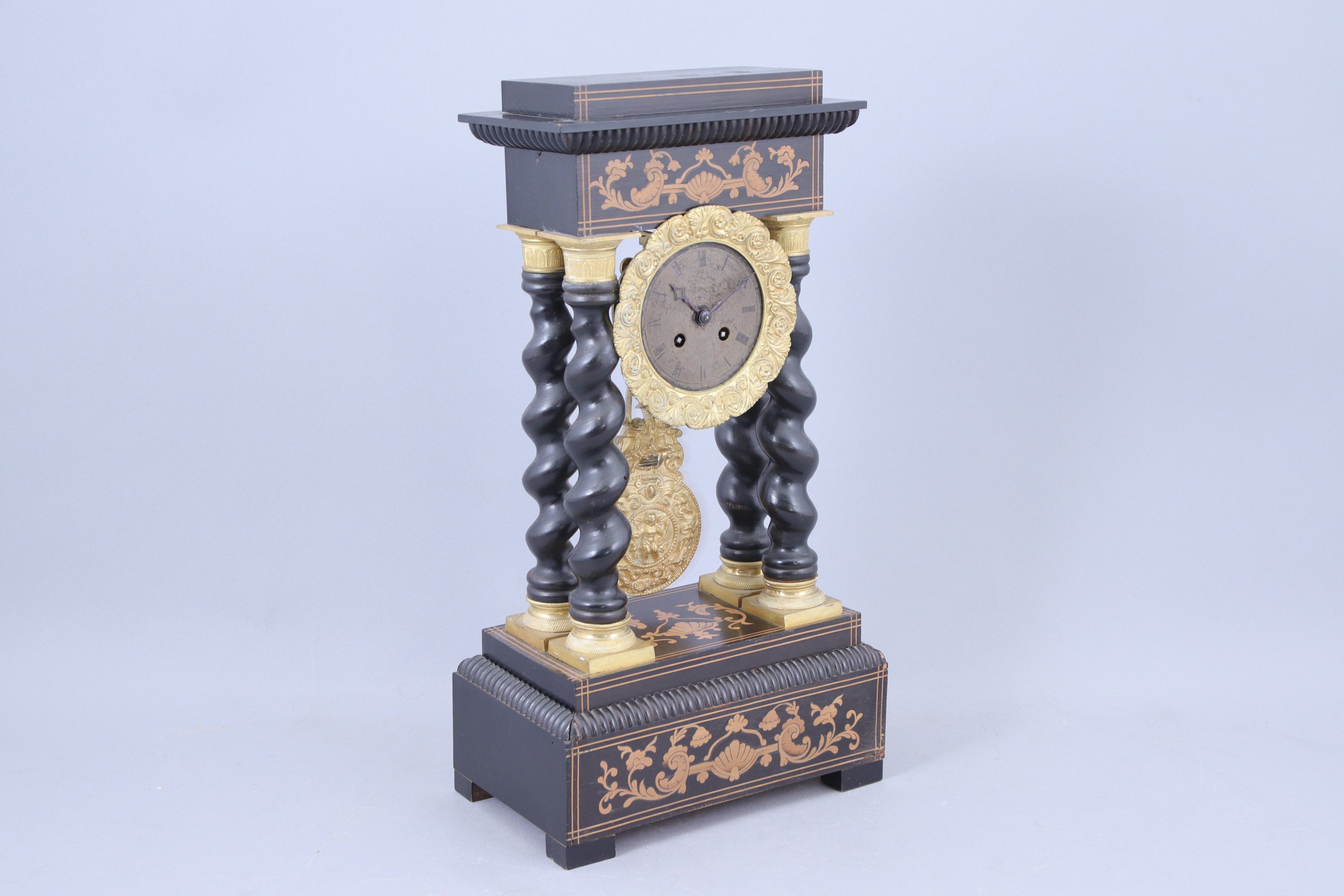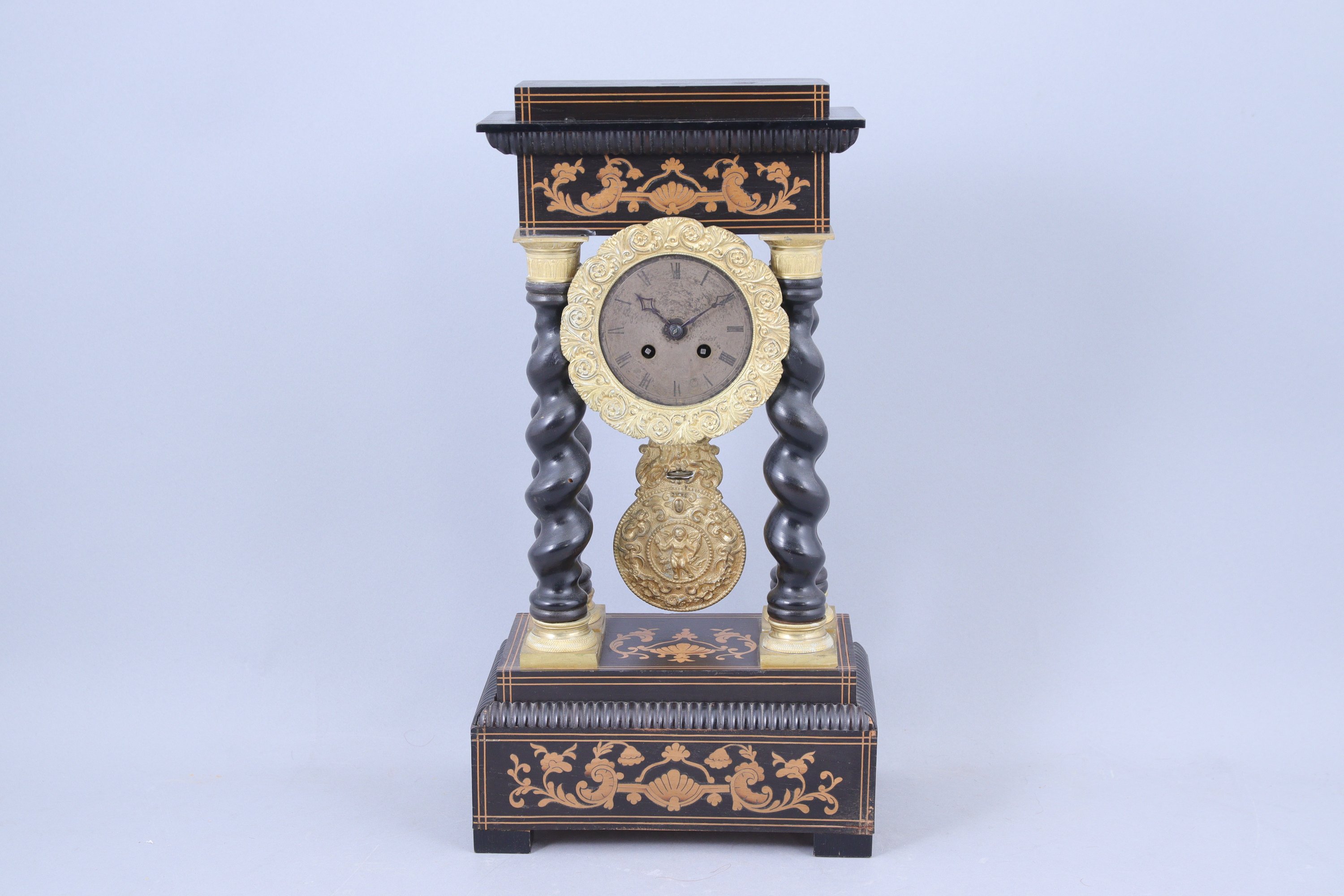 en poirier noirci avec incrustations de bois clairs et bronze doré. Le cadran argenté et guilloché indique les heures en chiffres romains. Les montants sont en forme de colonnes torses avec des chapiteaux à décor de feuilless d'eau et des bases à décor de croisillons, riche décor en bronze doré sur le balancier. Les incrustations sur le fronton et la base à décor de rinceaux et de coquilles encadrés d'un double filet.