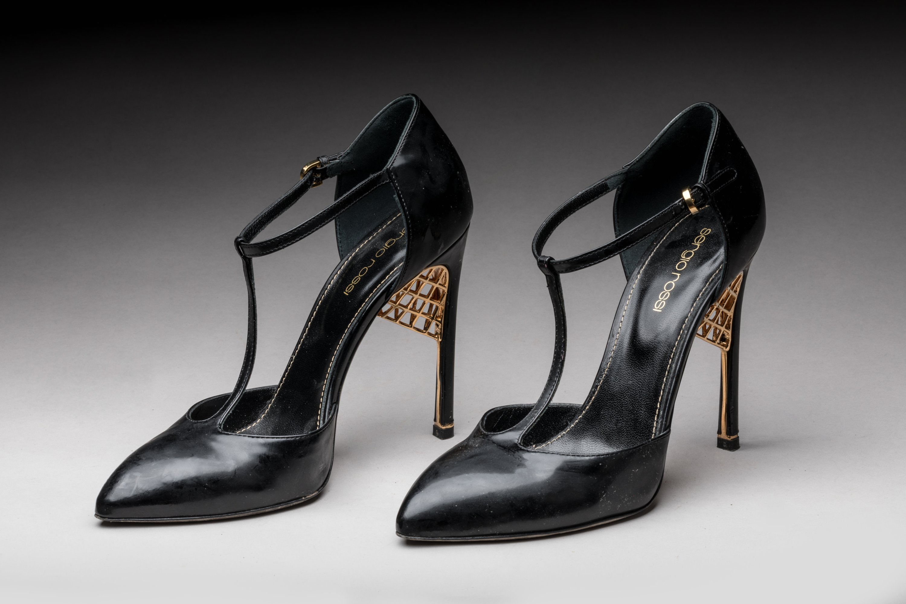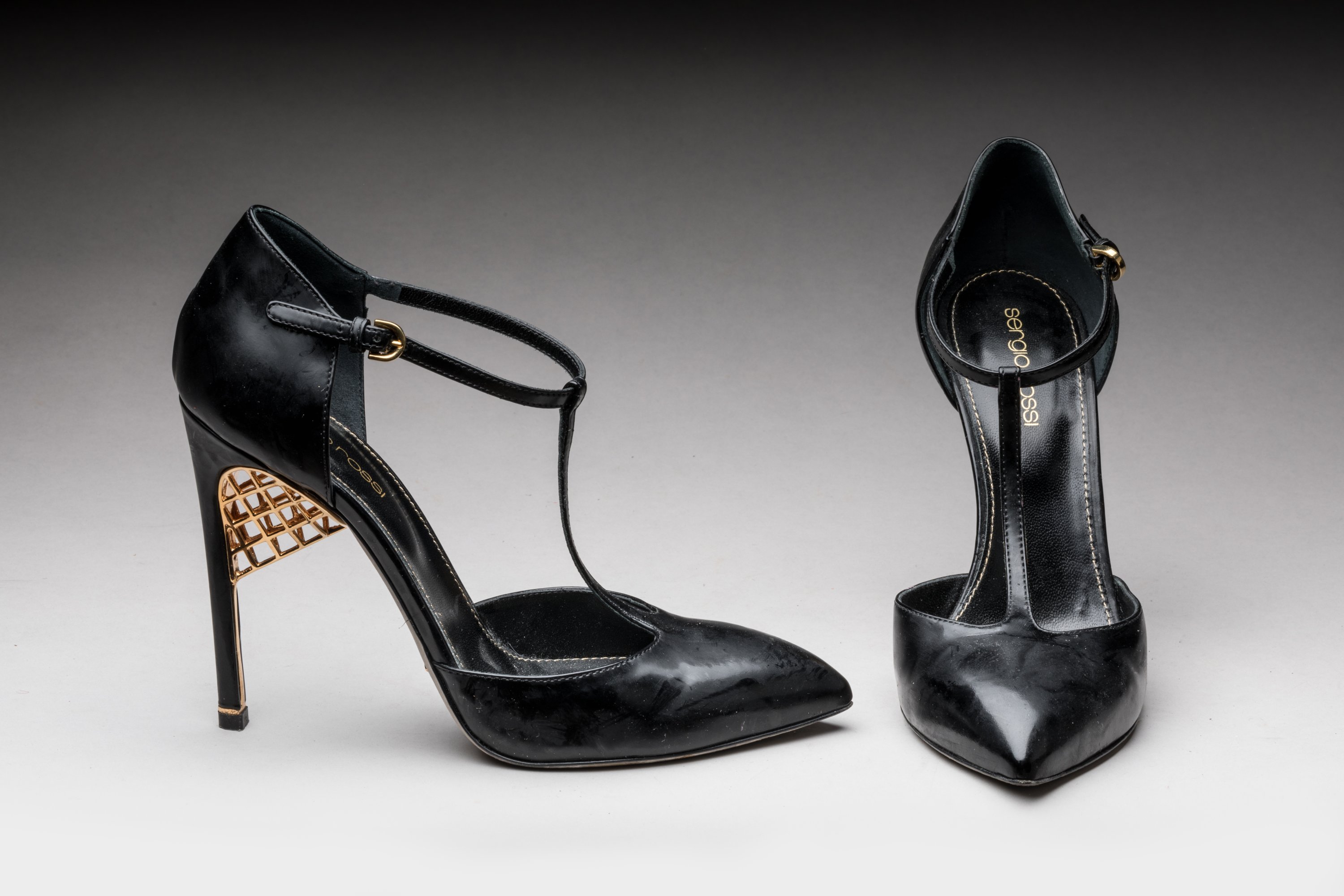 Talons aiguilles 11 cm, avec insert grillagé de couleur or et liseré or sur la longueur du talon.