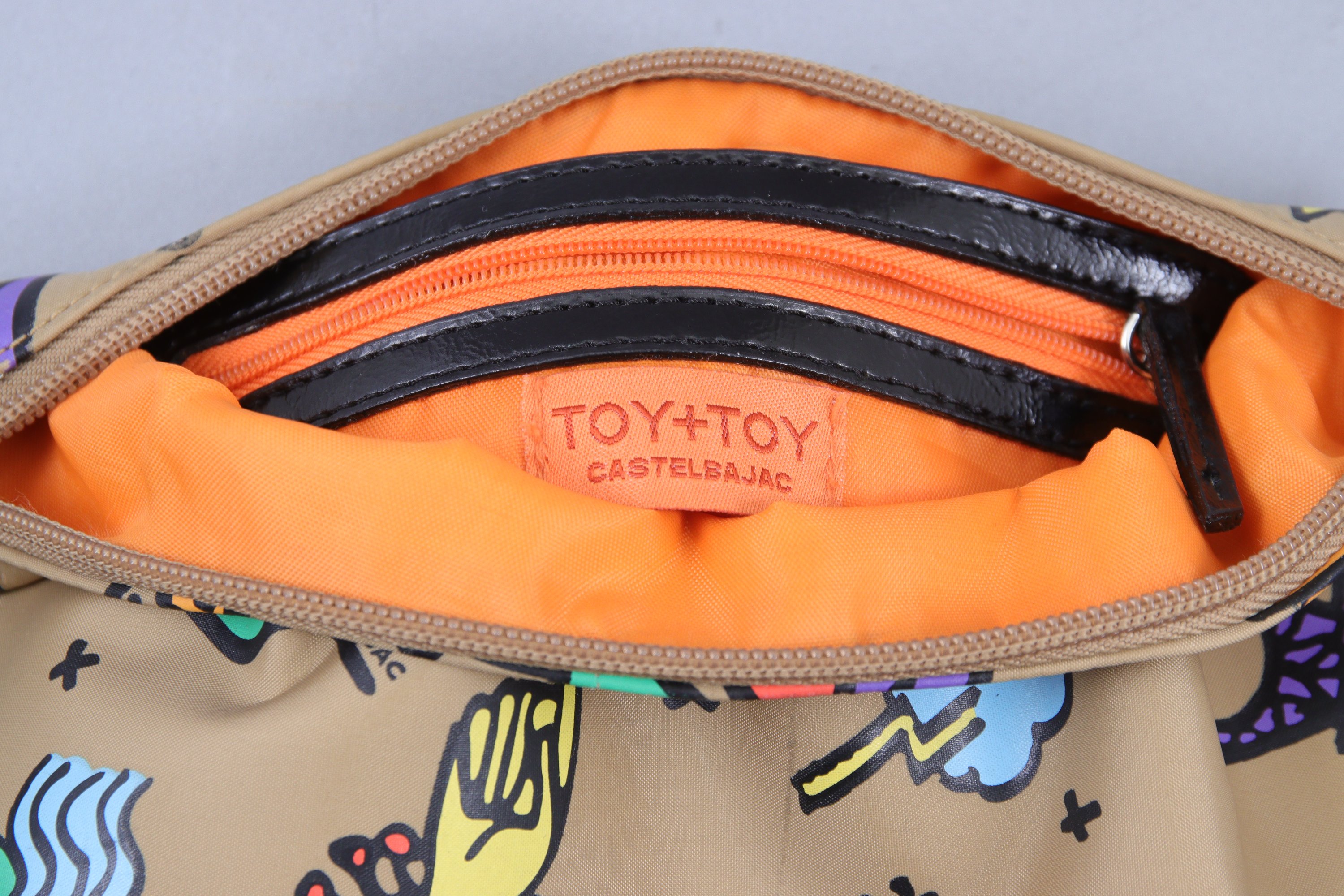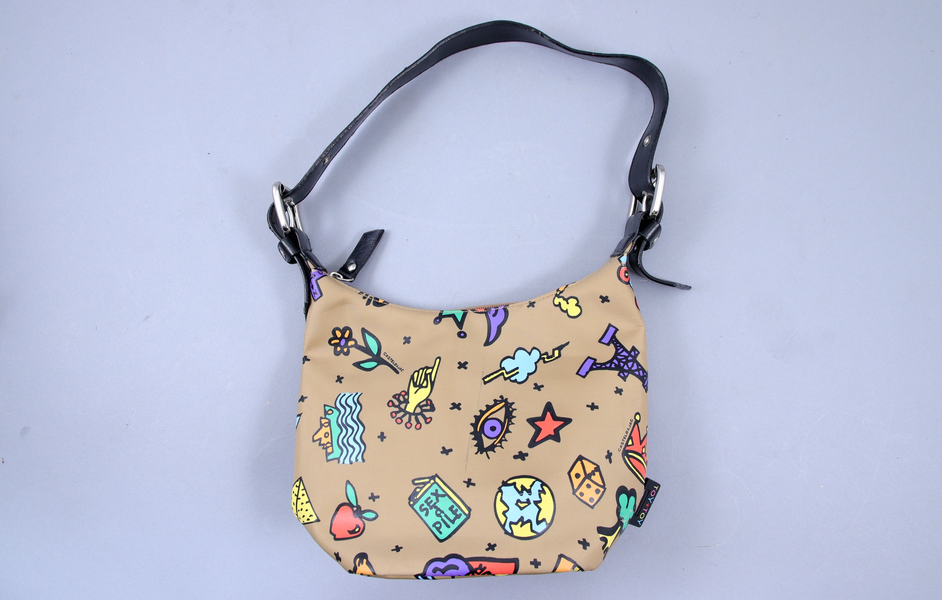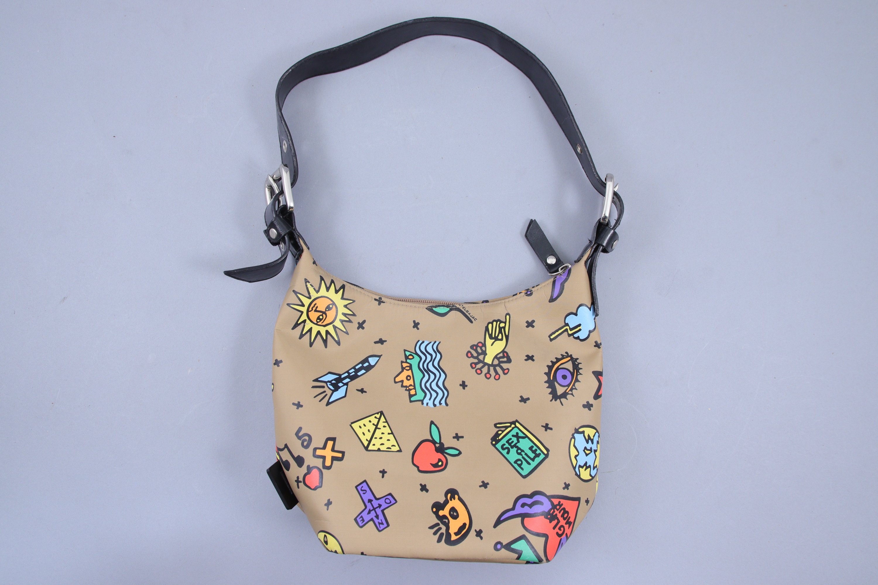 en toile de nylon imprimée de motifs figuratifs multicolores sur fond mastic. Anse noire. Etiquette cousue à l'intérieur.