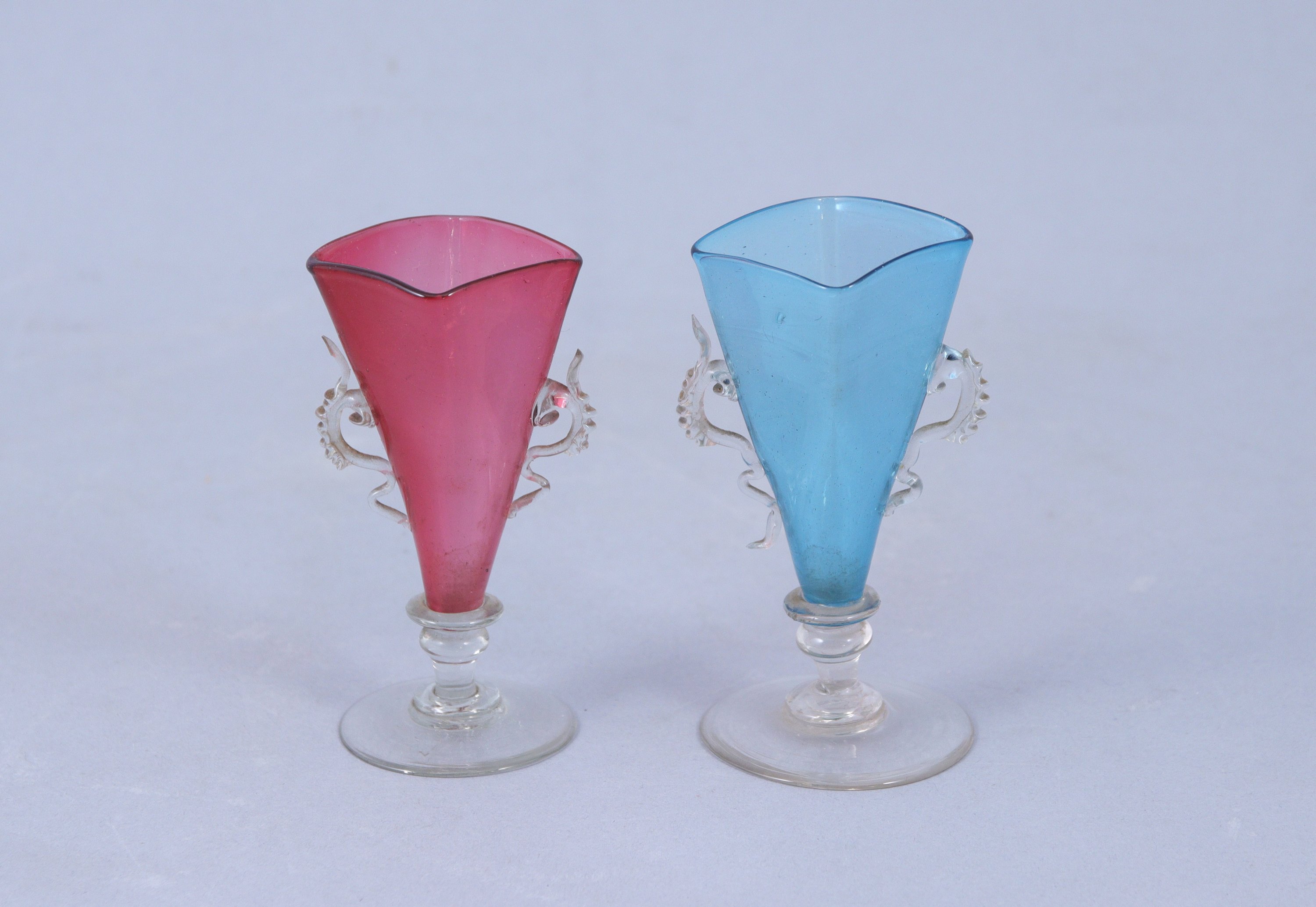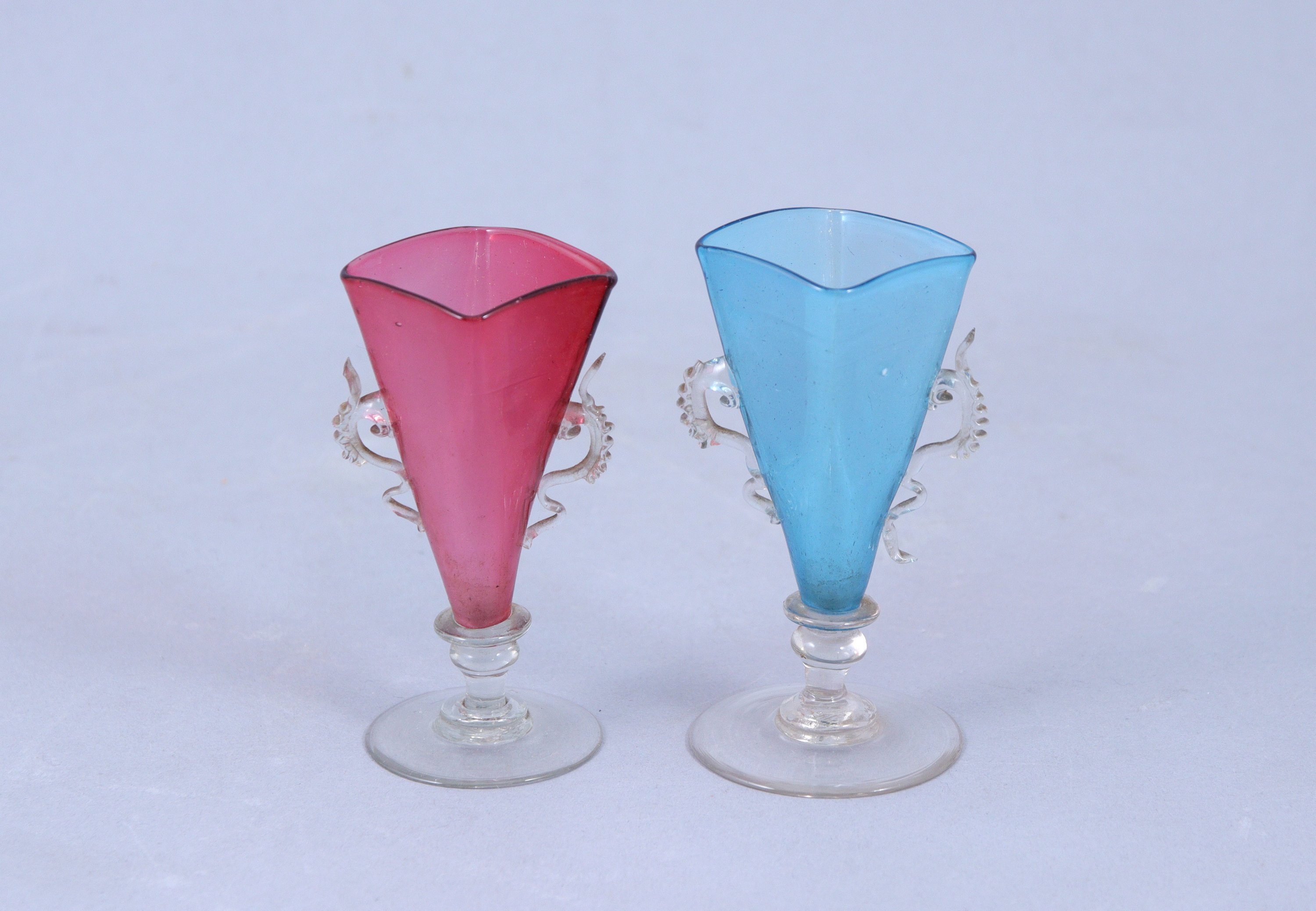 en cristal, le réceptacle pyramidal, carmin et bleu. Double motif décoratif incolore.