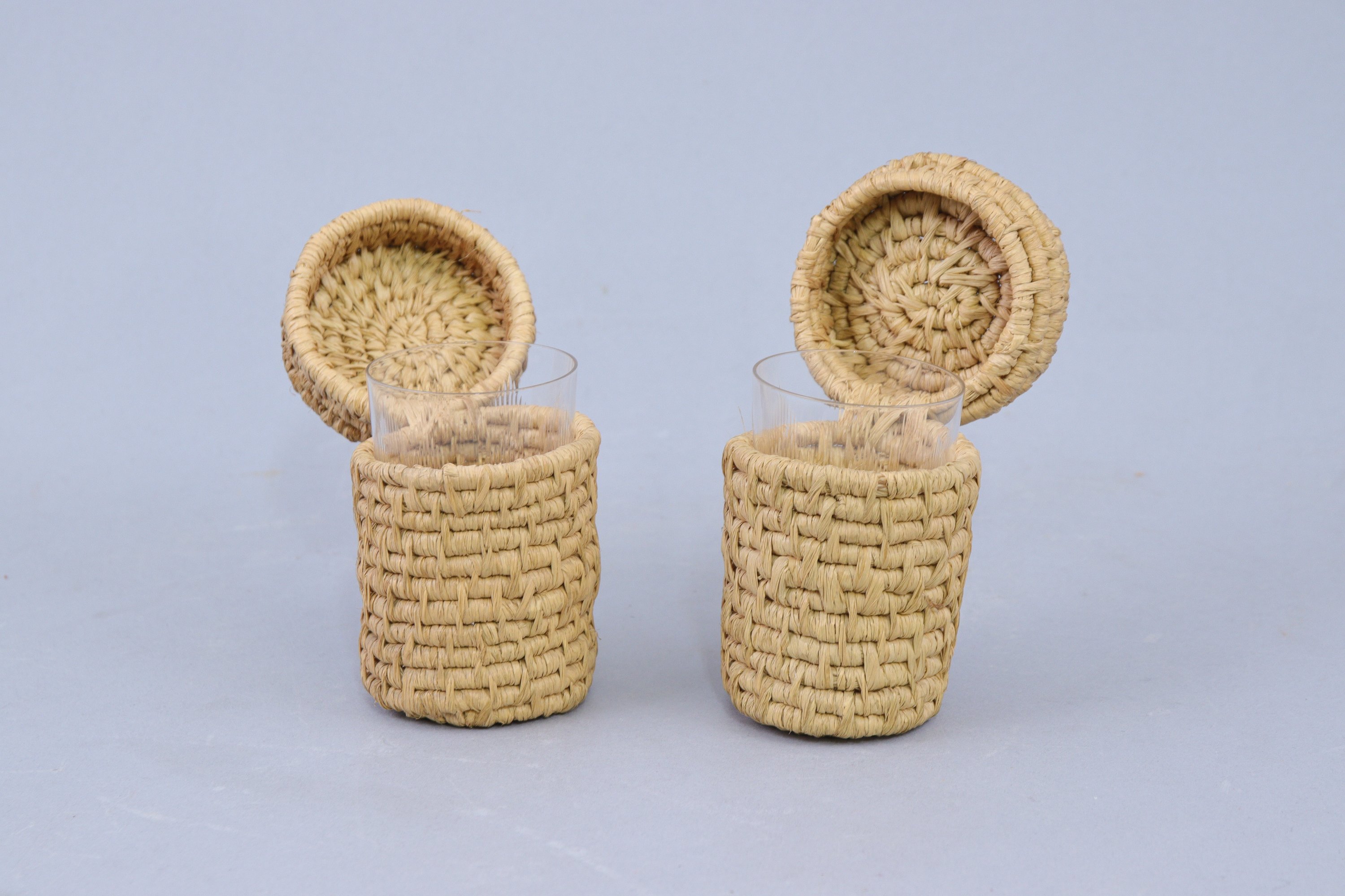 Dans leur étui en vannerie.