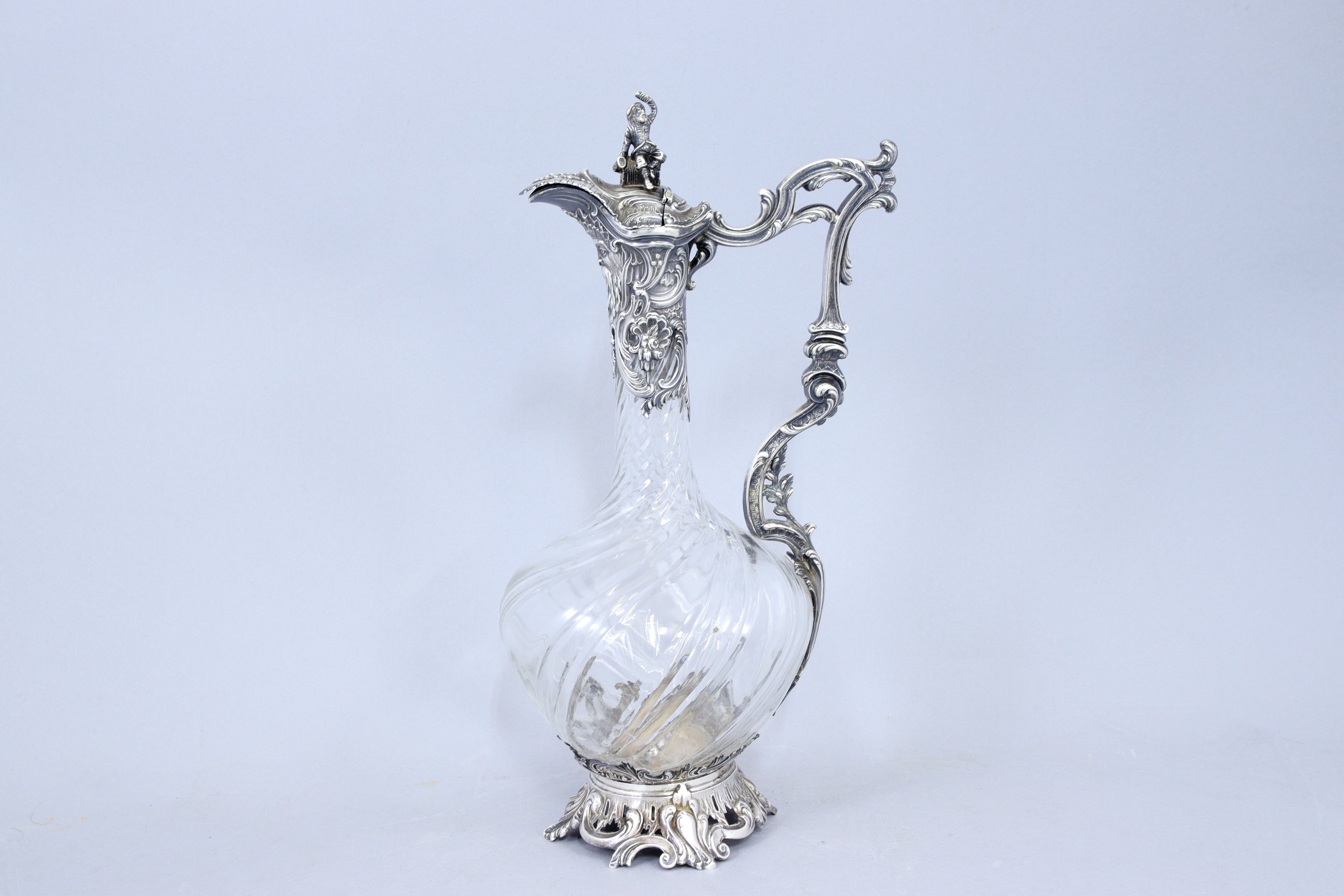 en cristal et argent. Le fretel à décor d’un homme sur un tonneau, le bec en forme d’une tête barbue. La panse torsadée, le pied ajouré à décor d’acanthe.