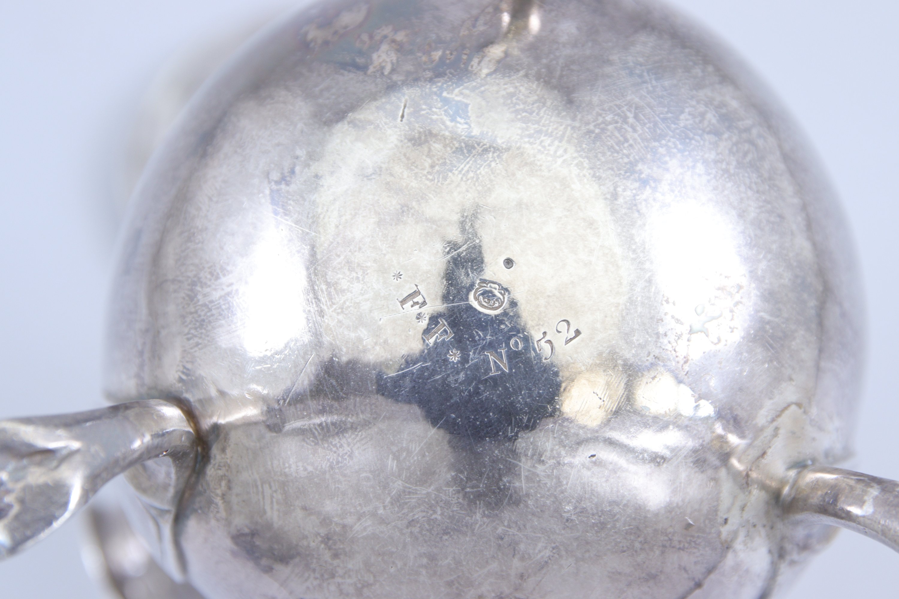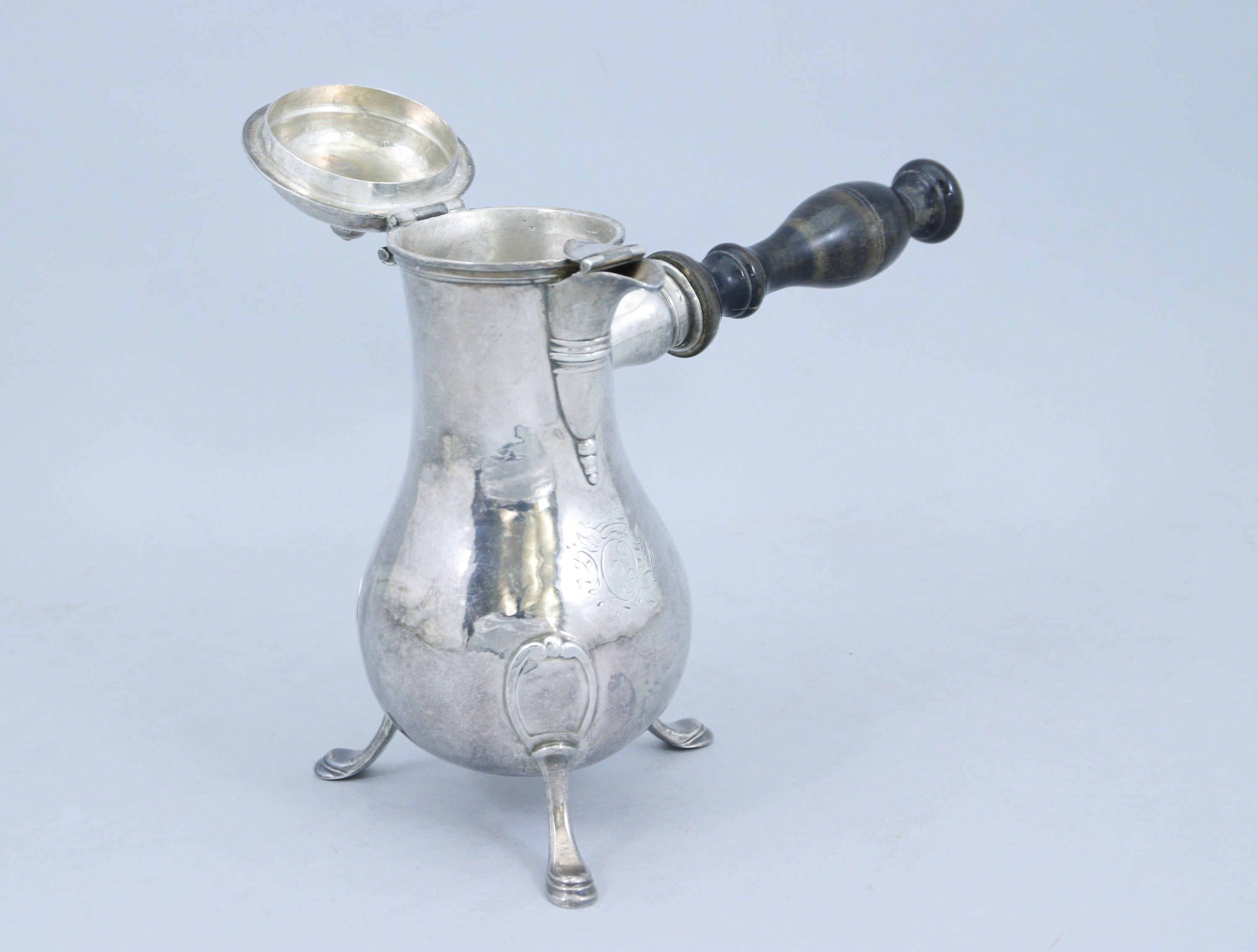 en argent. Le couvercle surmonté d'un fretel, le bec verseur fermé par un couvercle. La panse est gravée d'un cartouche dans lequel est inscrit un volatile sous une couronne. L'ensemble repose sur trois pieds. Manche en bois tourné et noirci.