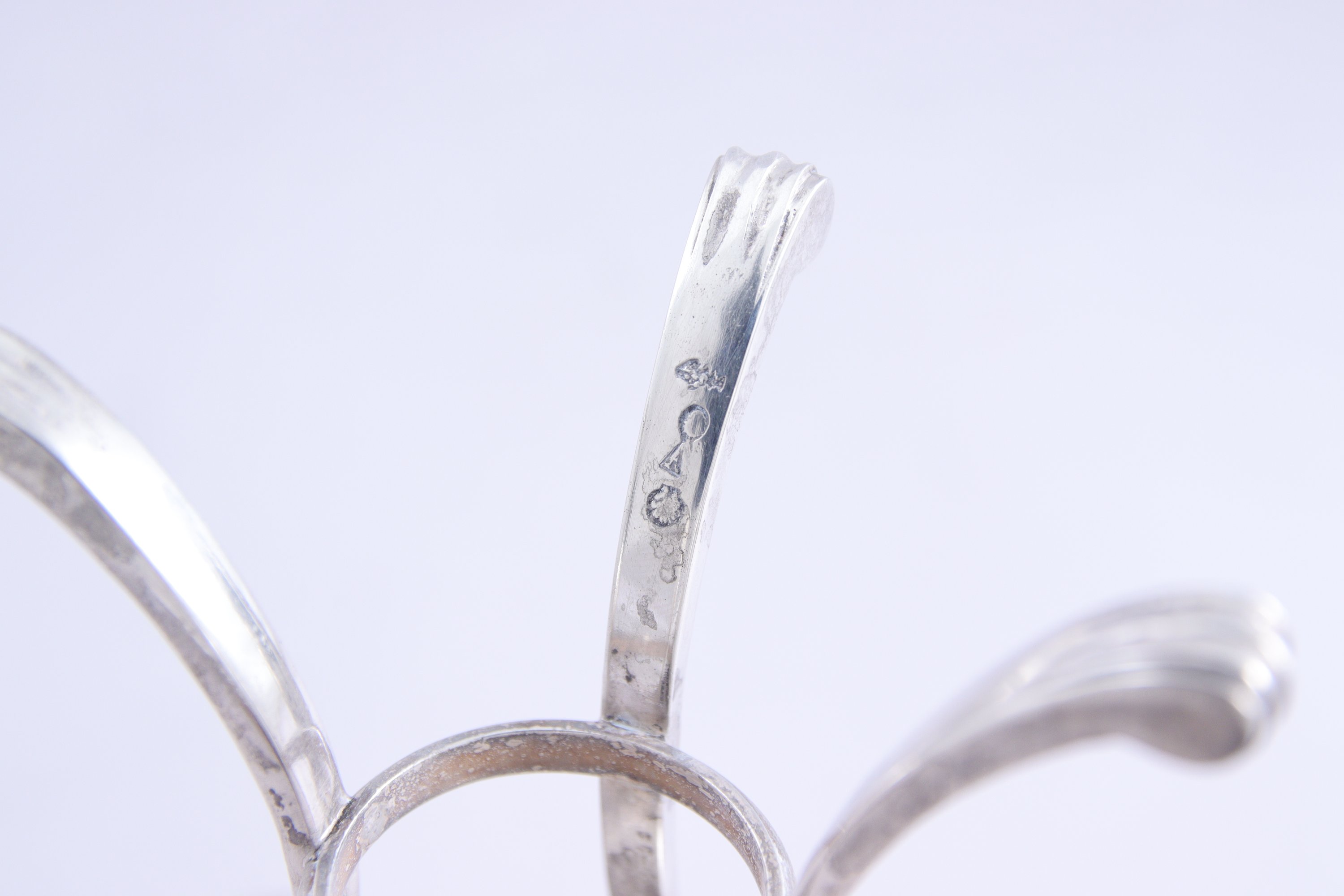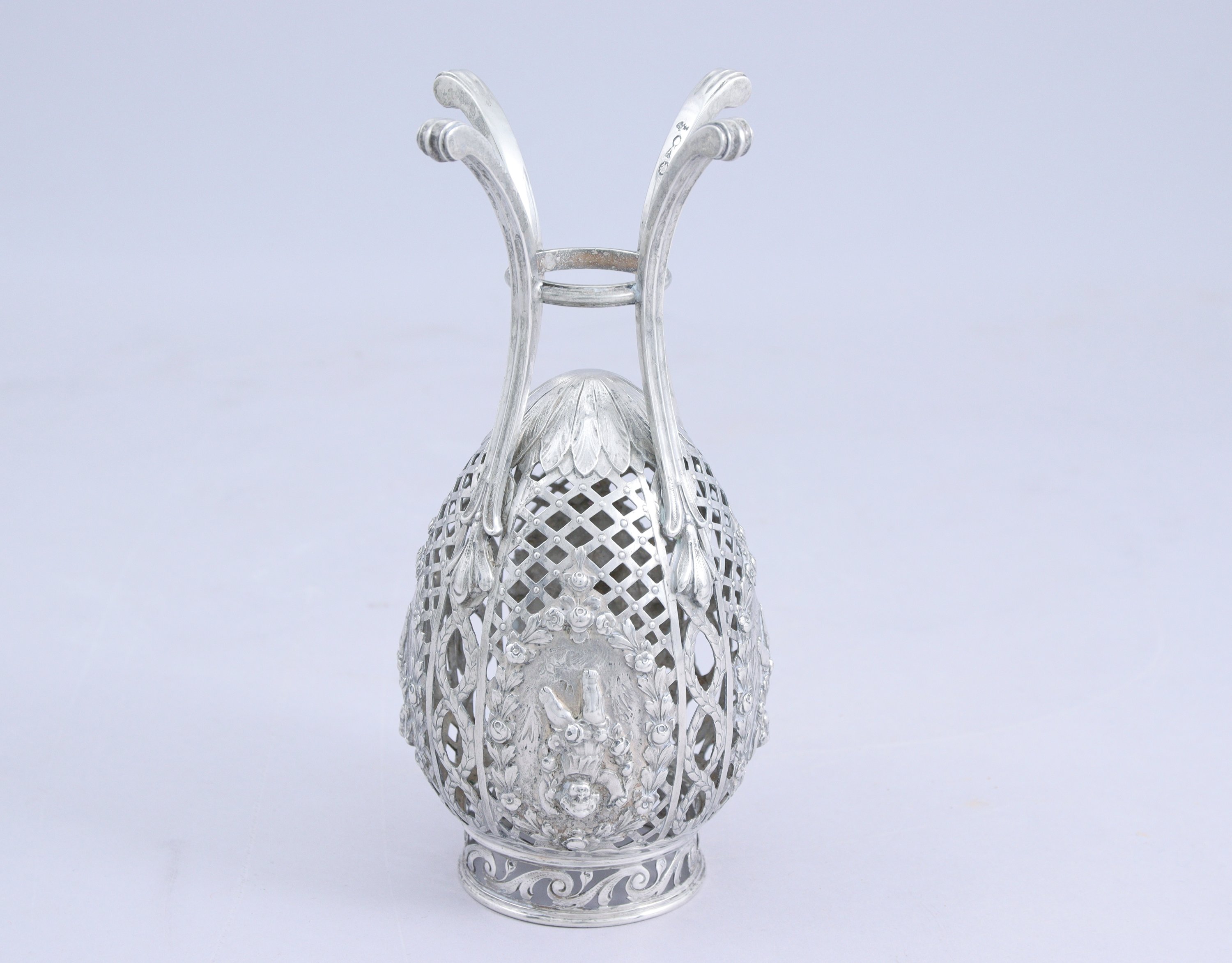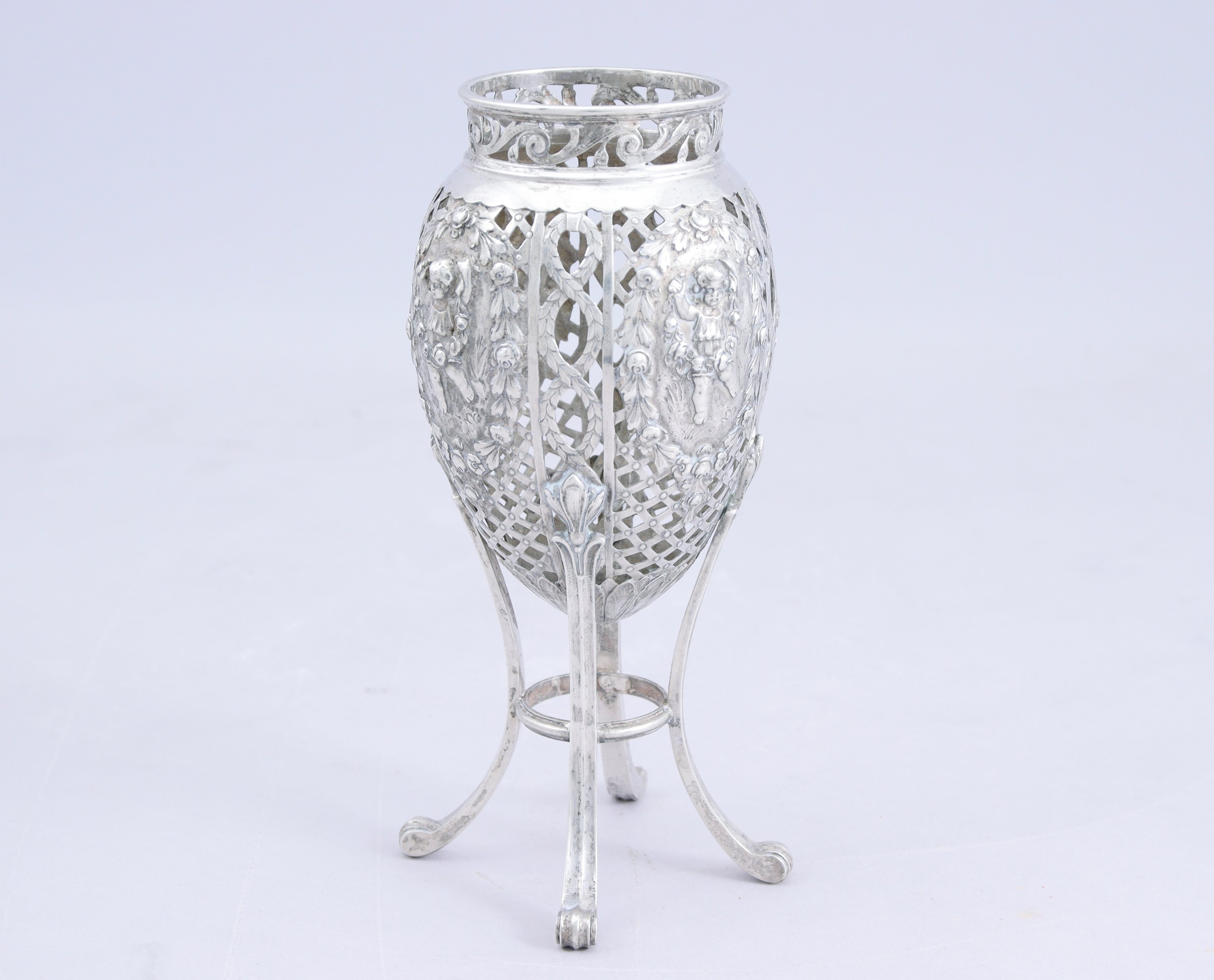en argent, composée de croisillons ajourés. Le col est décoré de rinceaux ajourés tandis que le corps développe un décor d'entrelacs feuillagés et de putti en léger relief portant des guirlandes de roses dans un médaillon de fleurs. L'ensemble repose sur quatre pieds cintrés se terminant en volutes et reliés par un anneau.