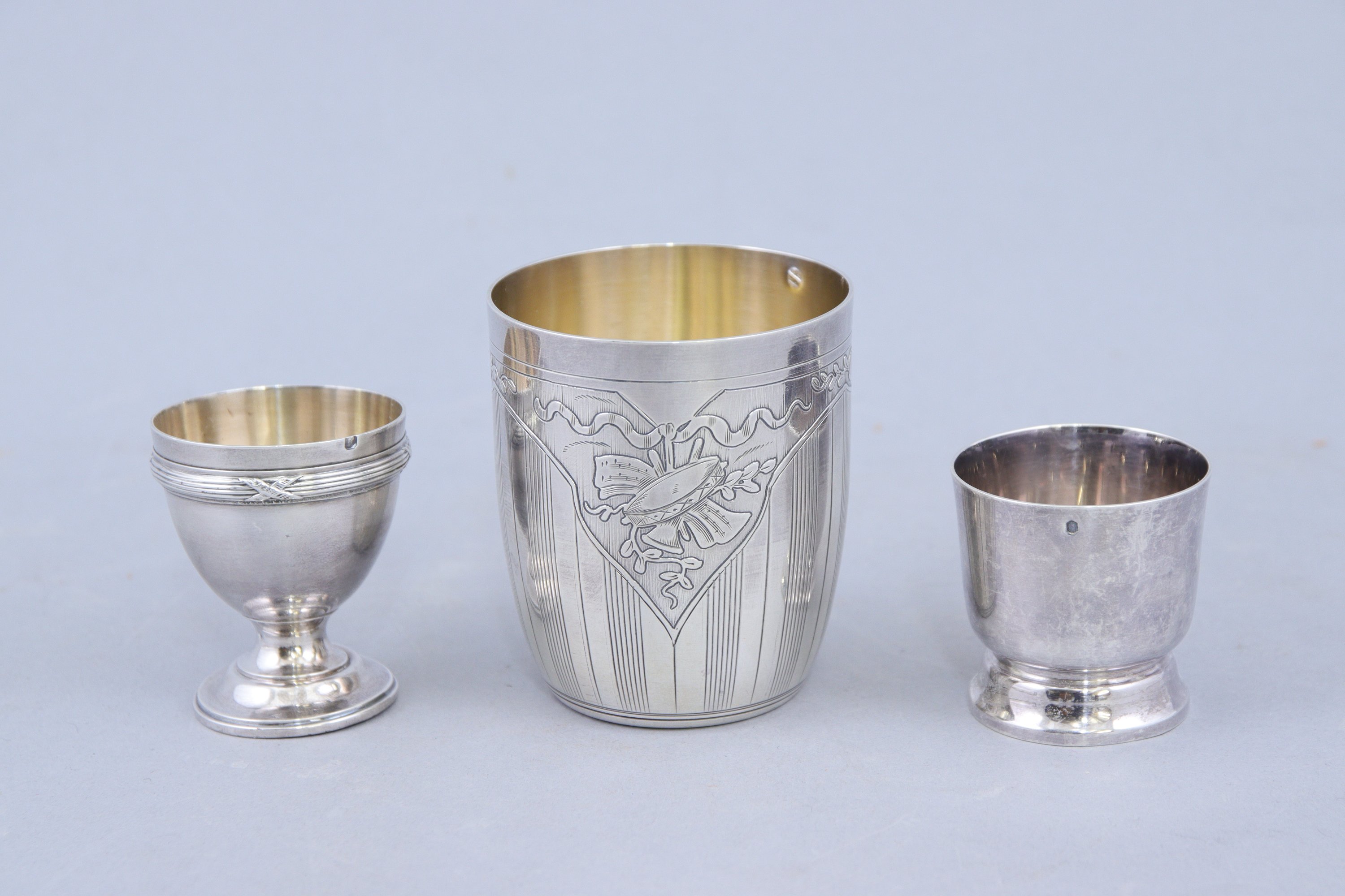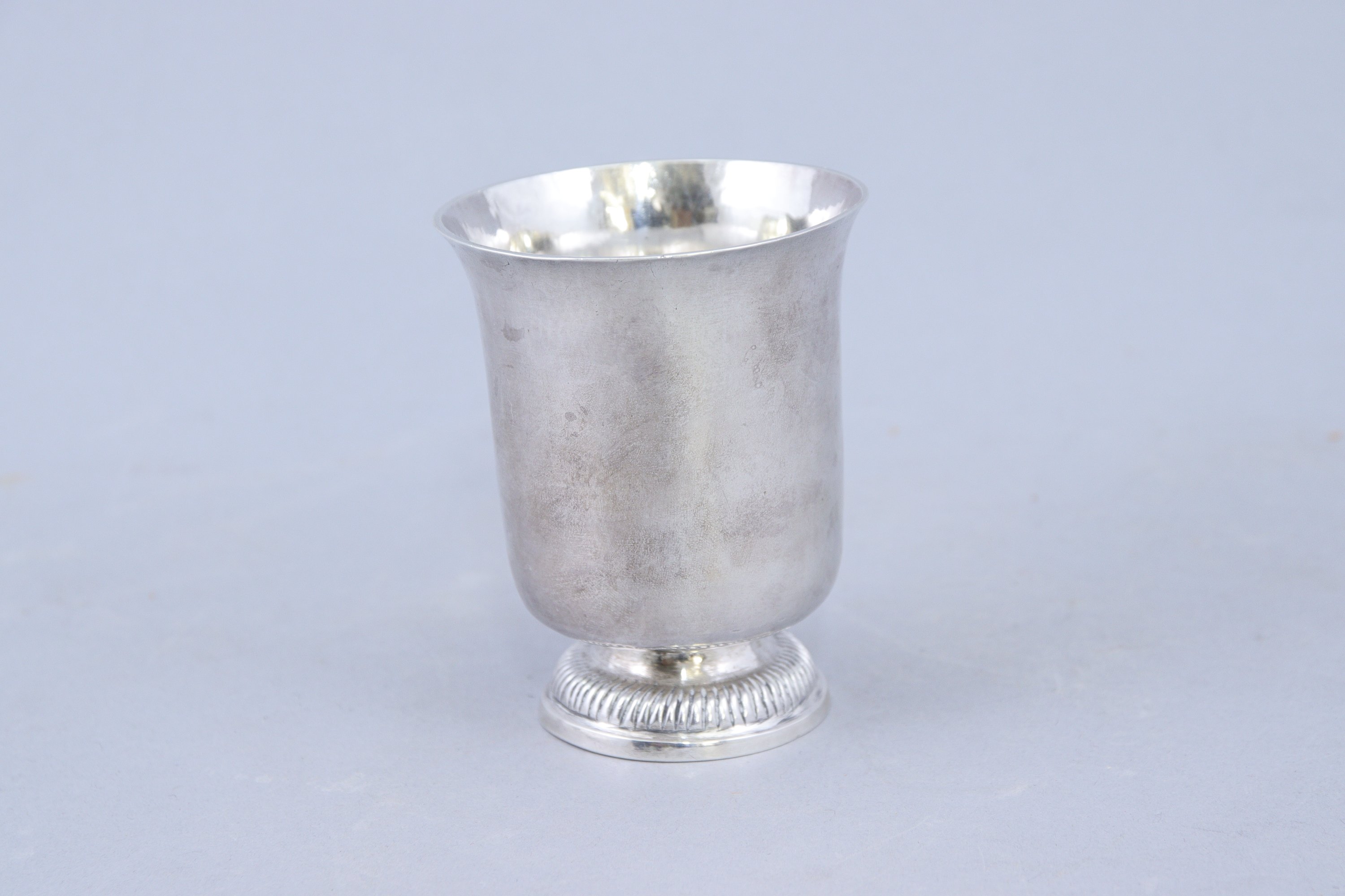 - Coquetier en argent, la lèvre à jonc noué. Poinçon Minerve 1er titre. Haut. 5 m. Poids 29 g.
