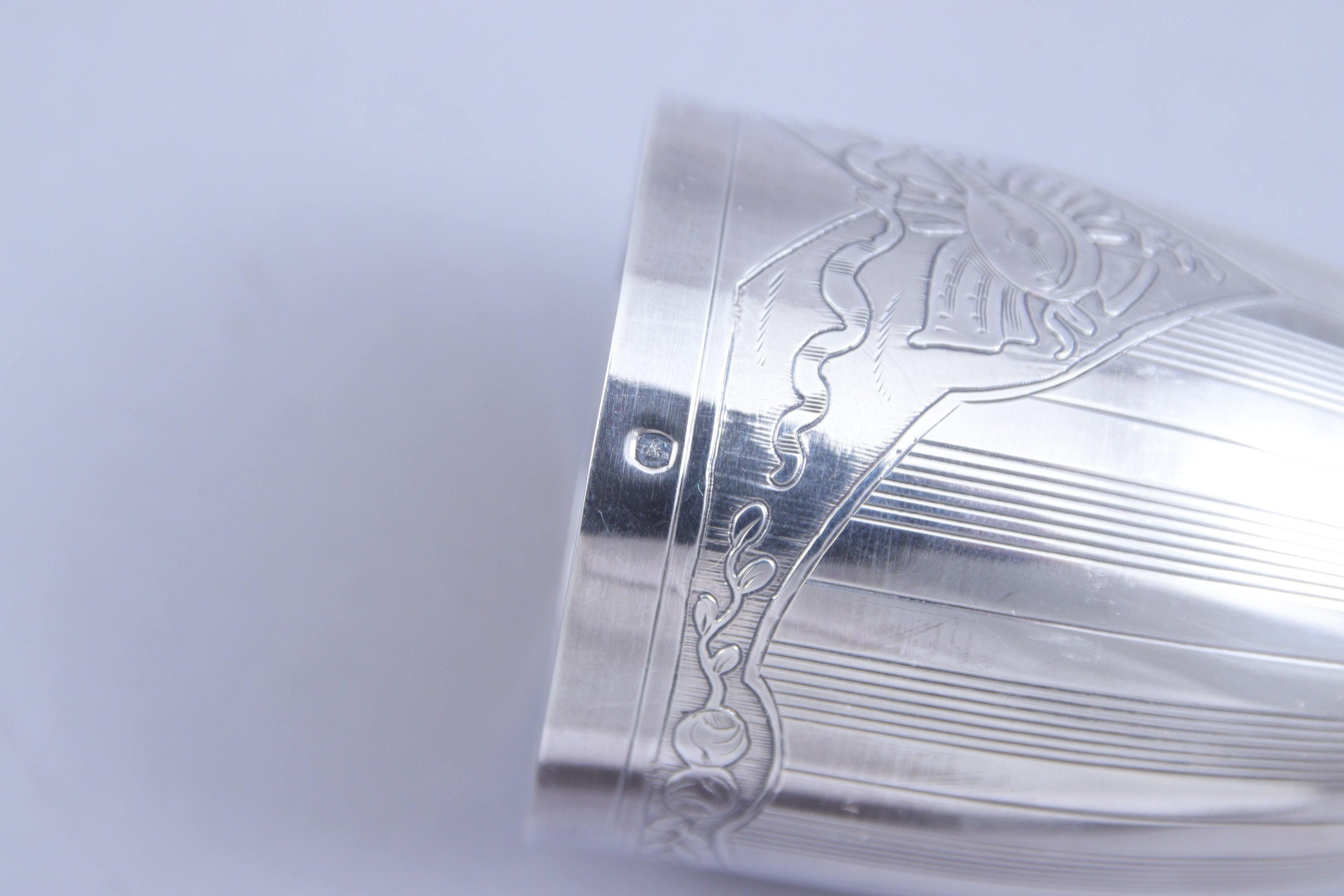 - Timbale en argent gravée d'instruments de musique et cannelures. Poinçon Minerve 2e titre. Haut. 7 cm. Poids 74 g.