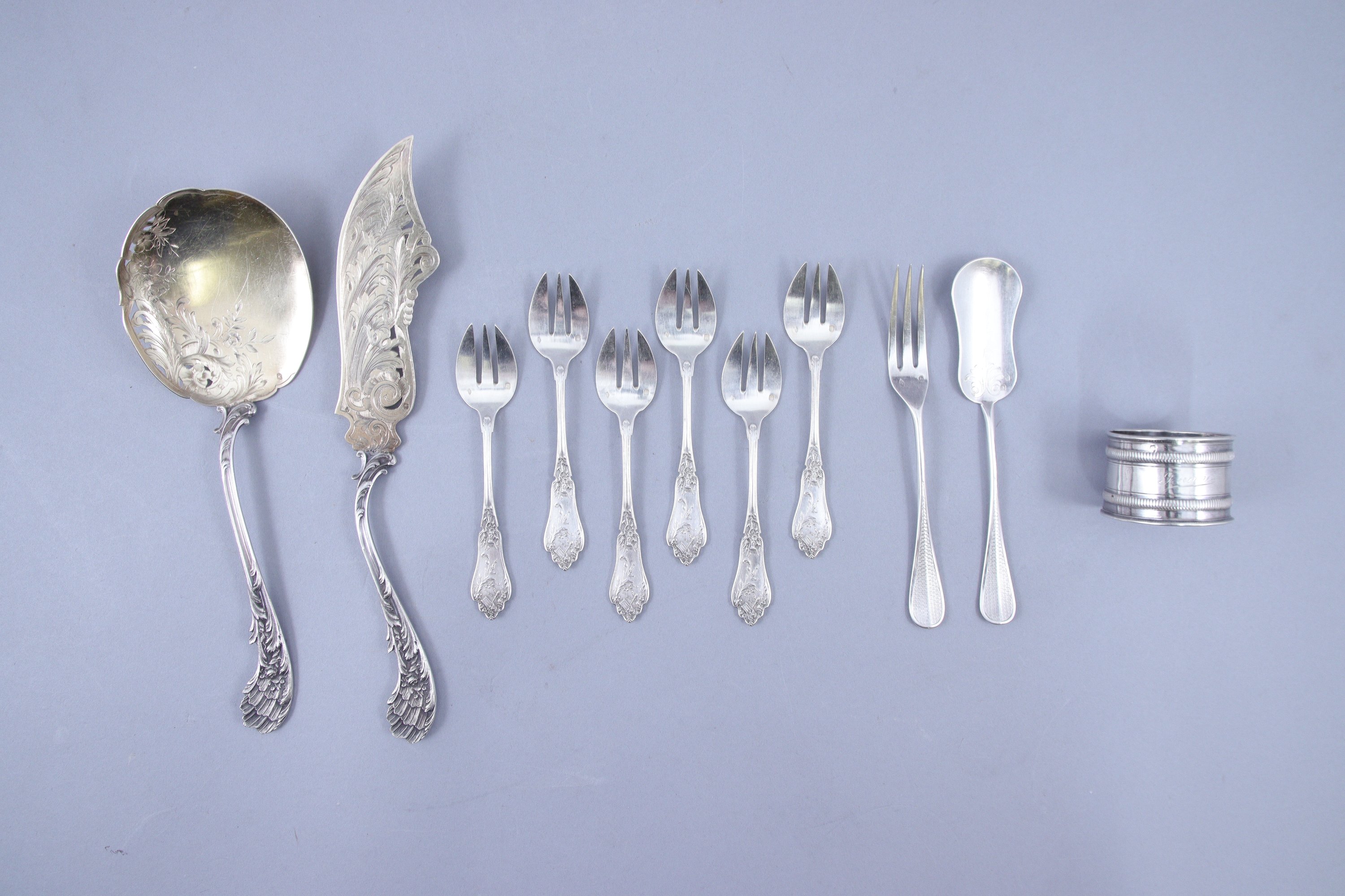 - Six fourchettes à huîtres en argent à décor rocaille. Poinçon Minerve 1er titre. Poids 135 g. Dans un écrin en cuir rouge.