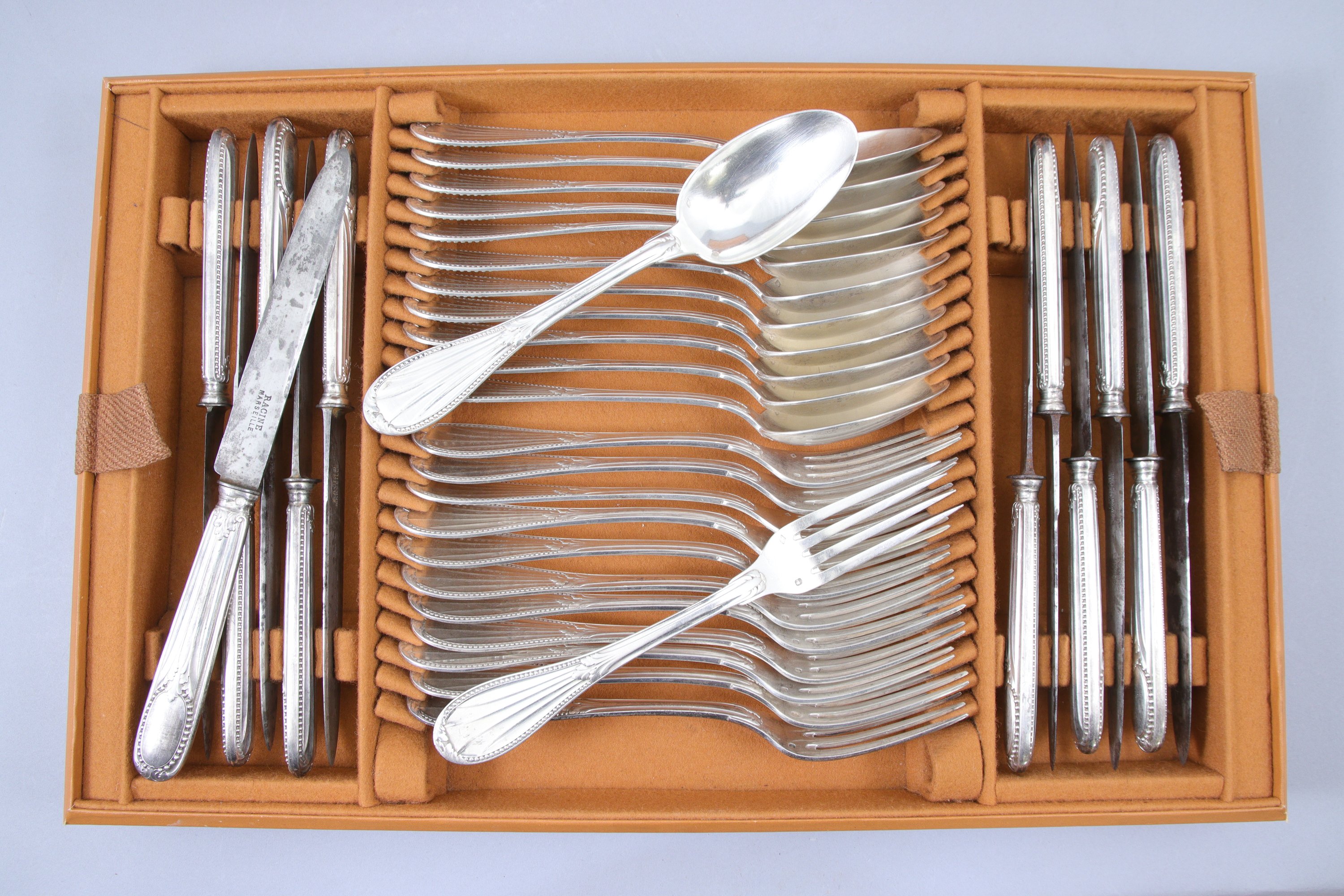 en argent, modèle à rangs de perles et médaillon comprenant : 12 couverts de table, 12 couteaux de table à lame acier et manche en argent fourré, 12 petits couteaux à fruits à lame en argent et manche en argent fourré, 12 petites cuillers, une louche, une cuiller à ragoût, un couteau de service, un couvert à servir la viande à manche en argent fourré et lame et dents en acier. Non monogrammée.