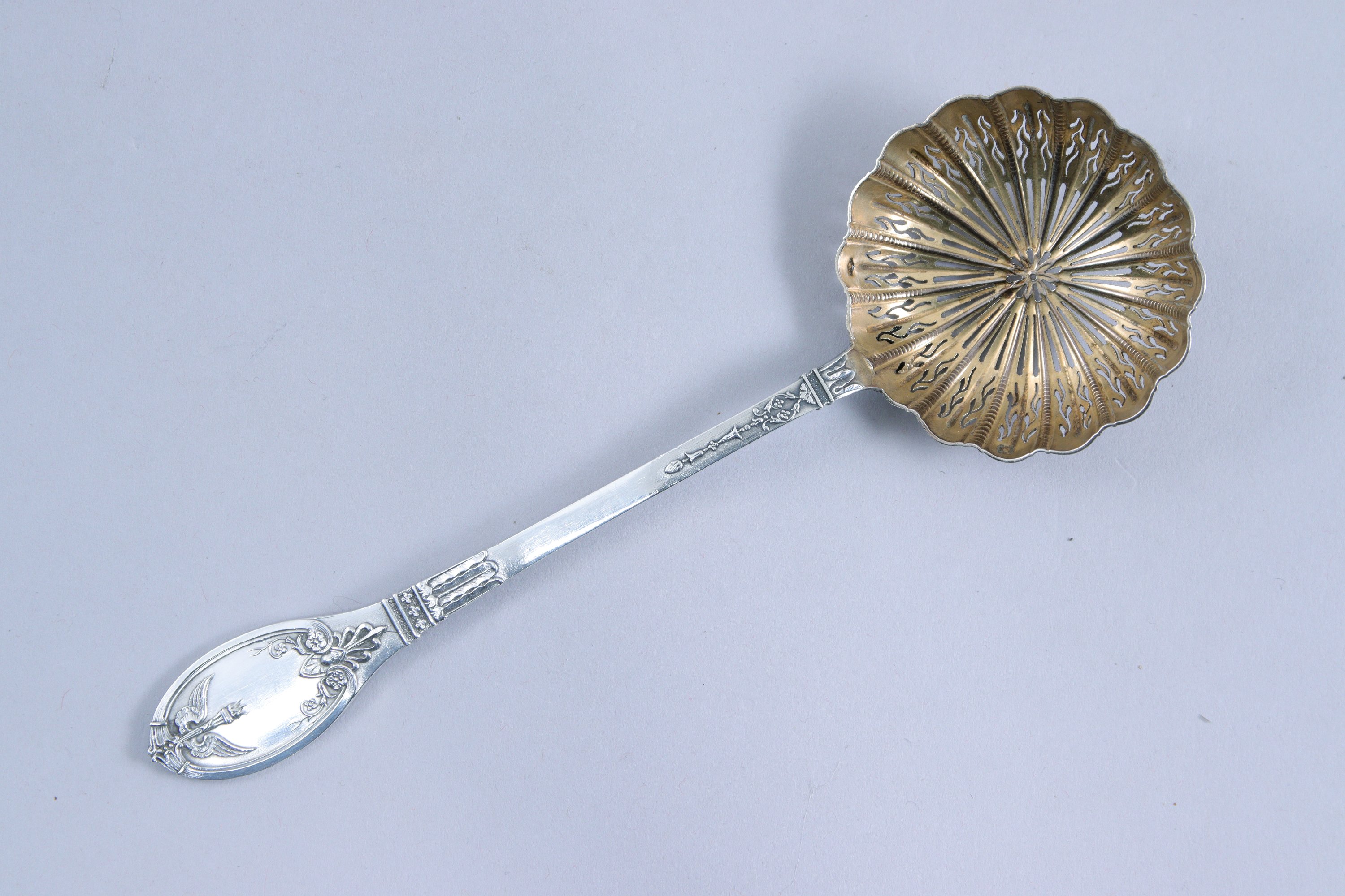 en argent, le cuilleron en vermeil. Le manche à décor de lambrequins, palmettes, cornes d'abondance et flambeau. Chiffré "IB".