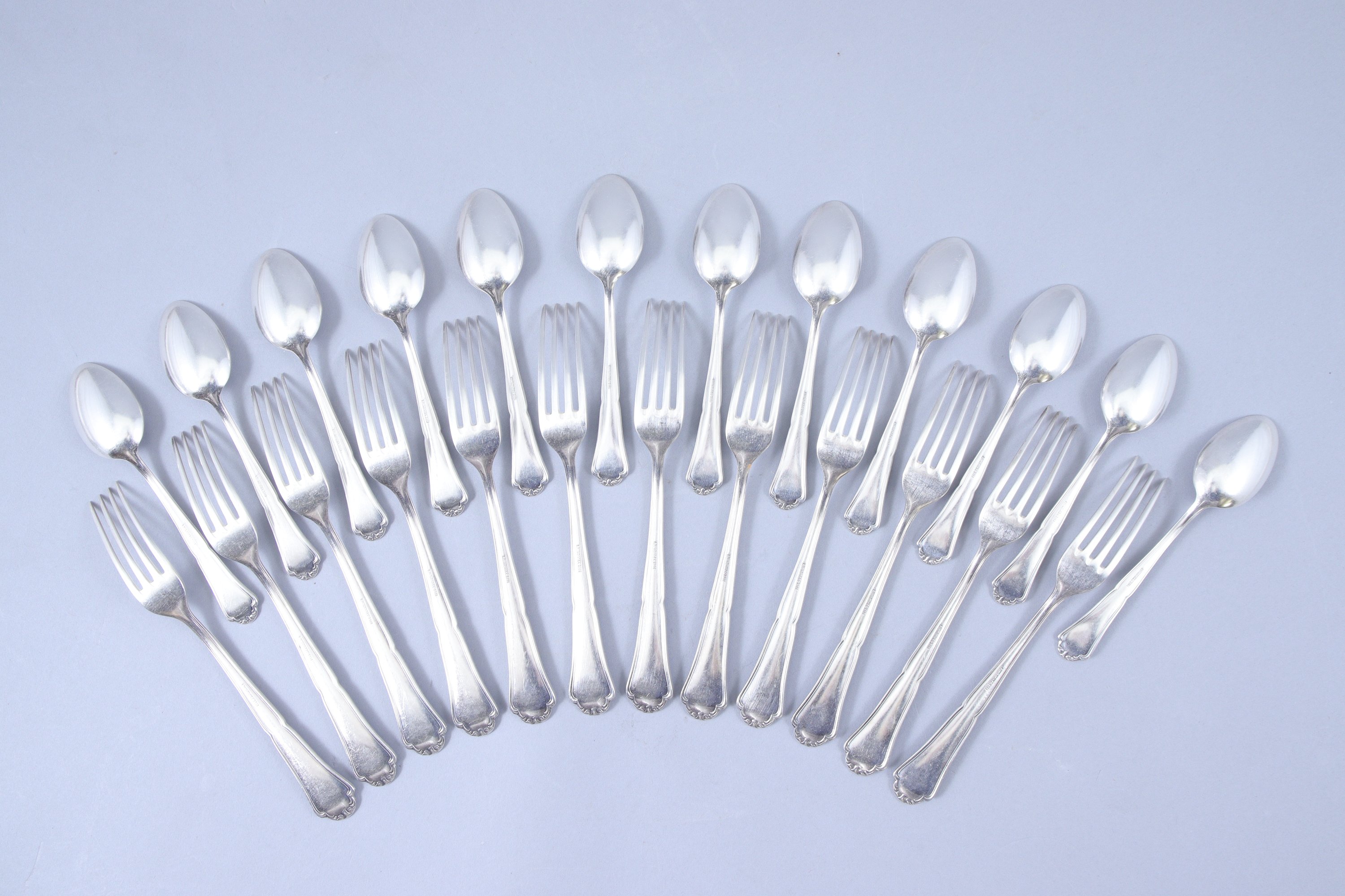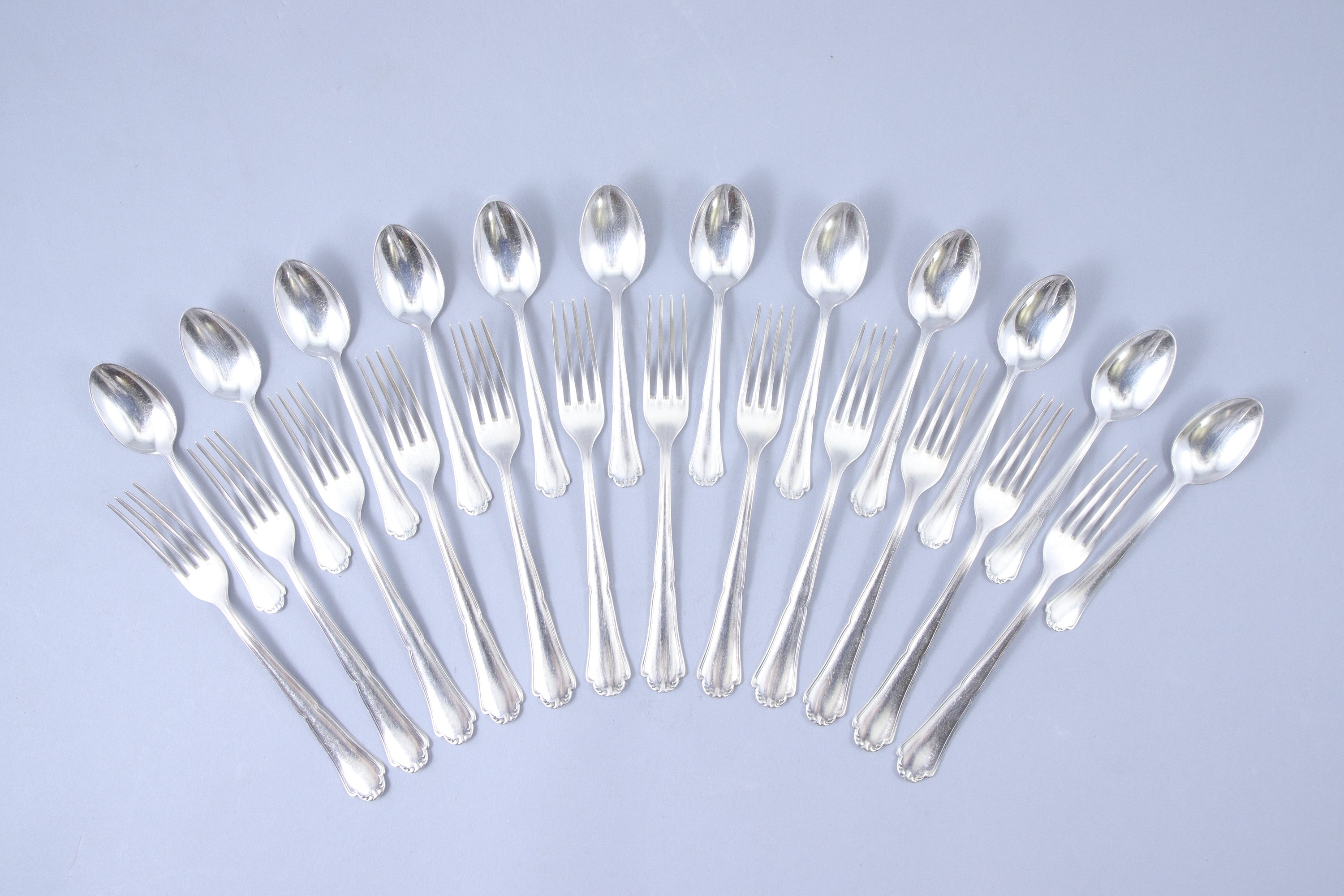 en argent 800 millièmes, modèle violonné à filet comprenant : 12 couverts de table, 11 couteaux de table à manche en argent fourré et lame en acier, 12 fouchettes à entremets, 12 couteaux à fromage à manche en argent fourré et lame en acier, 12 cuillers à café.