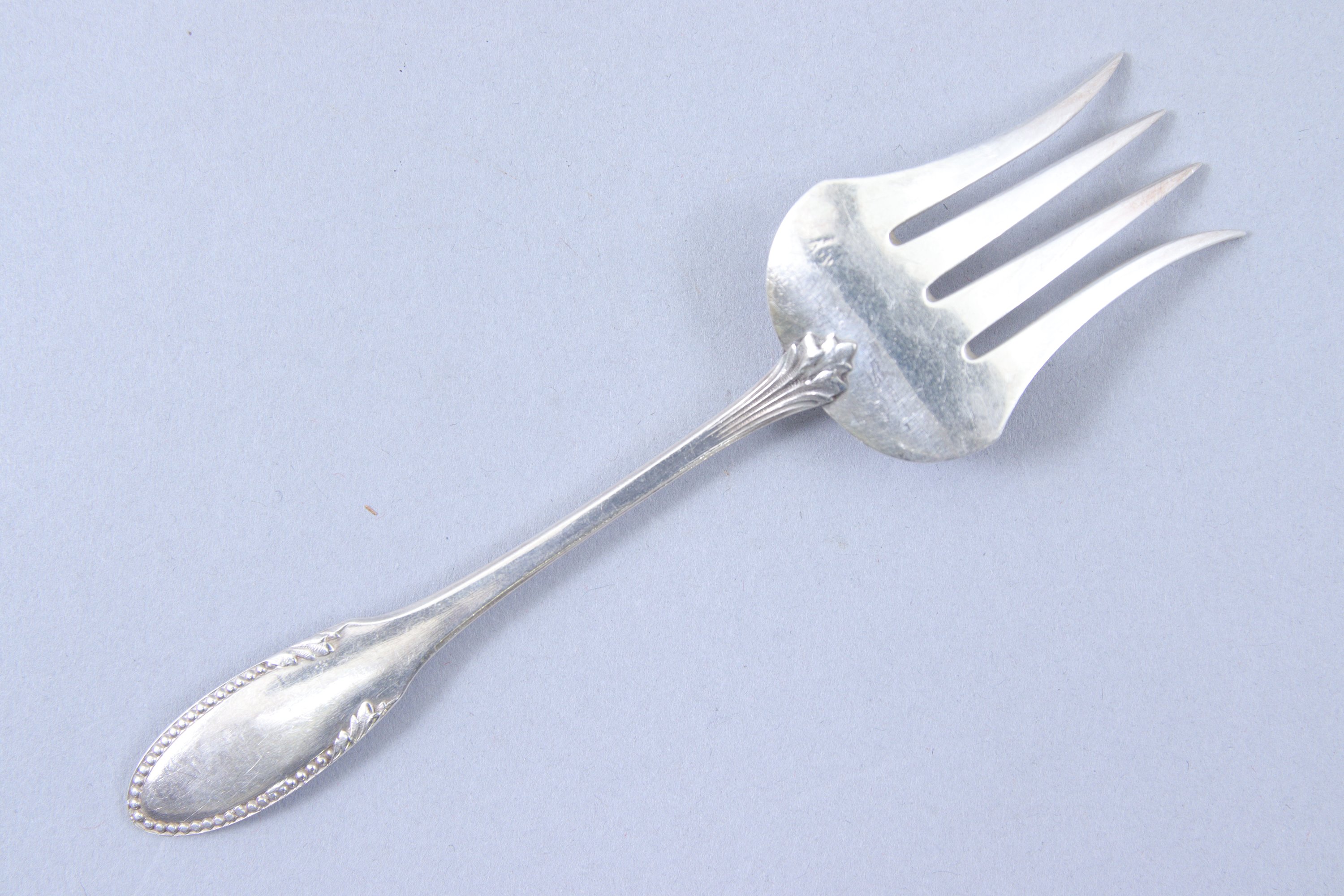 Jointe : une fourchette à hors d'oeuvre modèle "frise de perles" en argent. Poinçon Minerve 1er titre. Poids 23 g.