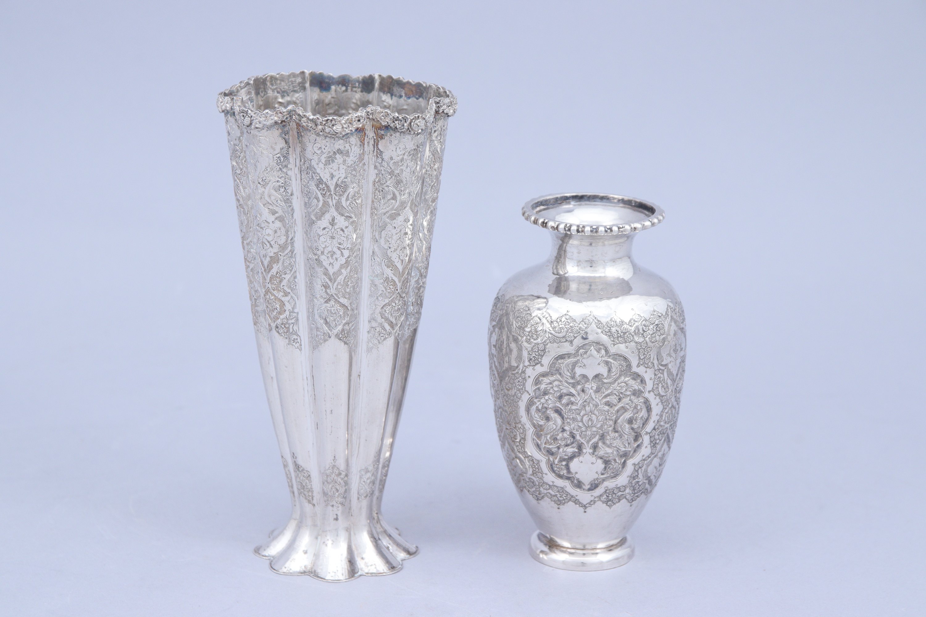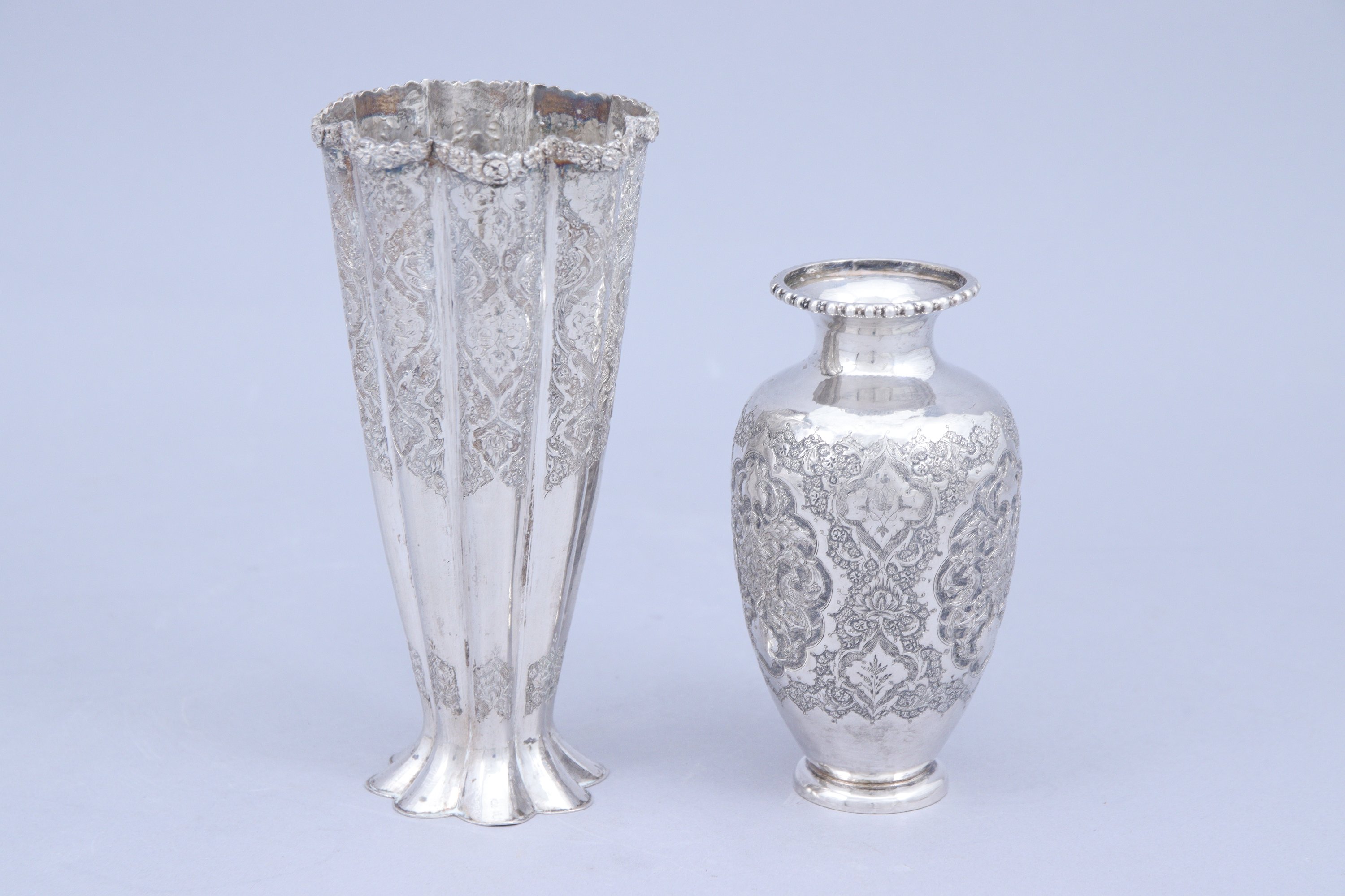 - Le premier de forme cornet, la lèvre soulignée d'une guirlande végétale, la panse à décor de rinceaux gravés. Haut. 16,8 cm. Poids 250 g.