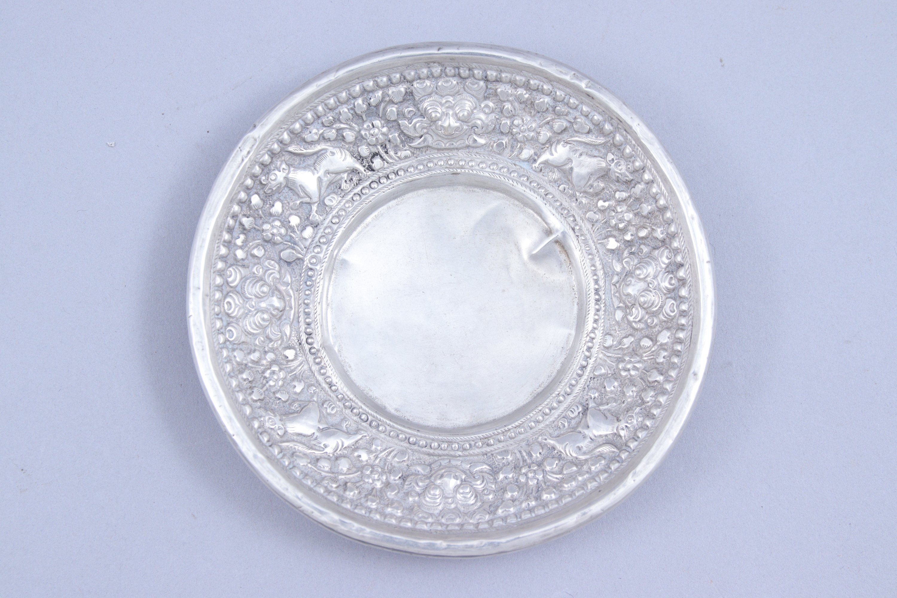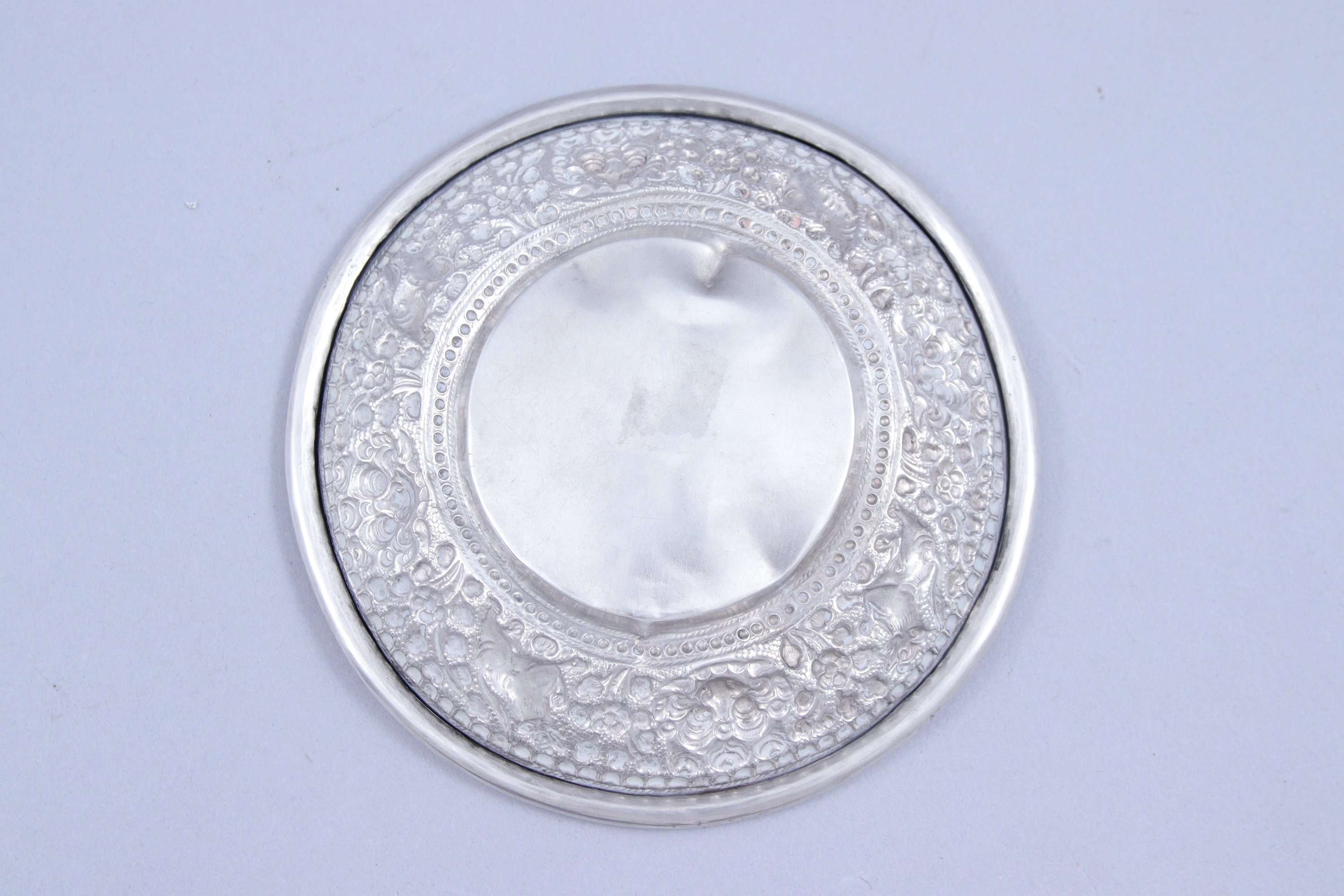 Jointe : coupe en métal à décor en repoussé de fauves dans un entourage végétal. Diam. 13,8 cm. (enfoncements et déformations).